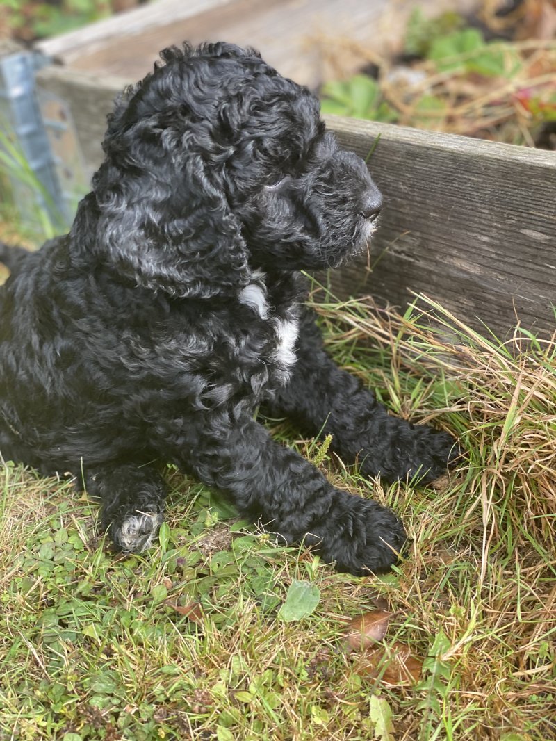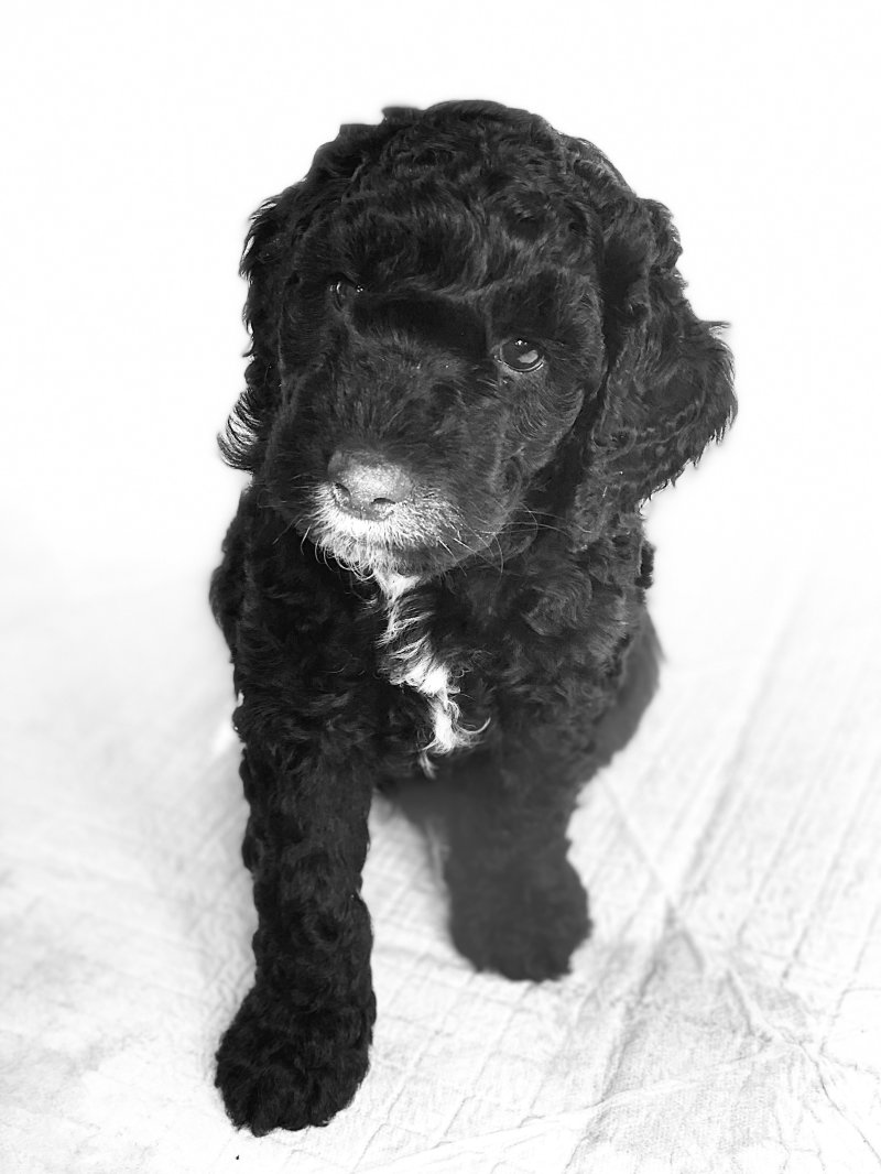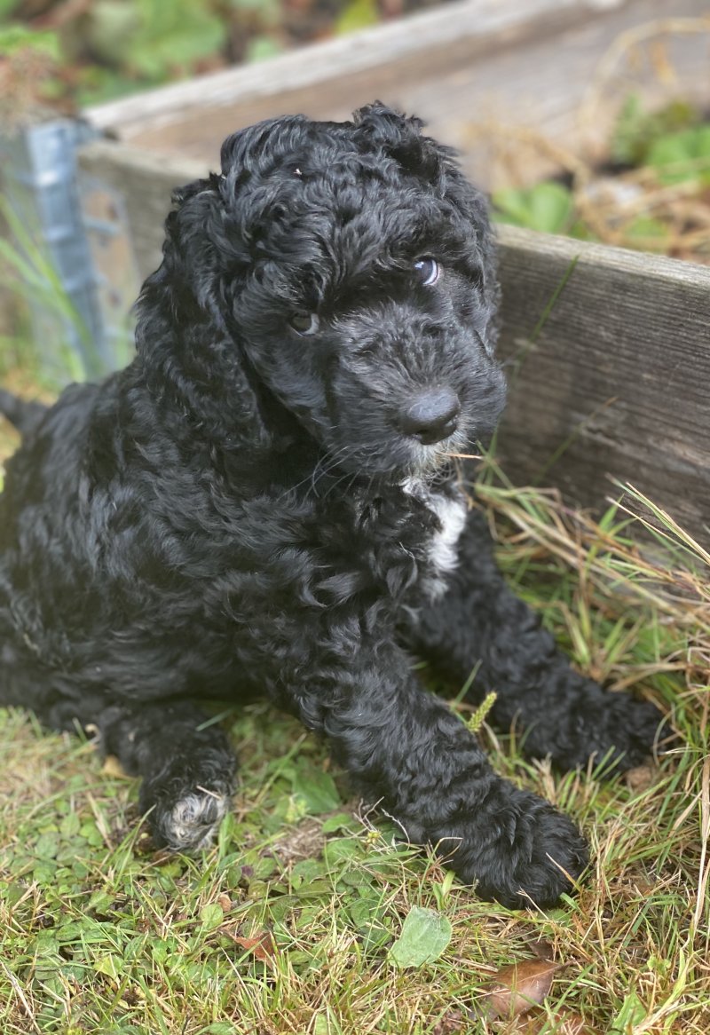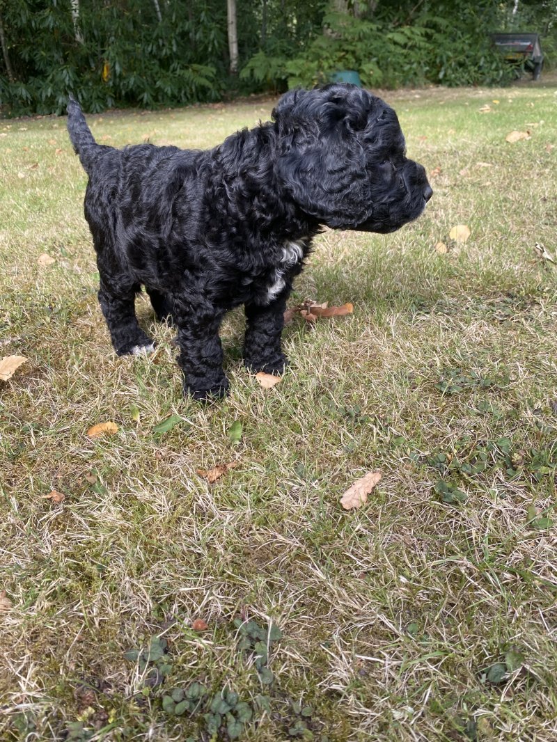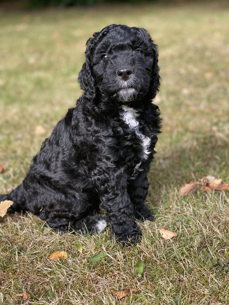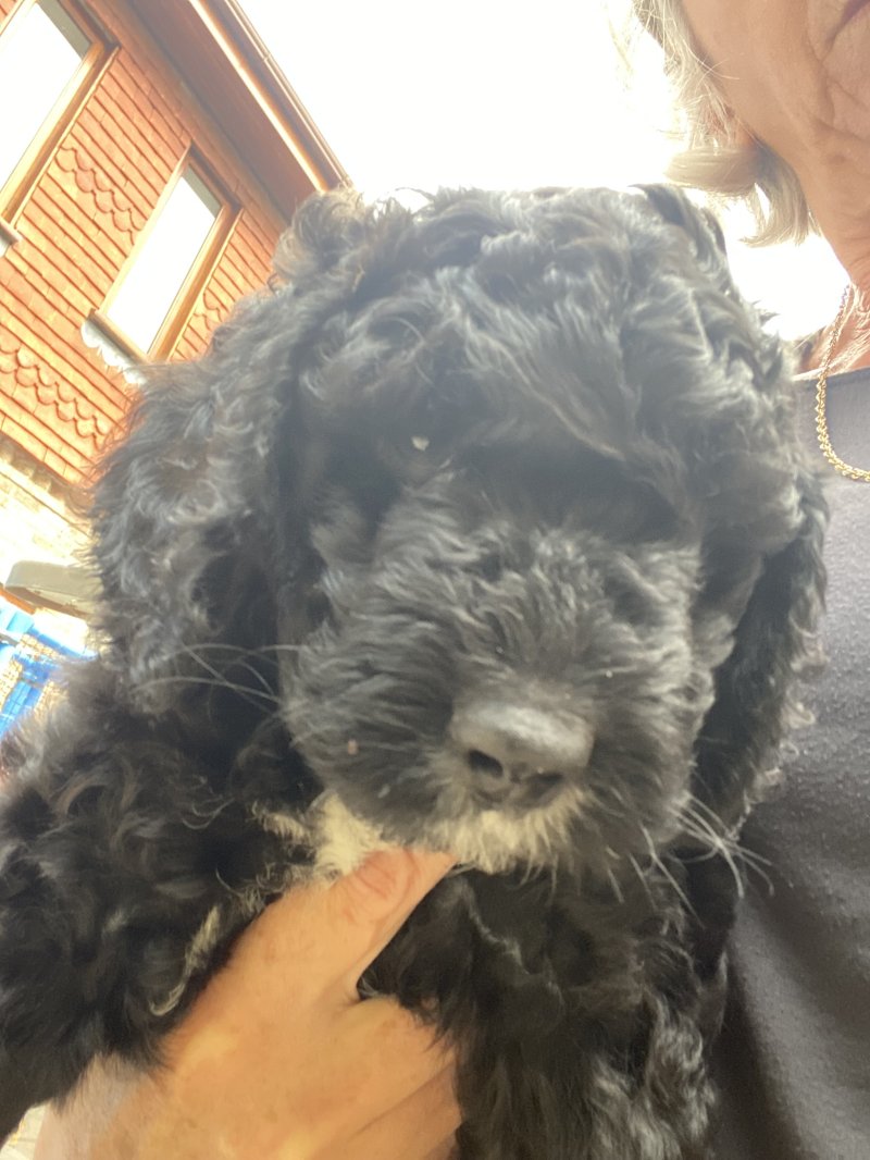 He is a fabulous boy - black soft curl coat with white chest and hind paws. Loves a cuddle and very playful ❤️