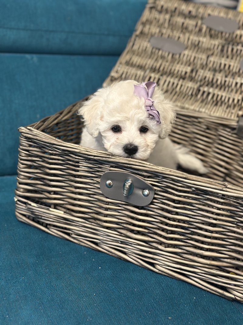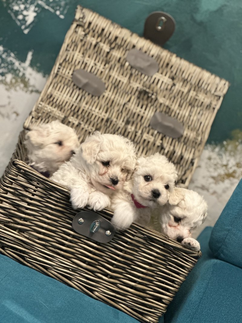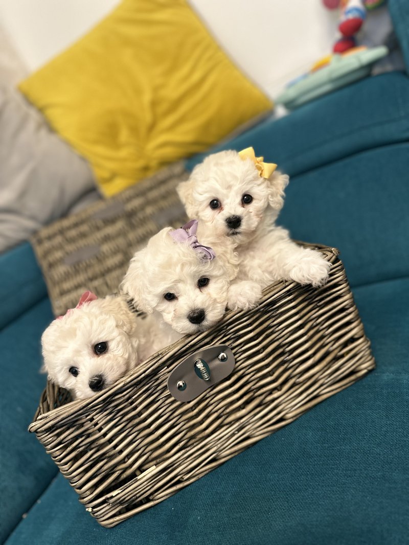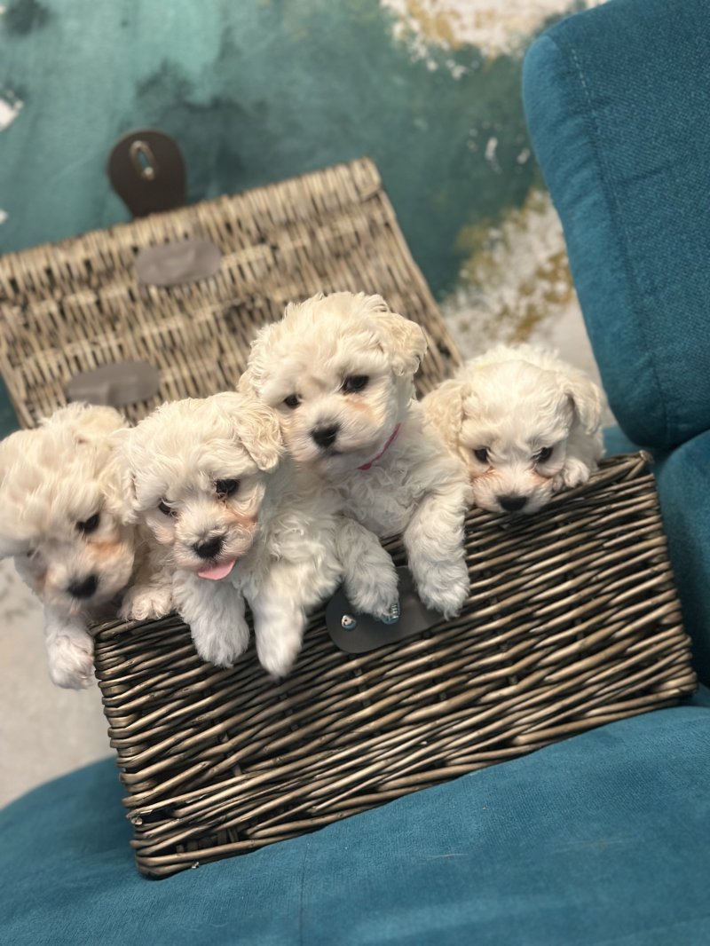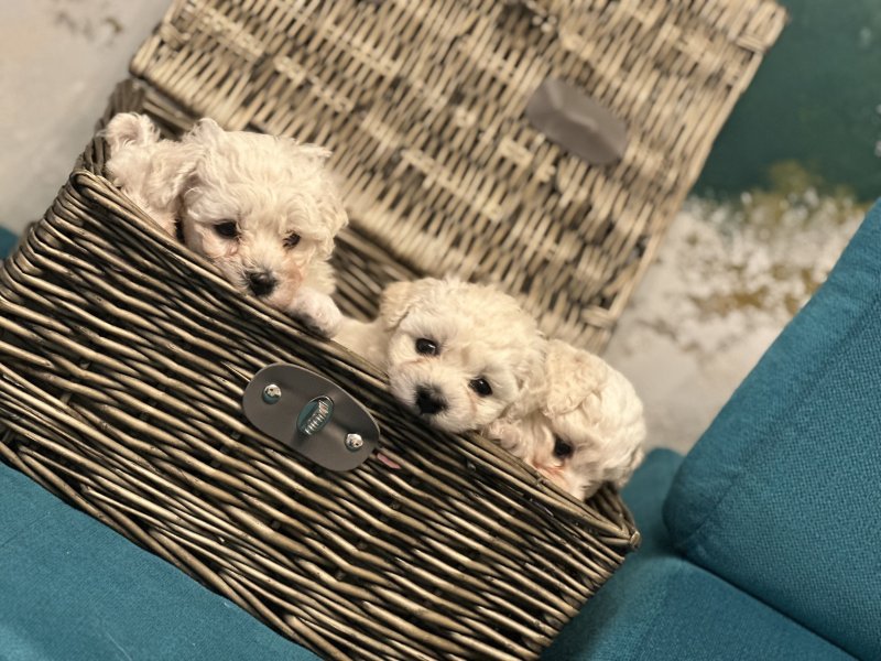 We are proud to present our stunning litter of Bichon Frisé puppies – Our Alma delivered 3 girls and 1 boy, born on 30th September 2025 from exceptional parents with outstanding champion pedigrees.