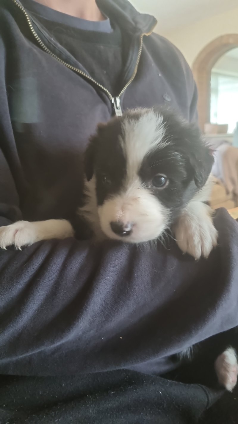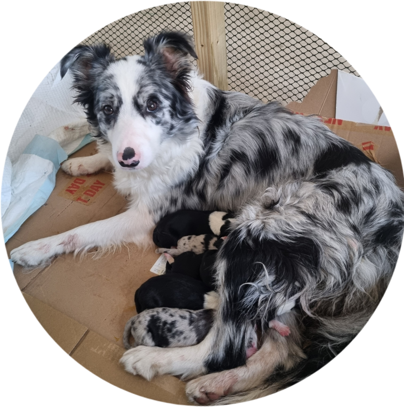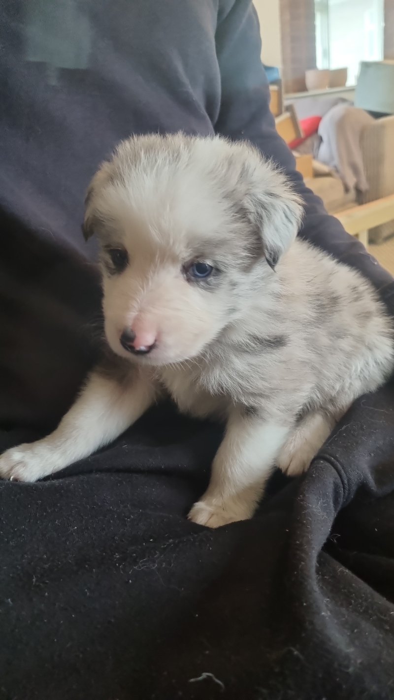 Our beautiful KC registered blue merle has just had 6 puppies with a gorgeous KC registered red and white. Both have a great temperament, dad is a working dog. Our bitch is great with children, other dogs and wheelchair users, she was short listed to become an assistant dog and will go back in to training when fit after puppies have gone. She is a great family pet. The puppies will be ready to leave beginning of November. There is 1 boy merle and 1 girl merle. 3 black and white boys and 1 black and white girl.
