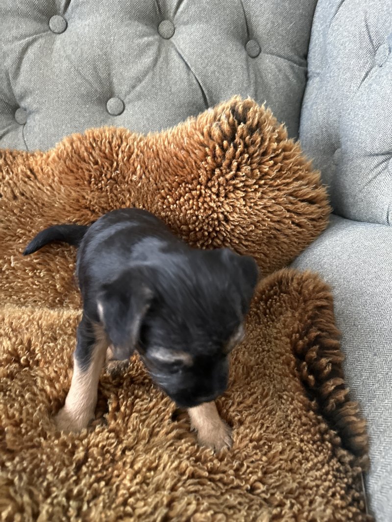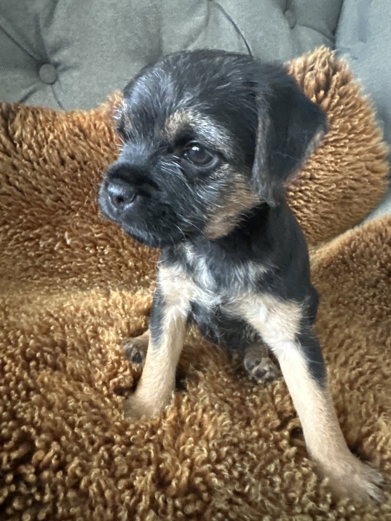 We have a beautiful KC (Kennel Club) registered Border Terrier puppy available — a lovely blue and tan female with a wonderful temperament and excellent breeding lines.