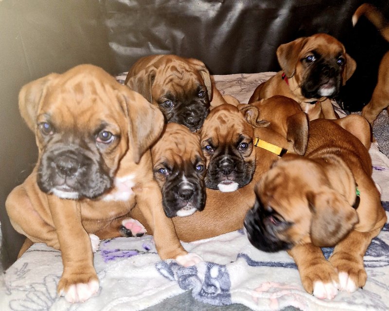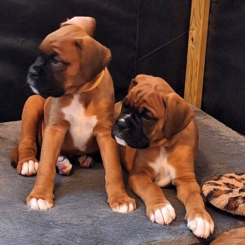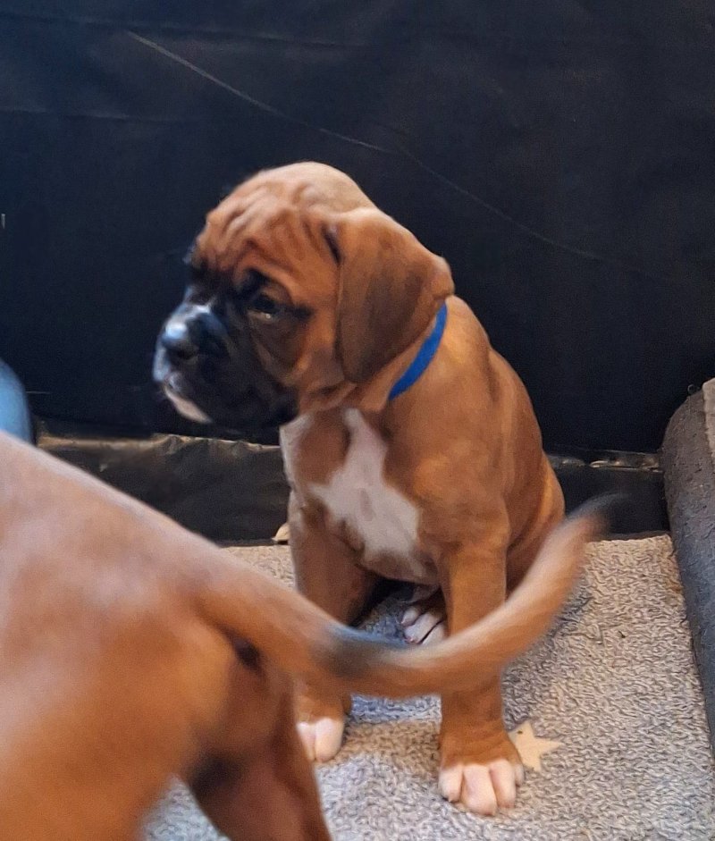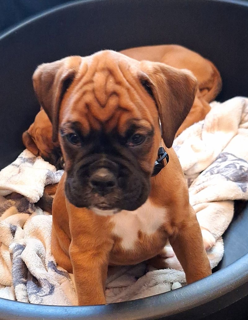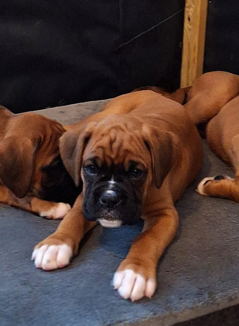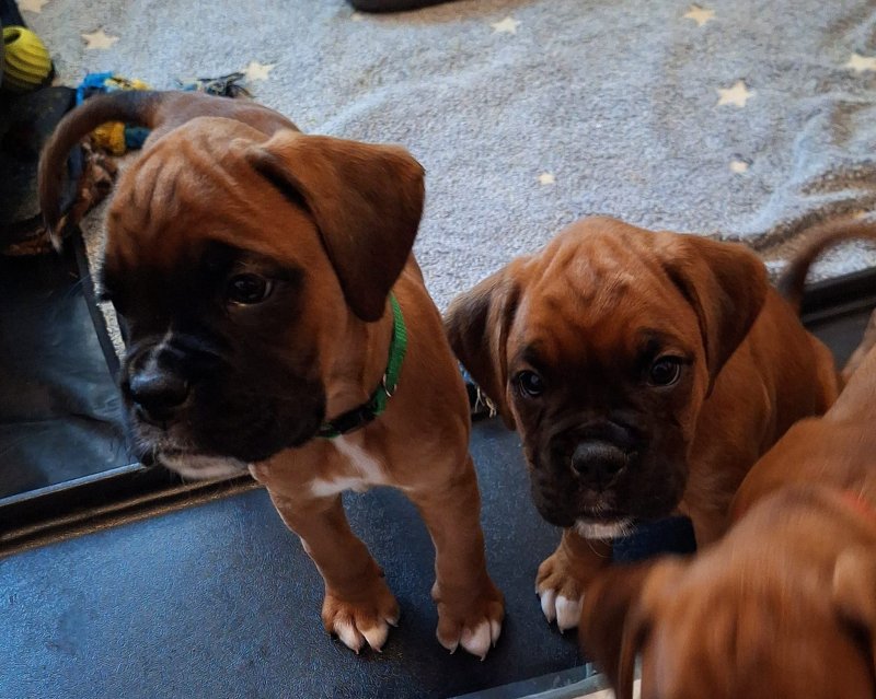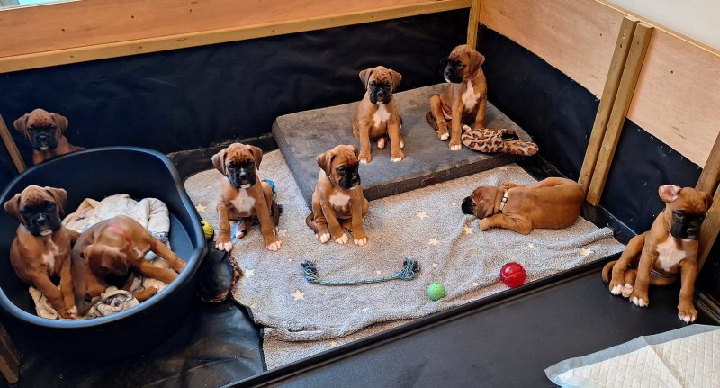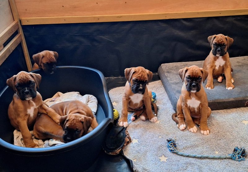Viewings & Reservations Being Taken Now Send me a an inbox message or call 07763 472 250 to arrange a viewing Our beautiful family Boxer has given birth to a stunning and healthy litter, born on 24th July 2025, and now ready to be reserved for their forever loving homes and can leave from the 18th September. They will be microchiped, wormed and had their first vaccination. Both mum and dad are fully Kennel Club registered and have been raised in loving family homes with children. They both have wonderful temperaments, exceptional health, athletic builds, and strong bloodlines. The puppies are being lovingly raised in a busy household environment, surrounded by children and the natural sounds of everyday family life. This ensures they are already well-socialised, confident, affectionate, playful, and full of energy. We have 6 beautiful girls and 3 handsome boys, each with striking full black masks, rich deep-red coats, and perfectly balanced white markings on their chests and feet. They are showing athletic frames, sturdy builds, and lively spirits, making them an excellent example of the Boxer breed. Their markings are elegant, eye-catching, and truly classic, with personalities that are loyal, intelligent, and fun-loving. Mum will be available to meet during viewings, and pictures, along with the Kennel Club name and stud number of Dad, will also be available.