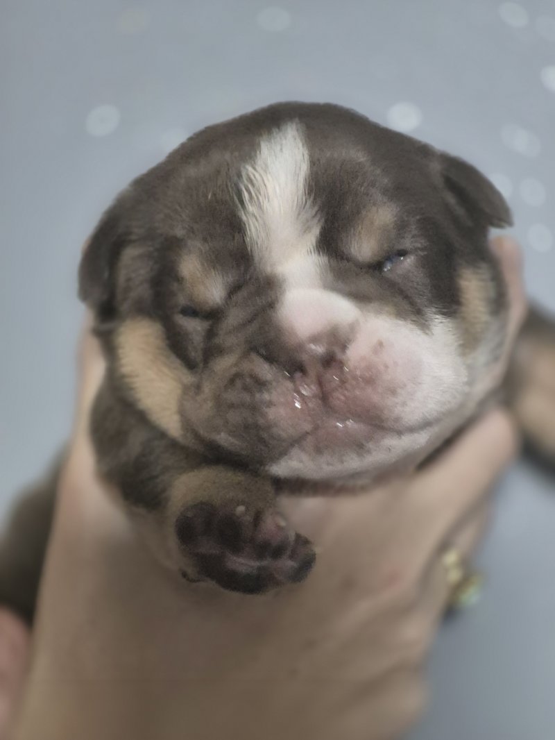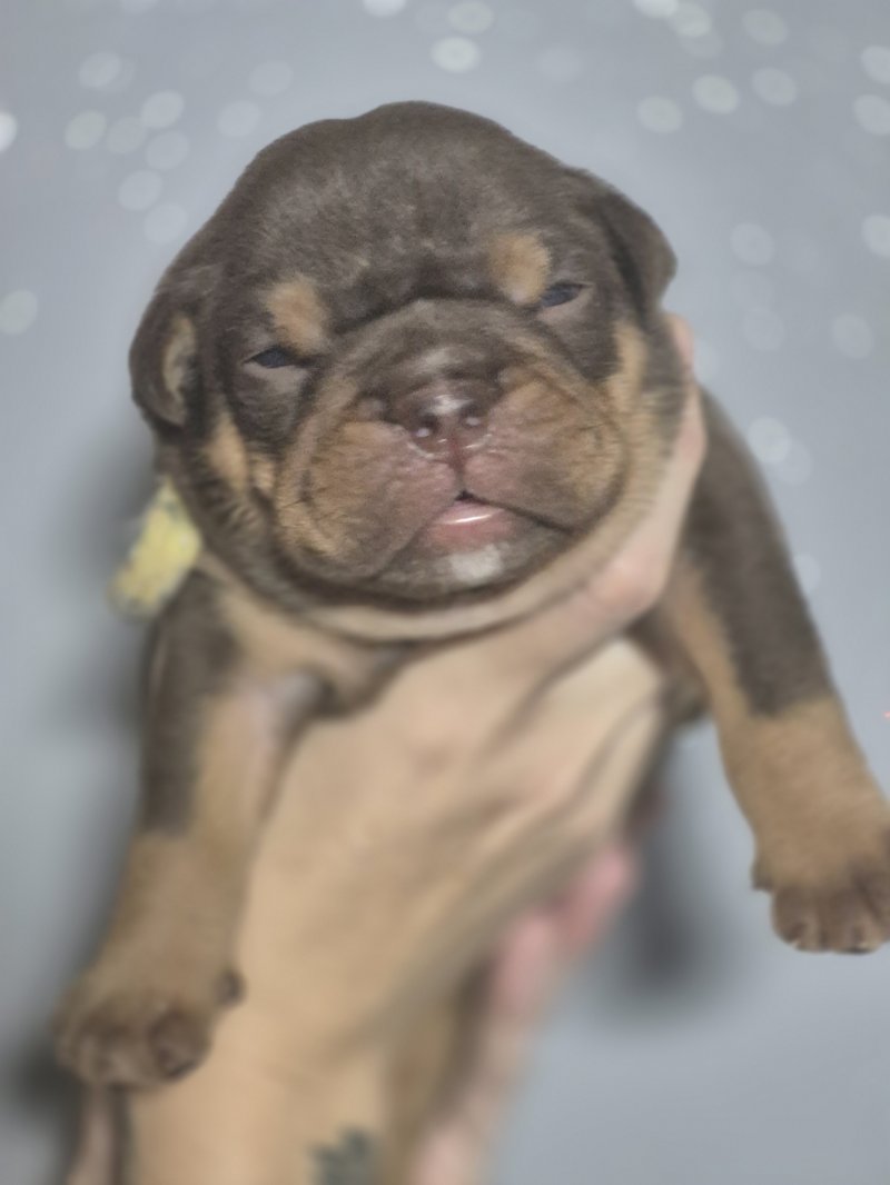 Arry Our Boy, The Father Of The Pups Who Is A English Chocolate Merle Bulldog. Son Of Broski (Supreme Bloodlines Scotland) x Peggy (Doxies Bullies) Orbit Son & Nemesis Daughter.