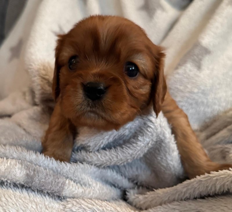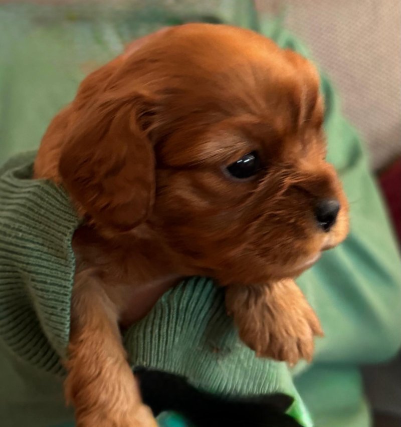 Rudie is a stunning Ruby Cavalier and came to our family from a professional home breeder from a litter of two chunky puppies.