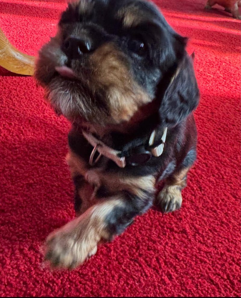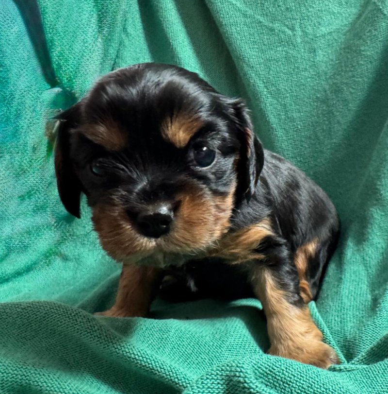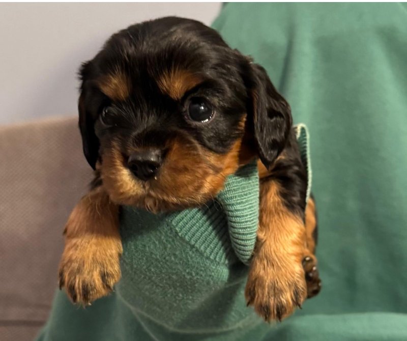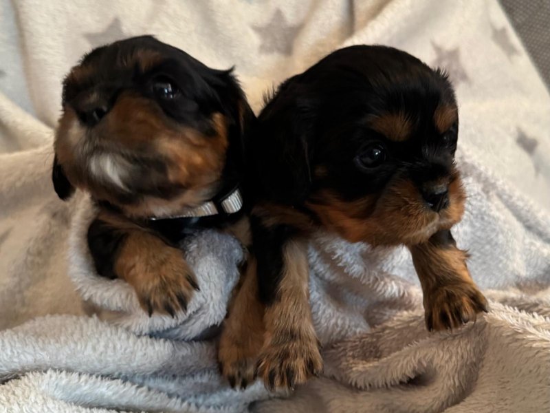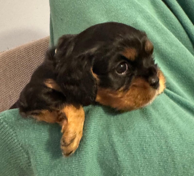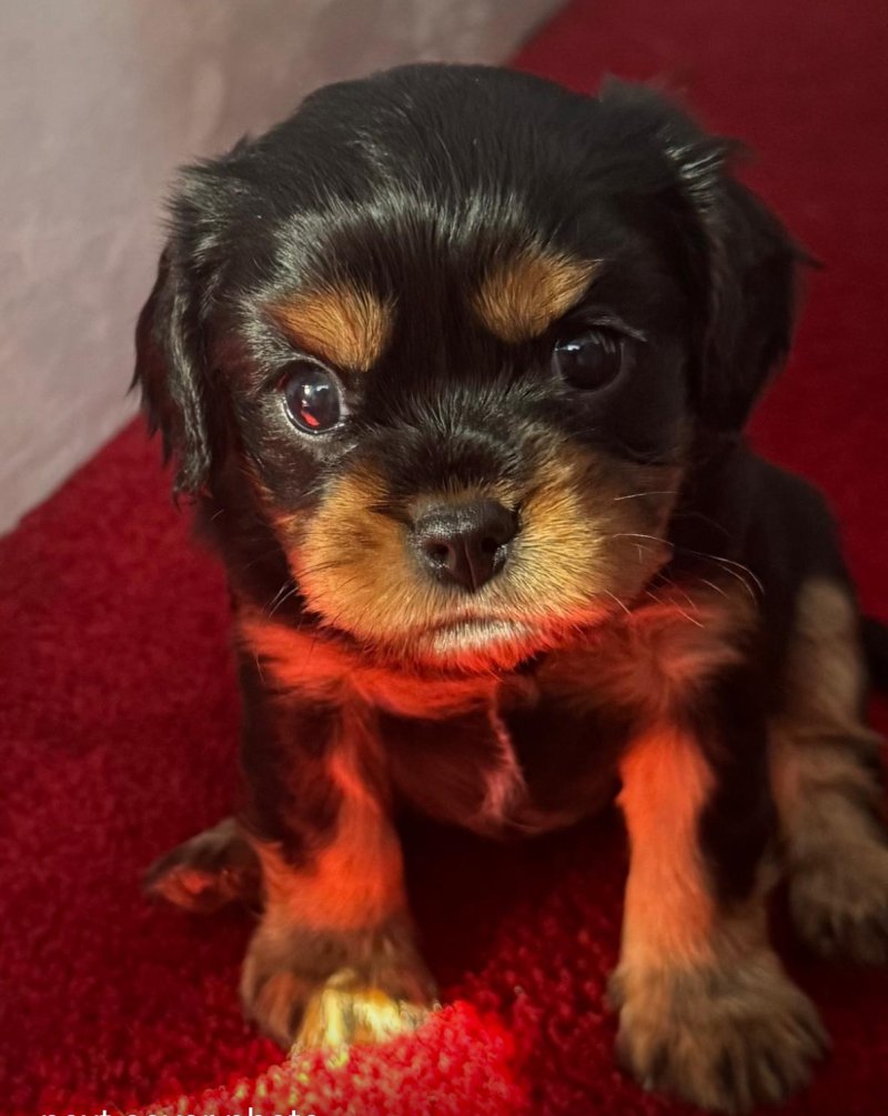 Chipps is an elegant black and tan Cavalier and one of two girls born from a litter of four healthy black and tan puppies and has lived with her identical sister since birth. She is non-KC registered and named Kiki Chipps- DNA tested to have a 100% King Charles Cavalier pedigree with both mother and father having a minimum five-generation pedigree. She has been DNA health tested by Wisdom panel to have no risk of genetic conditions and no risk of any notable genetic variants – 29 clear: