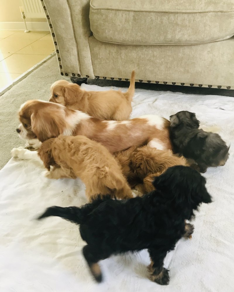 We have a beautiful litter of Cavapoo puppies mum is are family pet dad was a miniature poodle stud all puppies are microchip wormed and fleed for eny more information please let us know