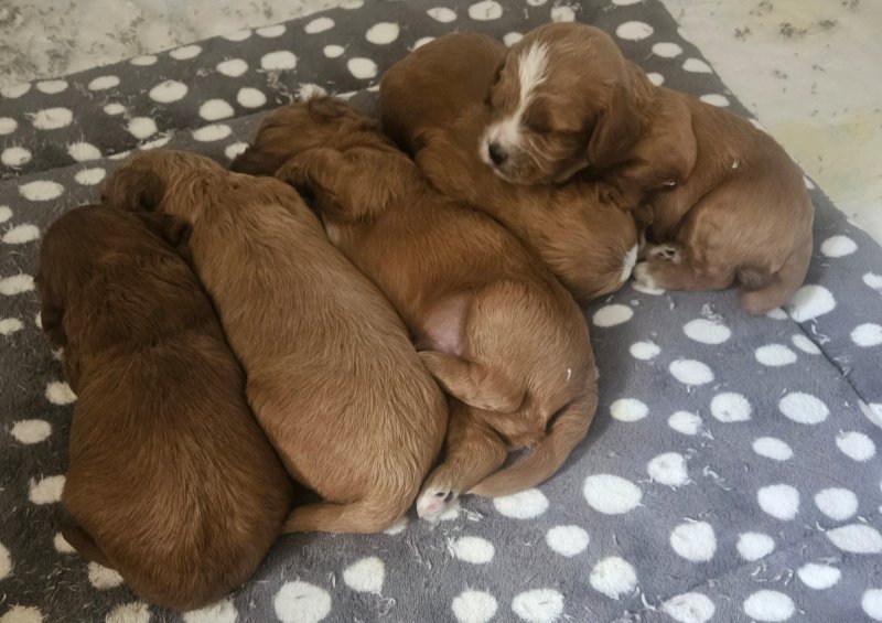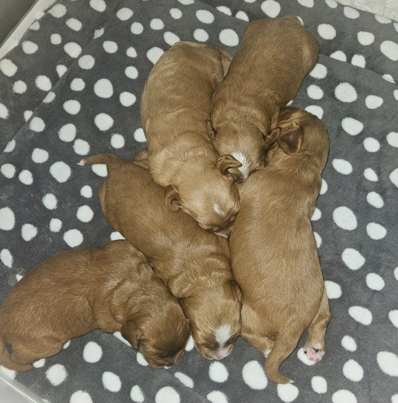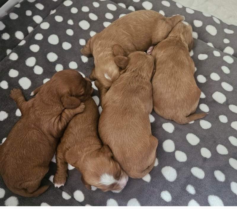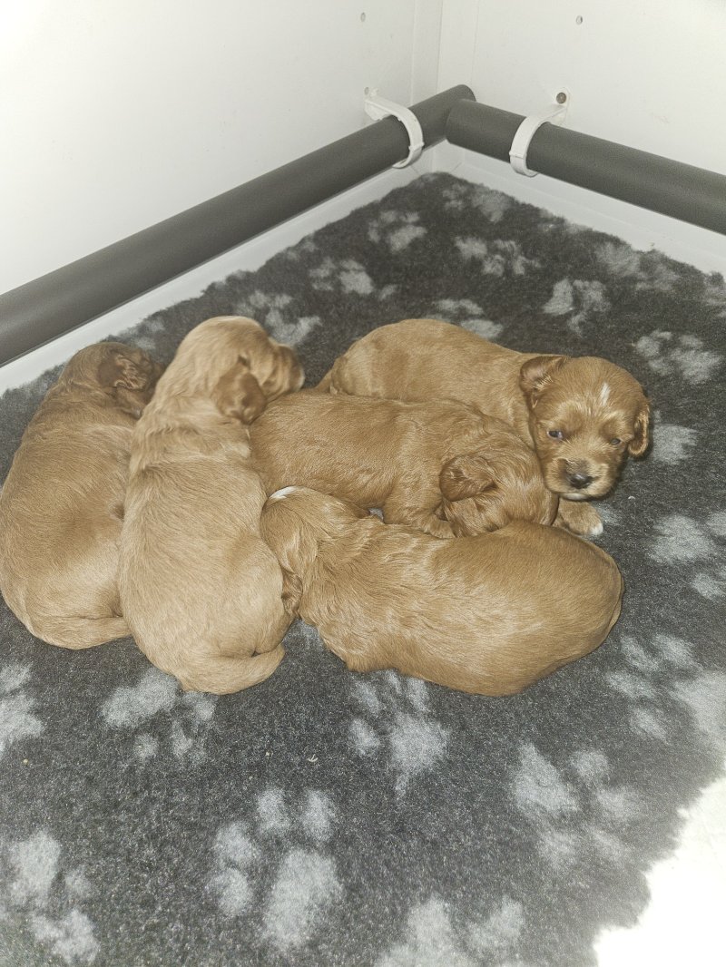 Welcome to my advert. Our two year old cavapoo gave birth on the 21st of September to five adorable babies, three boys and two girls. Dad is Health tested/ DNA tested, KC reg Toy Poodle. All puppies are being raised in our hygienically clean family home. All puppies will be health checked, microchipped, fully wormed and will have had their first vaccination before leaving on the 20th of November which at this date will be eights weeks old. They will also leave with a puppy blanket and small bag of Royal Canine what they all be weened on. A non refundable deposit of three hundred pounds will secure your new family member.