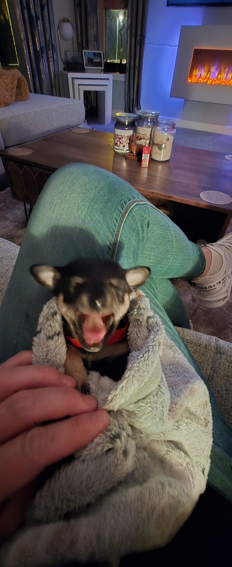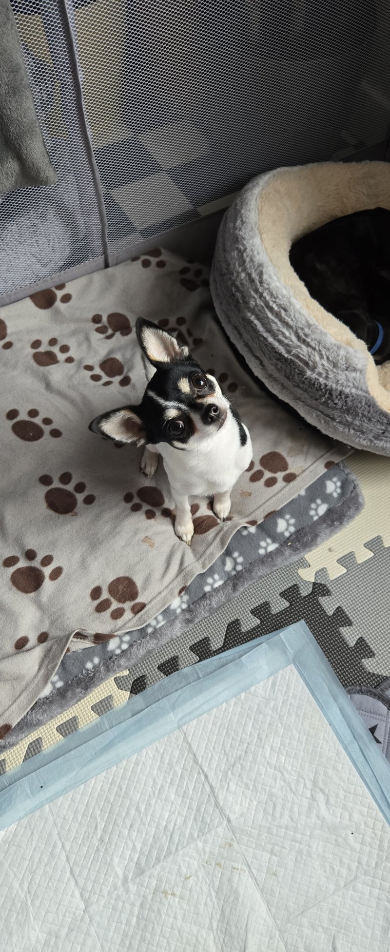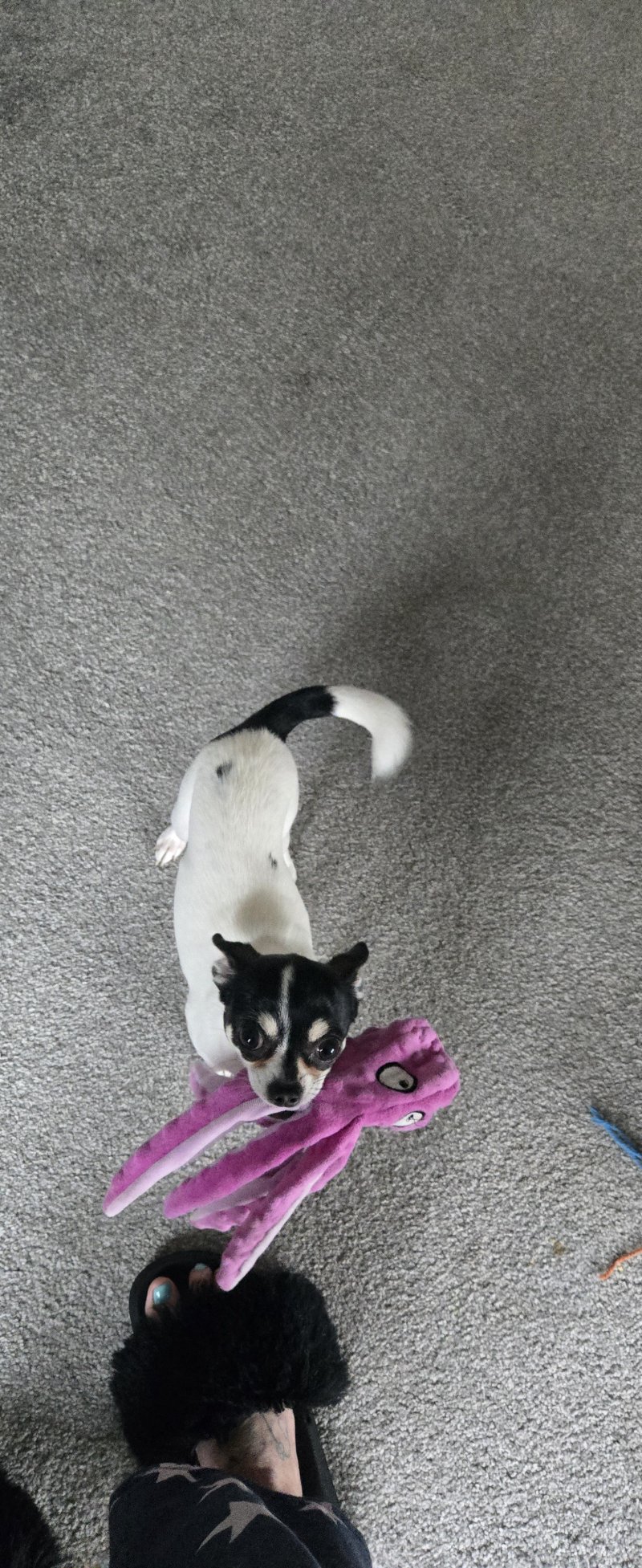 Dad is a 1 year old, white tri colour, apple dome, pure bread chihuahua. He is tiny, the happiest wee dog I've ever had. Always wagging his tail and just loves attention and cuddles.