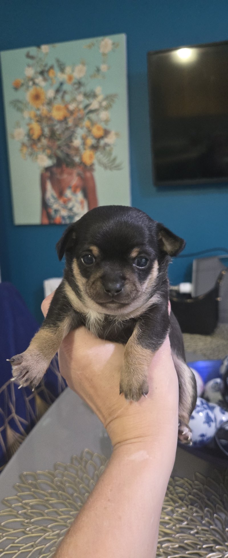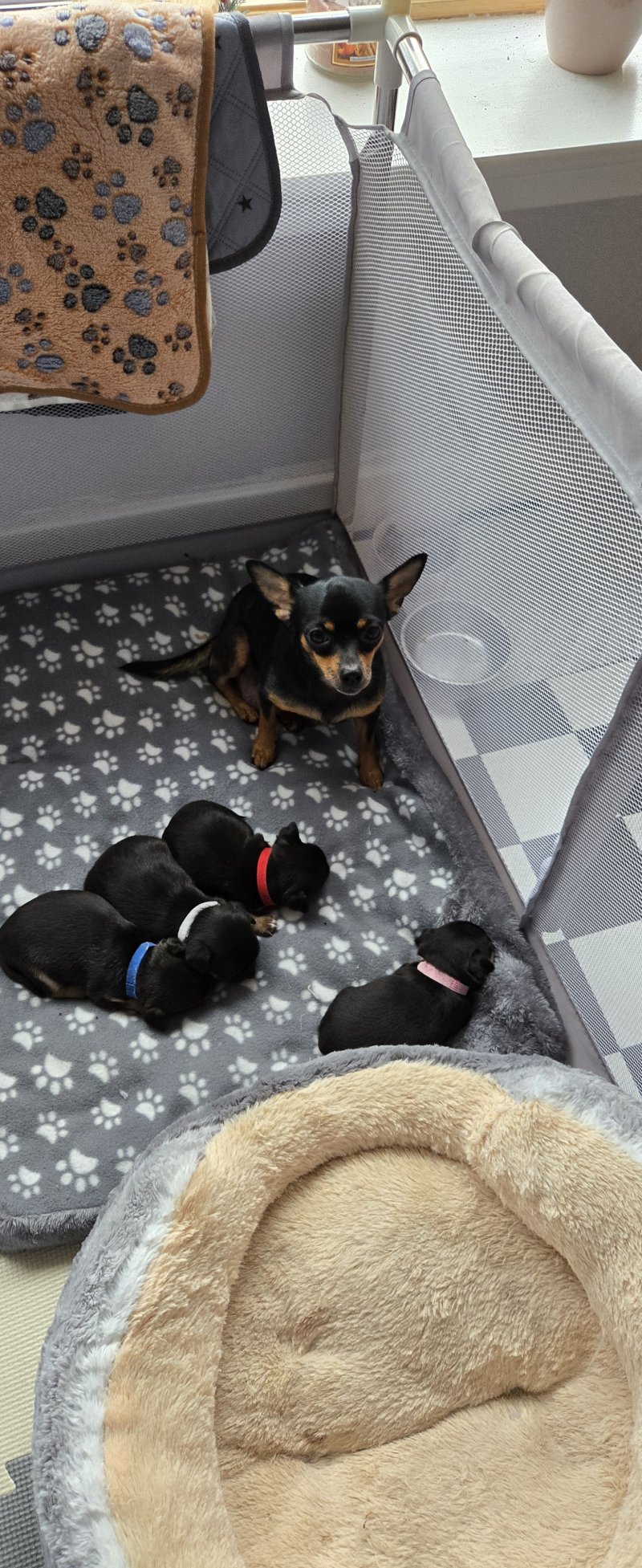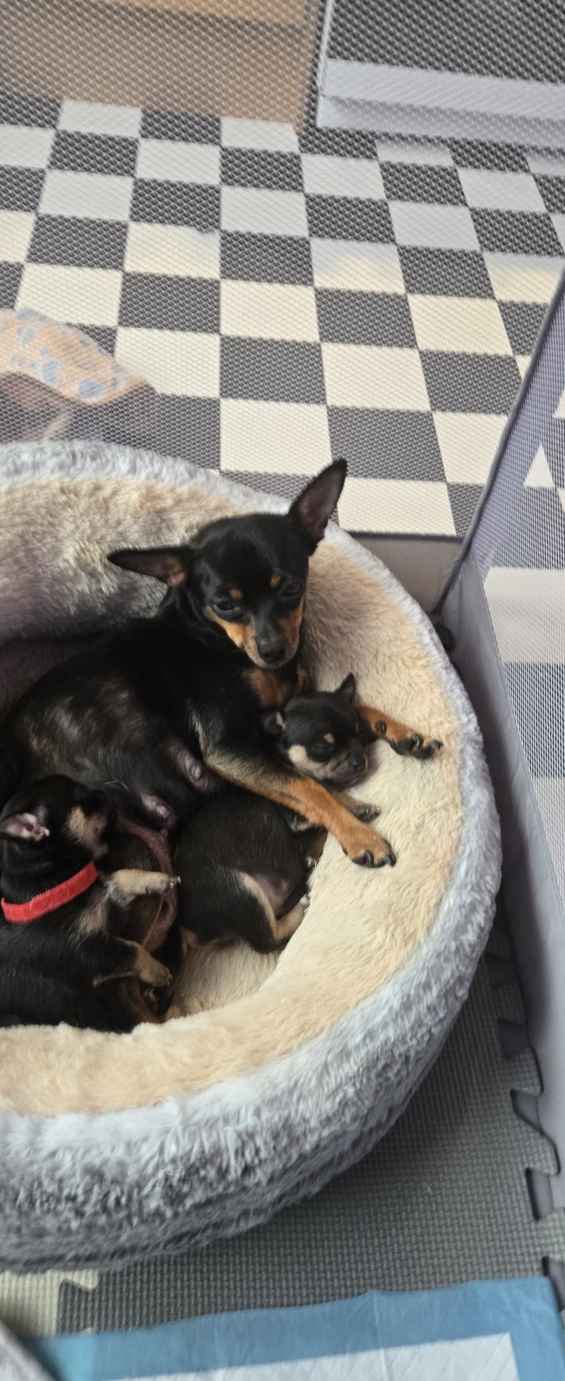 Mum is a 4 year old tri colour, deer head pure bred chihuahua. This is her first litter. She is an amazing mum. Very affectionate and loyal.