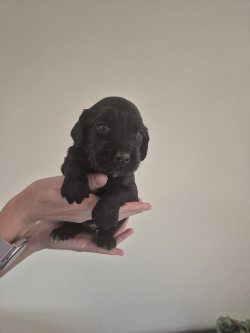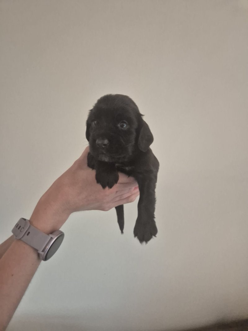 I have 3 black working cocker spaniel puppies still available, 2 boys and 1 girl, all have some white on their chest. Also have 1 red boy available.