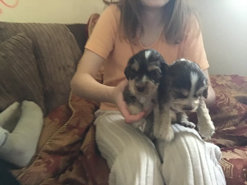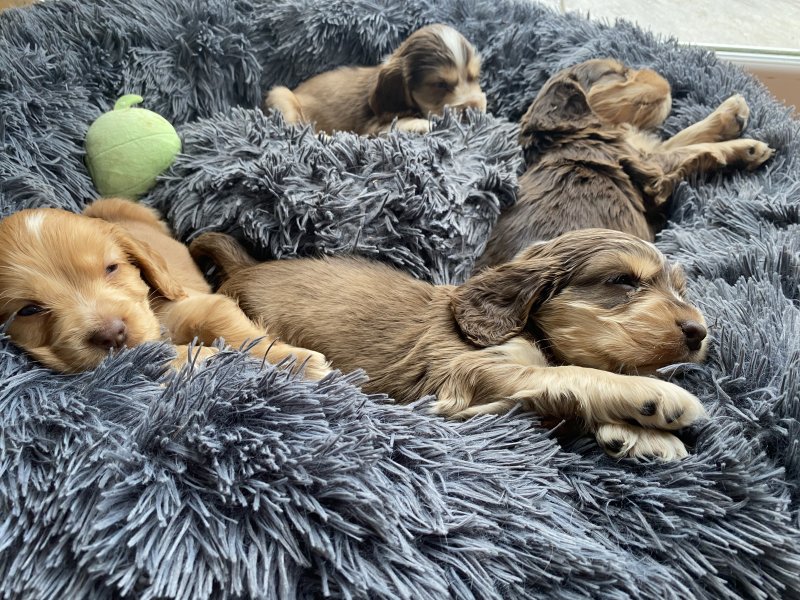 4 boys , 1 golden with white mark , 3 chocolate tan &white markings