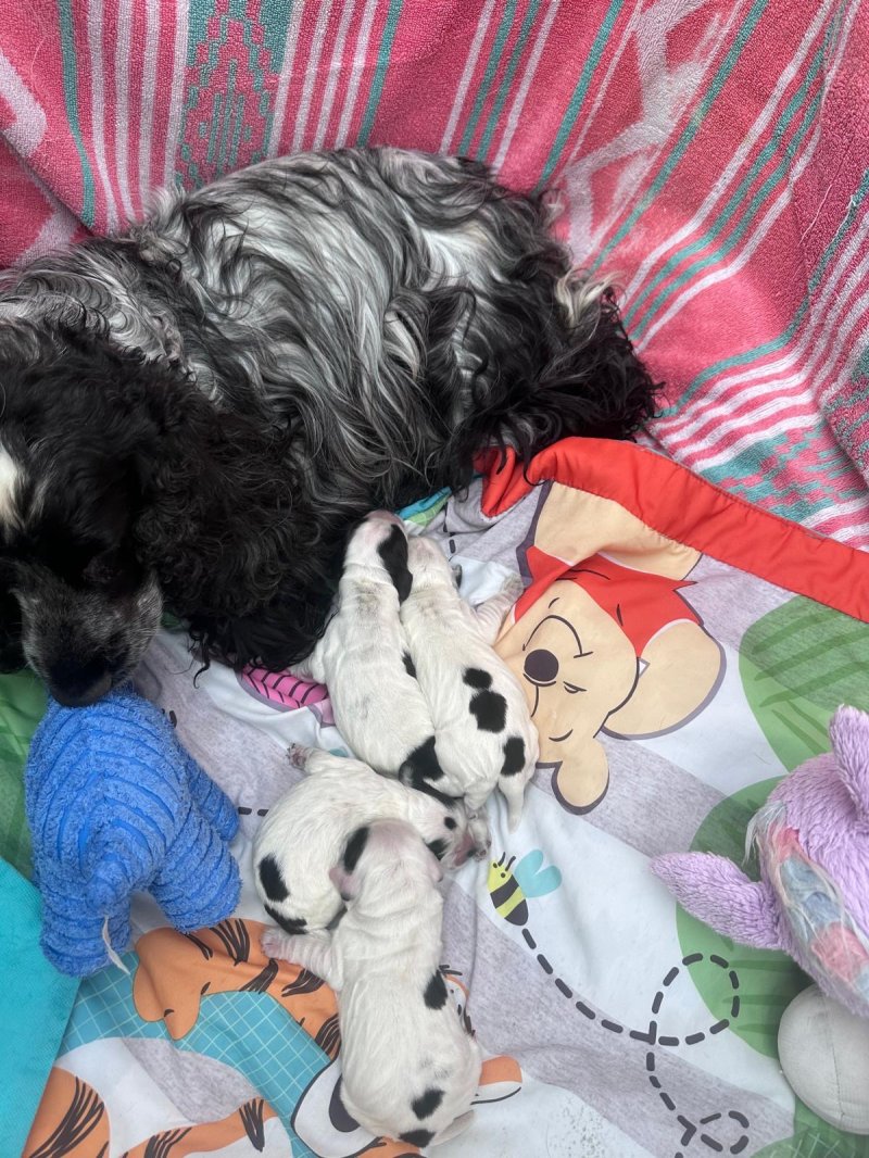 They have blessed us with 4 beautiful blue roan puppies — 1 handsome boy and 3 adorable girls.