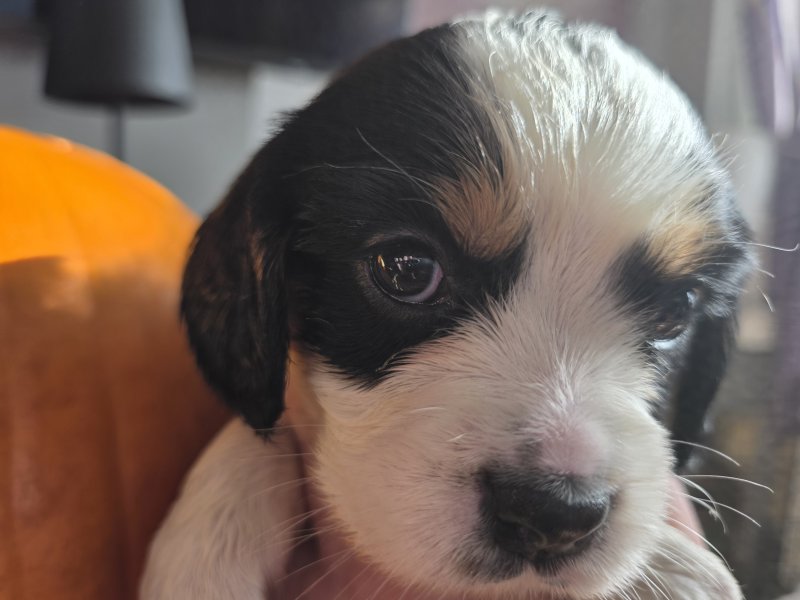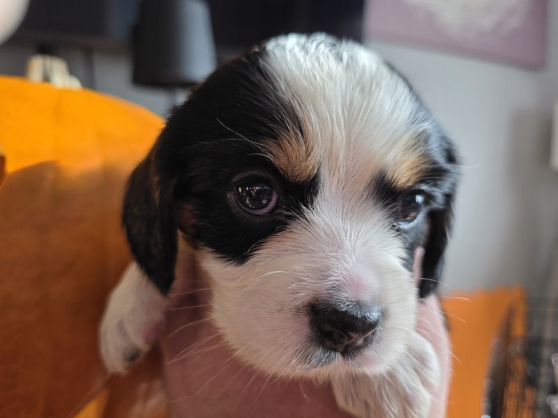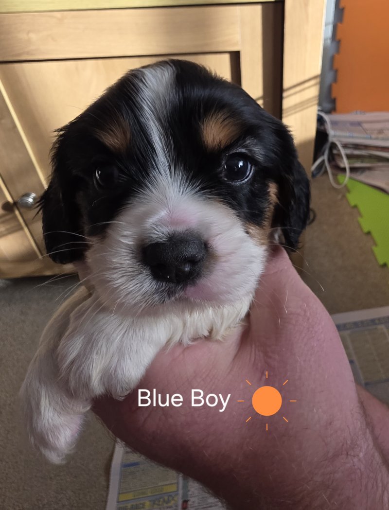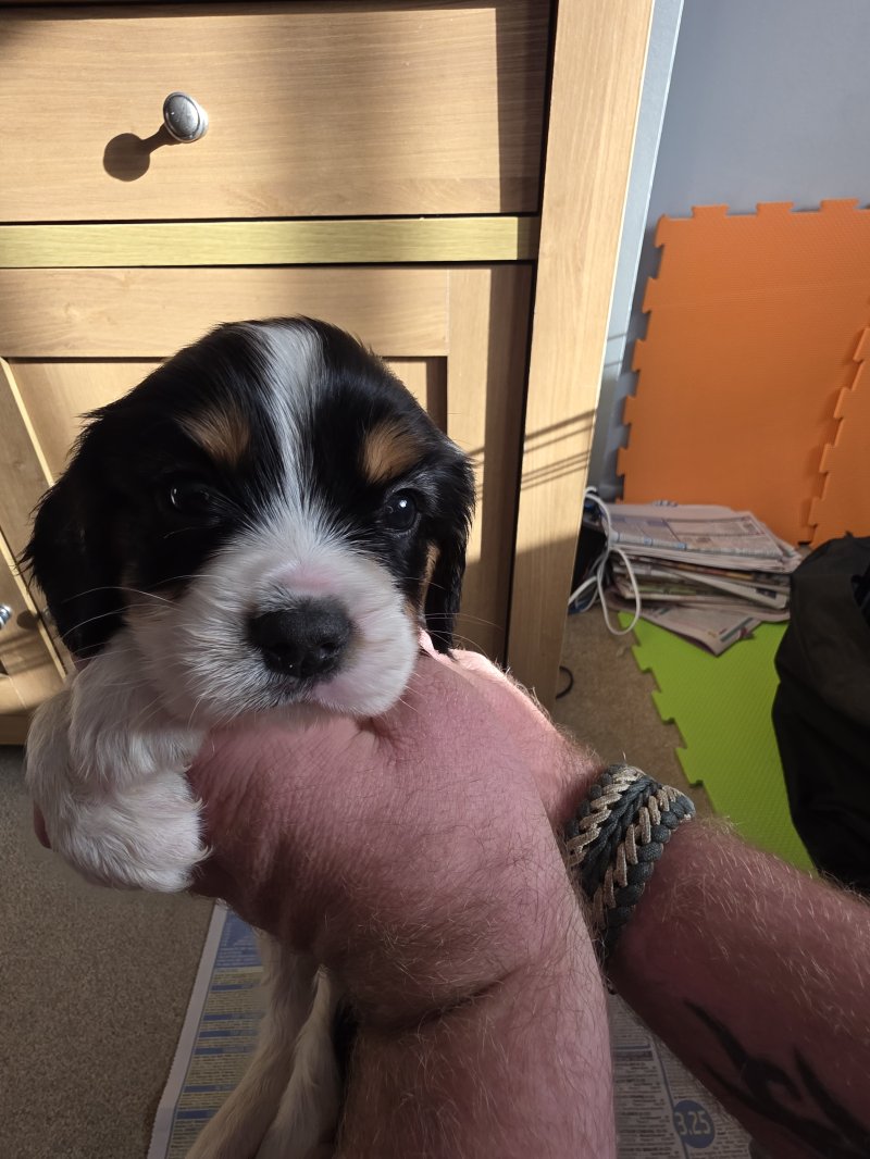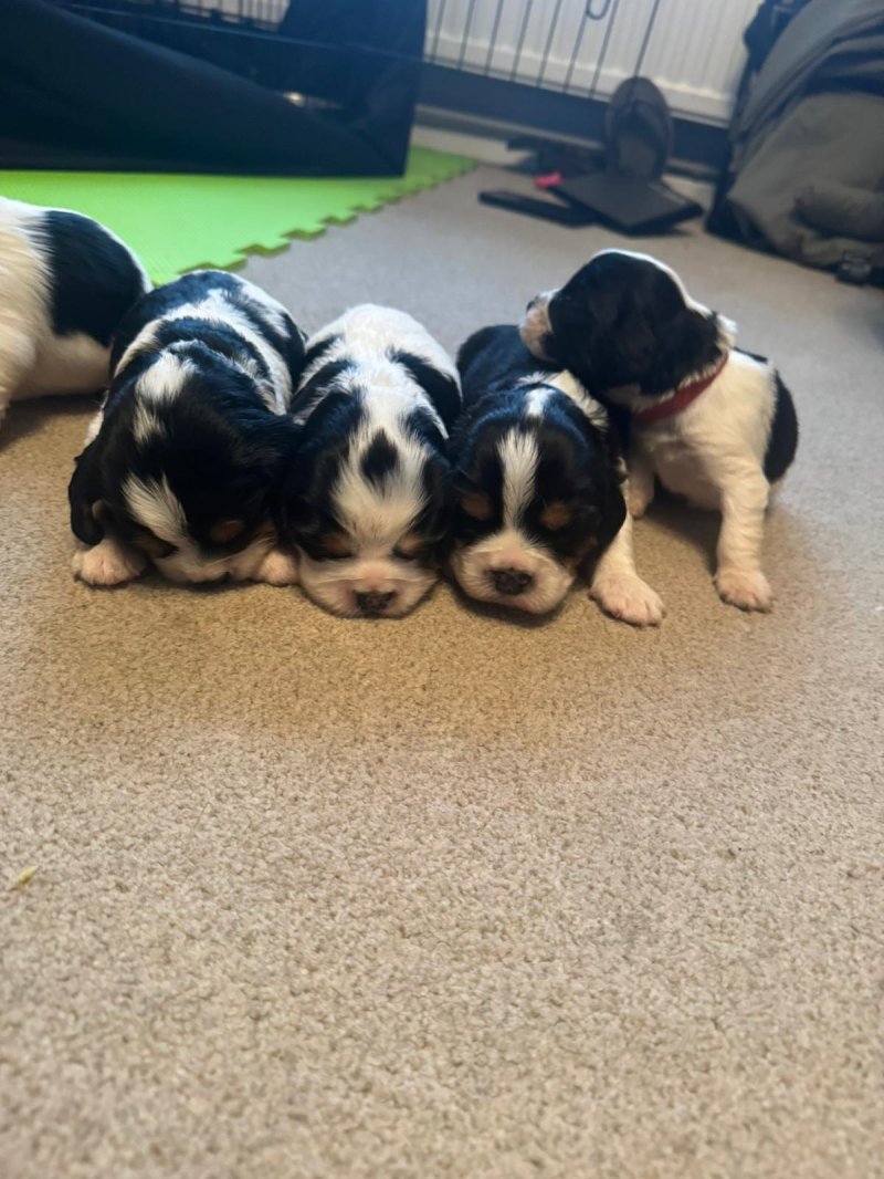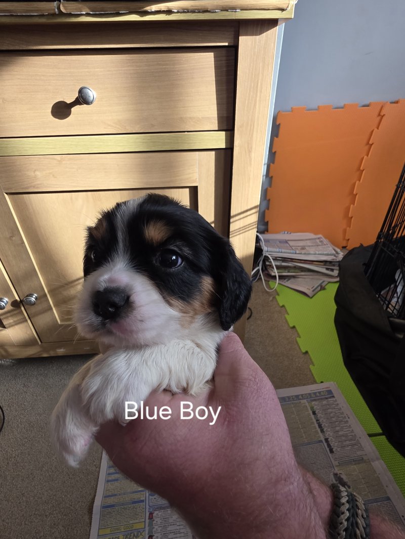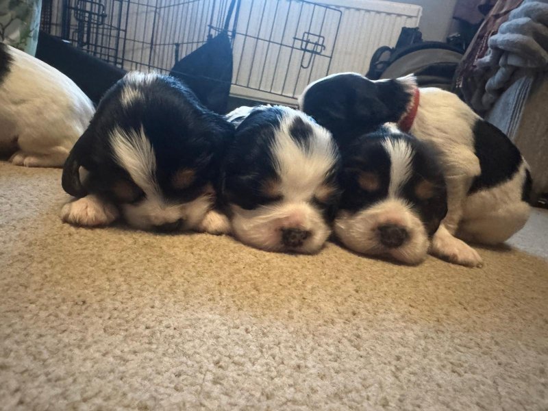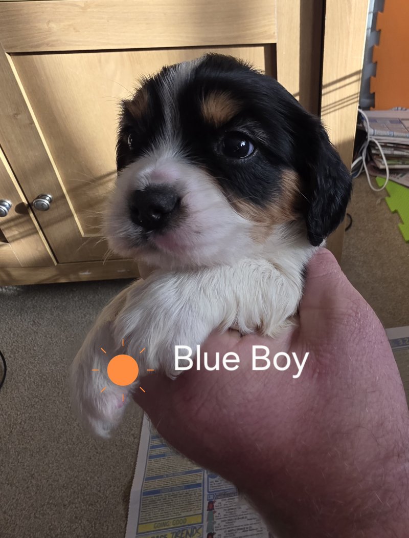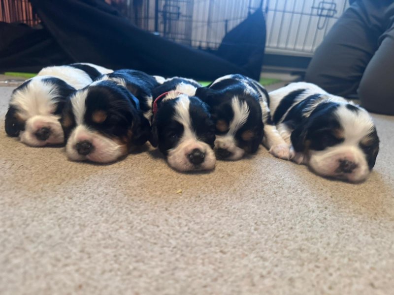 We have 5 beautiful cockerlier puppies looking for forever homes. Mum is a working cocker and is medium size dog Dad is a kc registered cavalier king charles spaniel he is medium size and is a family pet. we have 3× tri Girls 2 boys 1x tri-colour 1x black and white These puppies are being brought up in a family home with children and are use to everyday sounds of daily life, these dogs are ideal for families or anyone wanting a good companion. These dogs are very intelligent bread, and they are quick to pick things up quickly ie commands and toilet training. They are very gentle dogs and they are always eager to please they will happily fit into family life. Our puppies will come with all come with *vet checks *first vaccination *microchip *wormed *flea *2kg bag of food *blanket & toys with mum sent on Both mum and dad have been health tested and mum can be seen with her pups We are based in Hampshire and we would provide up weekly dates/ photos on your puppy and all the information you need to know up untill they go home with you. We will be taking viewings from now and ready for forever homes on 27th November recommend by pets4homes a deposit of £330 non refundable to secure your new loving pet. Any questions please do not hesitate to contact us we will happily provide more pics or videos on request or any questions you might have. Thank you for taking the time to read my ad