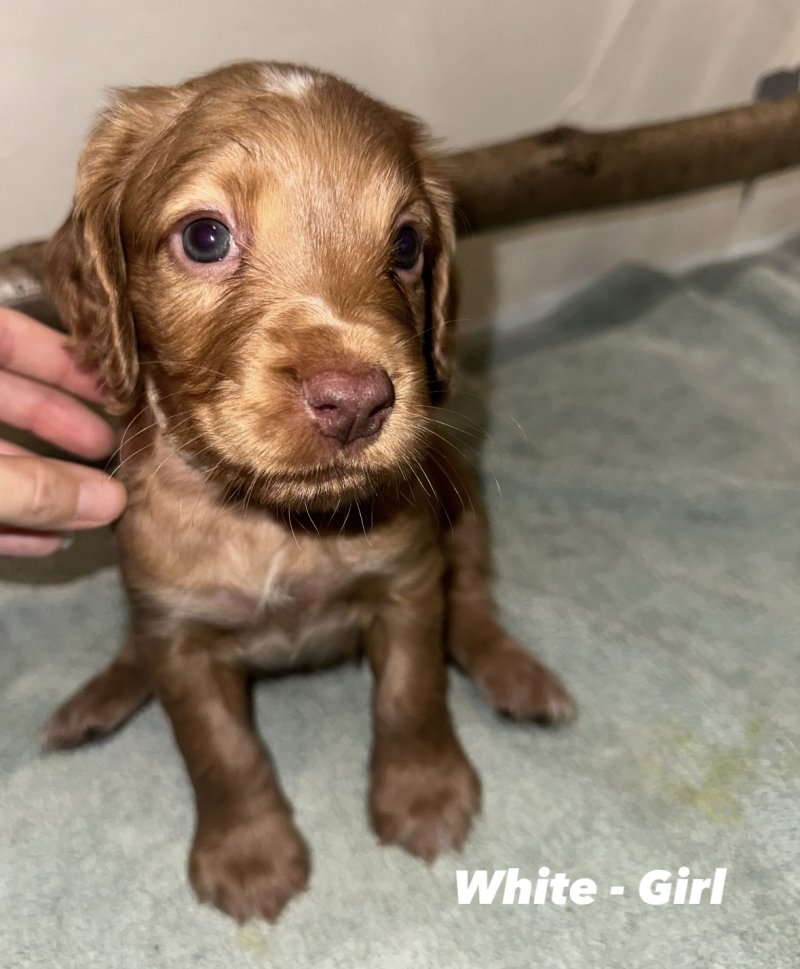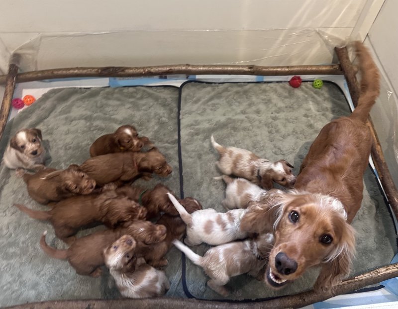 • Sire (Chester) – Red/Brown: A striking young dog & superb working cocker. He is curious, biddable, and shows great loyalty.