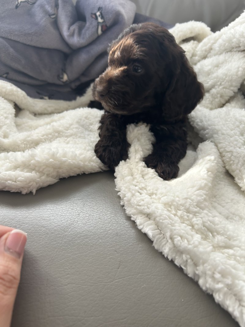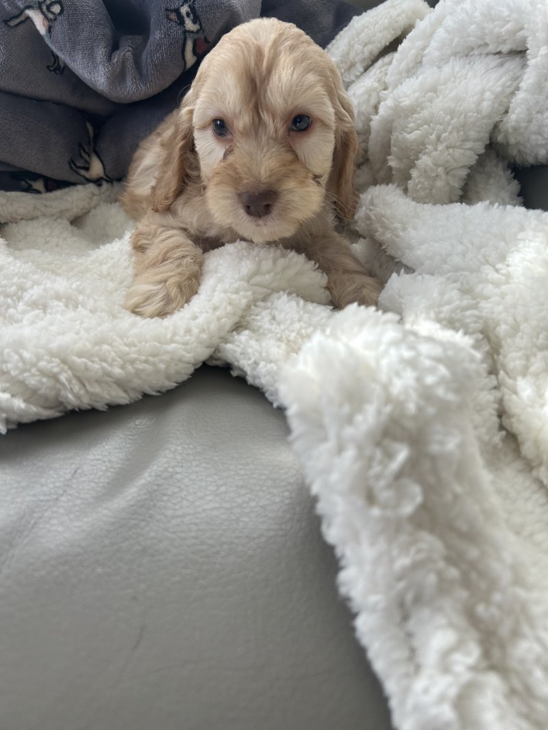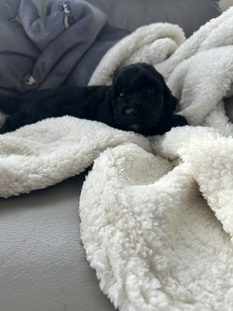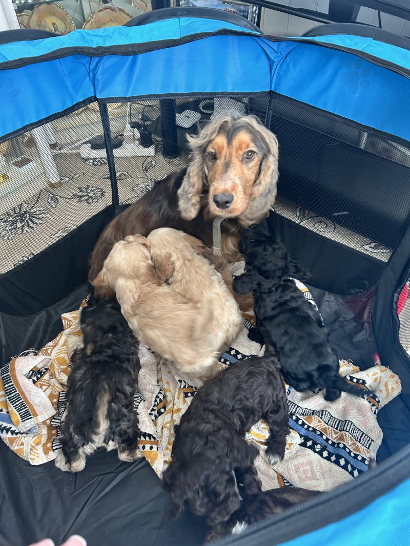 Our beautiful girl had a stunning litter of cockerpoo pups . She has 3 girls and 2 boys. There is two cream , one black , one chocolate and one black try . This is her first litter and she’s done brilliantly in raising them . All pups are now eating and drinking , treated regular for worms and fleas and will be microchipped before leaving for their new homes . They are well socialised with other animals , children and household noises . We have started toilet training using puppy pads . Plus we have taken them in the car a couple of times so they get used to travelling . Dad is a toy poodle stud we chose and pictures of him can be seen plus we have his health check paper work that can be viewed . Please message or call with any more questions or to arrange a viewing . Thank you .
