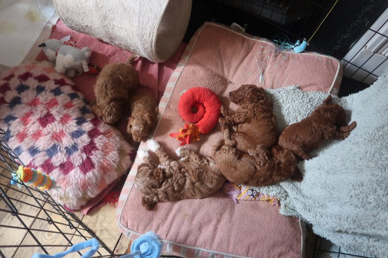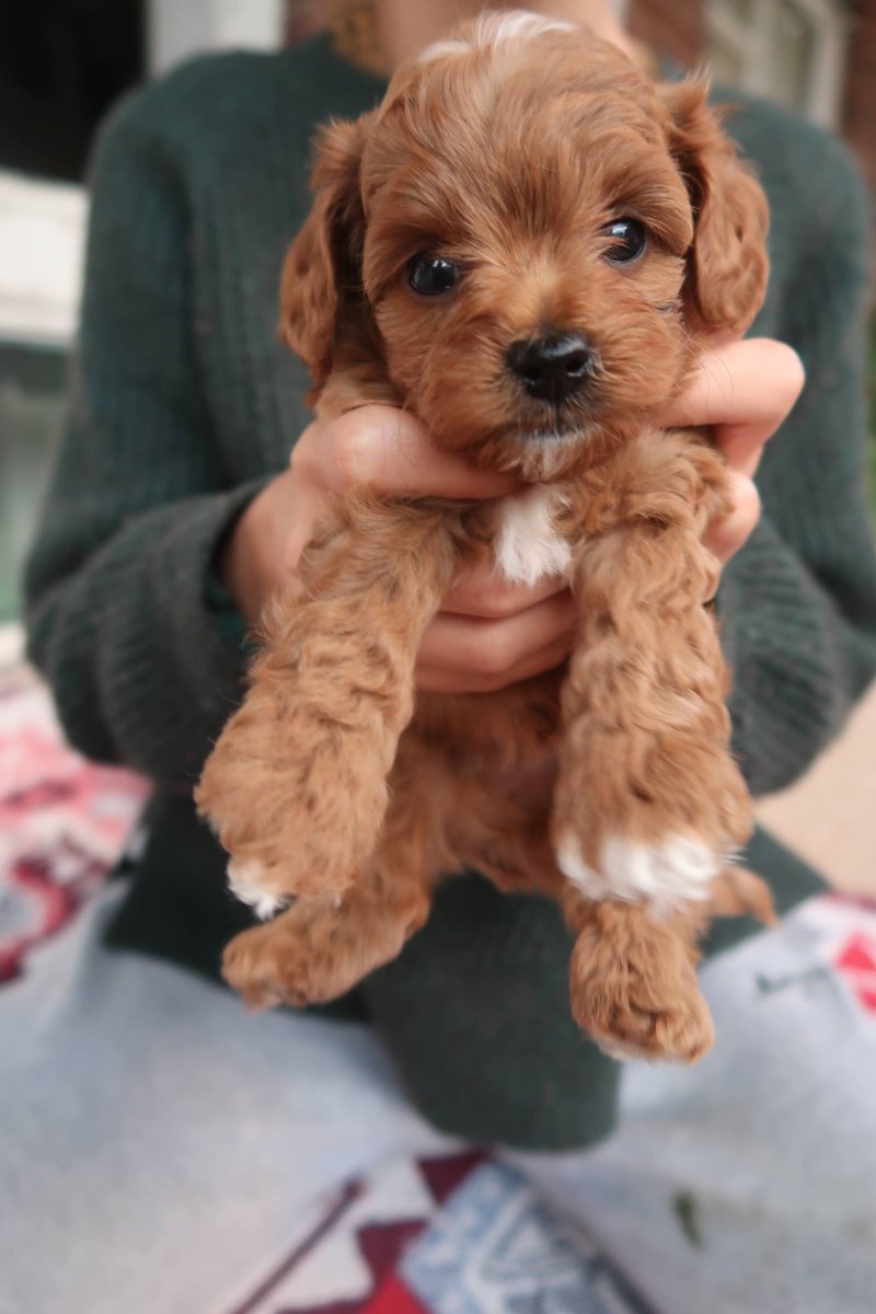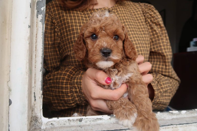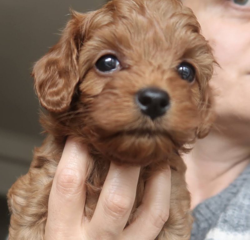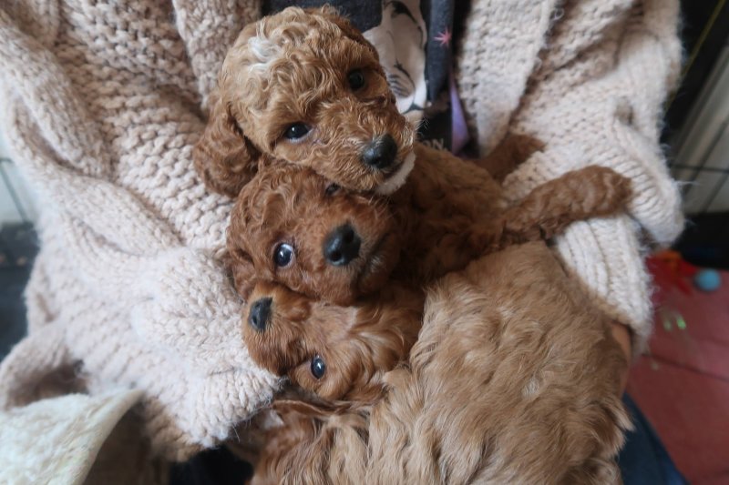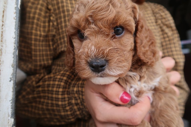 We have six half-Asian toy poodle Cockerpoos. These are specially bred for the "teddy bear look" faces with rounder snouts and big round eyes. They are also smaller than standard toy Cockerpoos and have a calmer nature.They are all absolutely gorgeous and we love them to bits. All have curly hair, great proportions and very sweet teddy bear like faces.
