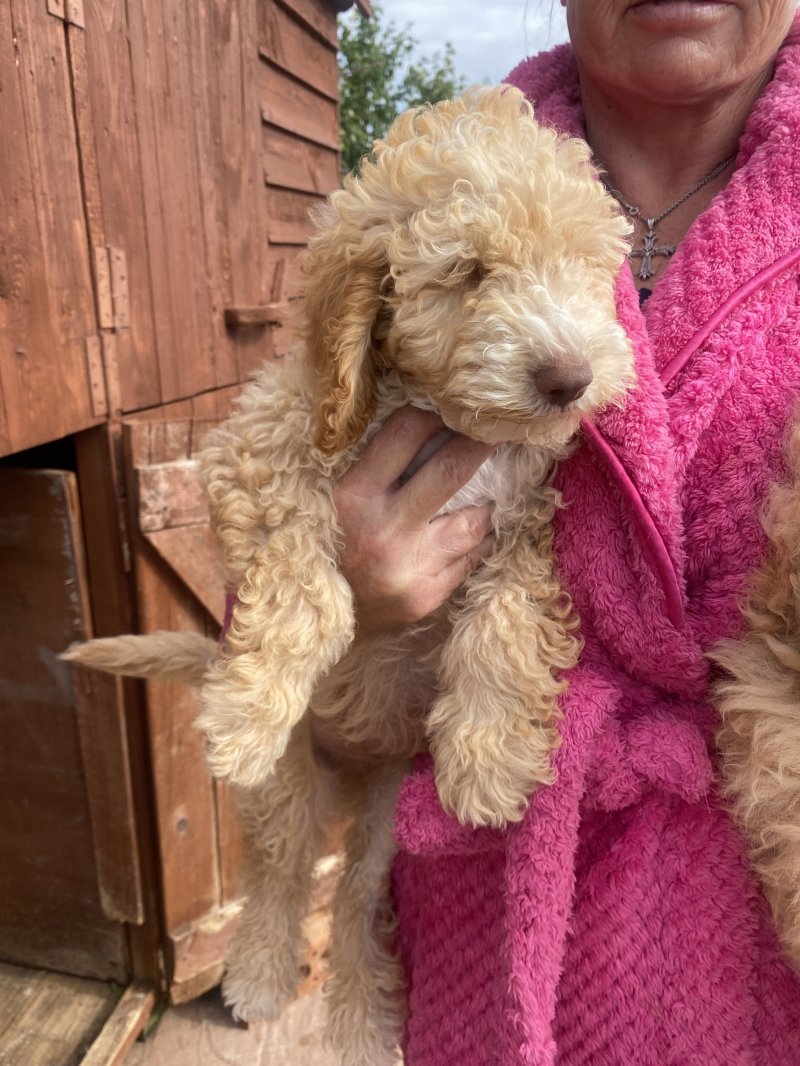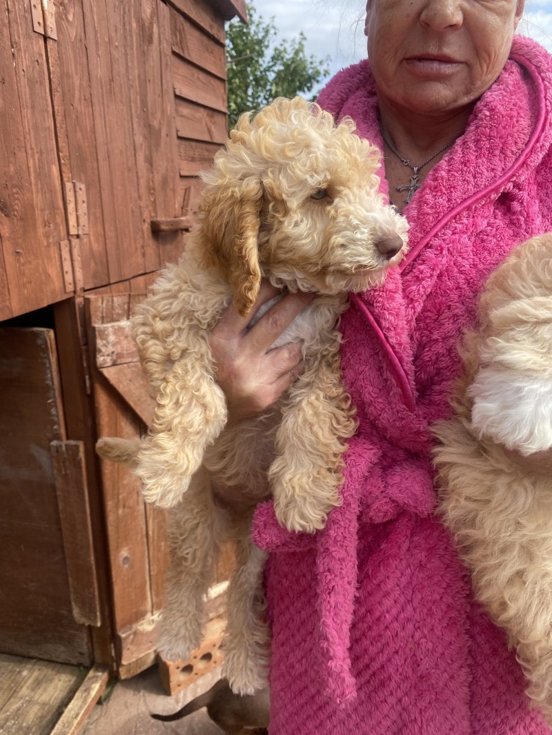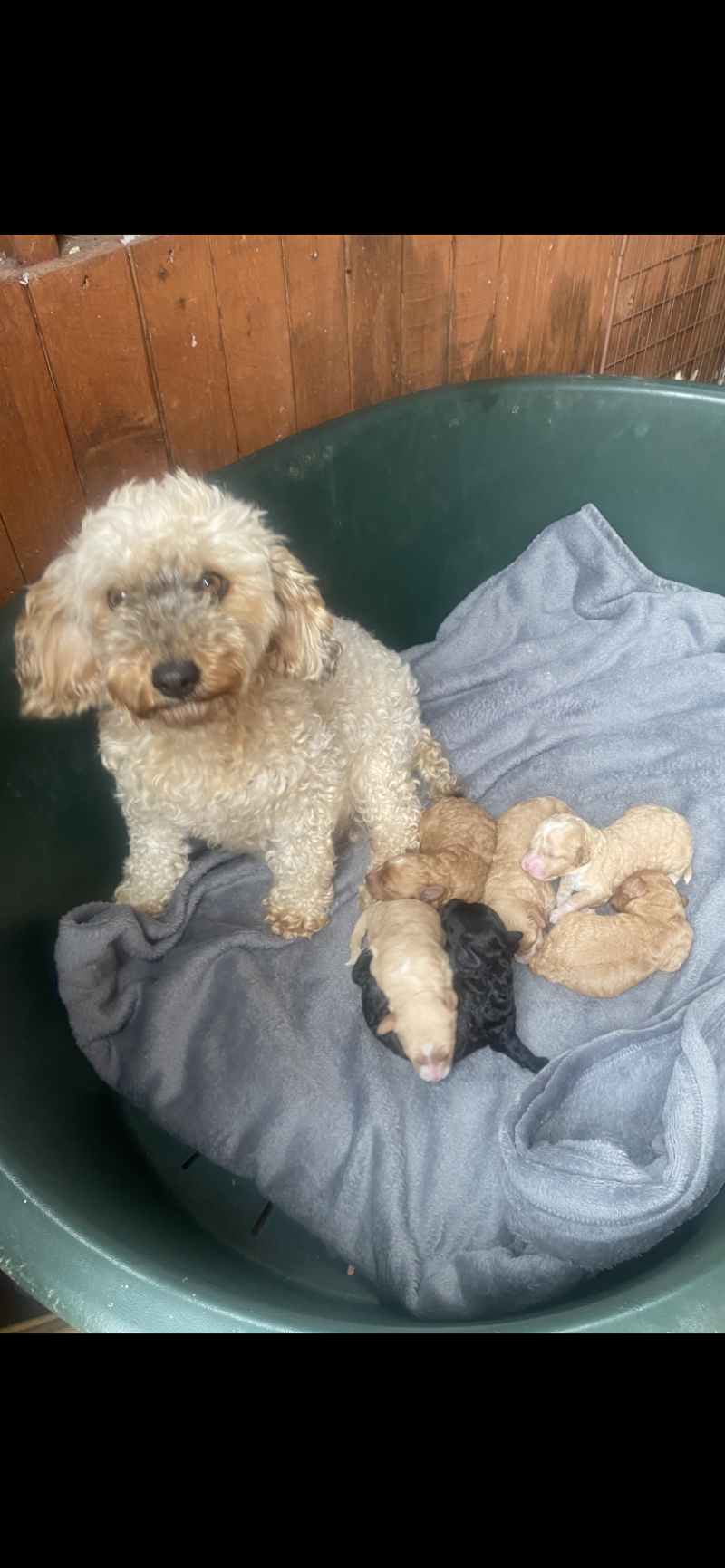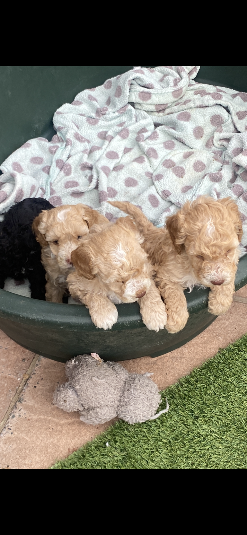 Hi here I have 2 puppies left 2 boys cream and a touch of white 11 weeks old 4th September beautiful pups mum a cockerpoo and dad a pedigree poodle