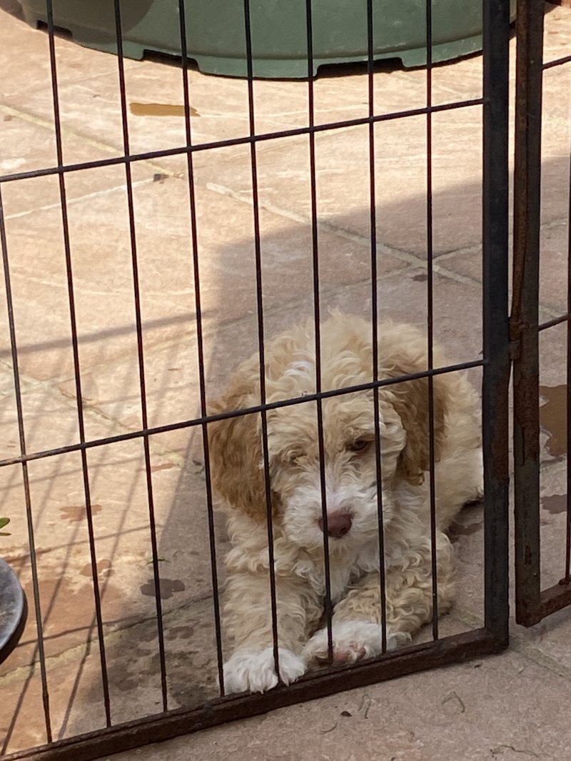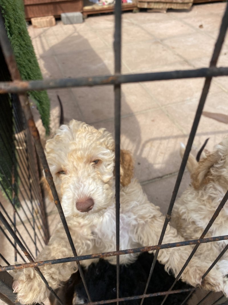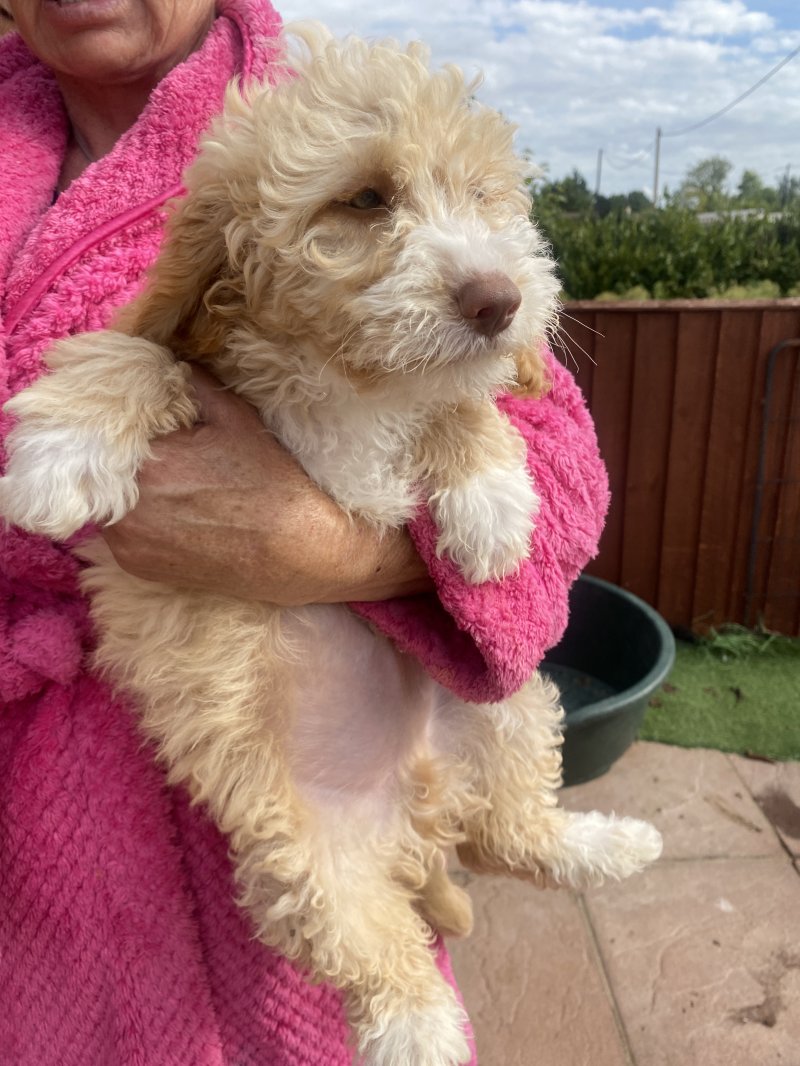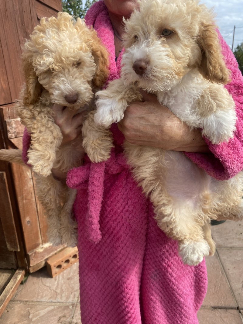 Hi here I have 2 puppies left 2 boys cream and a touch of white 11 weeks old 4th September beautiful pups mum a cockerpoo and dad a pedigree poodle