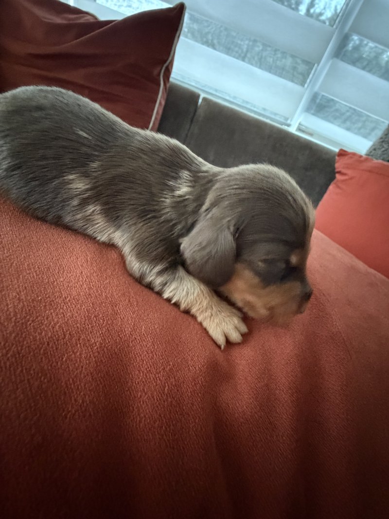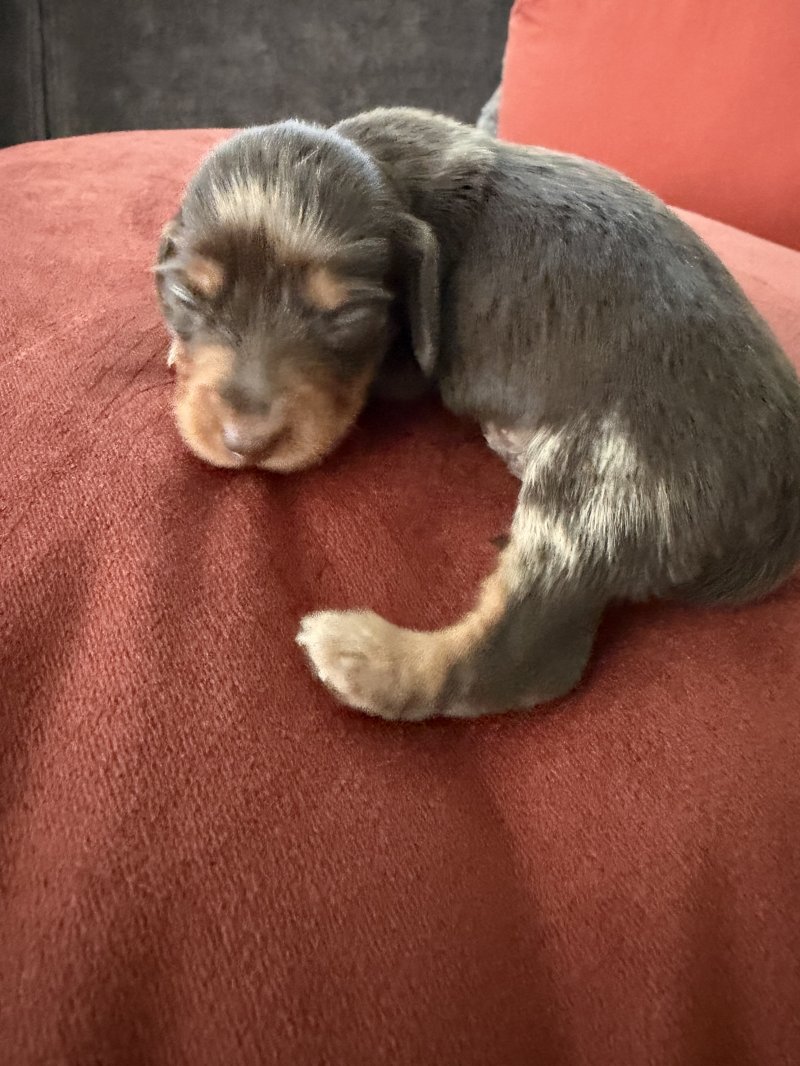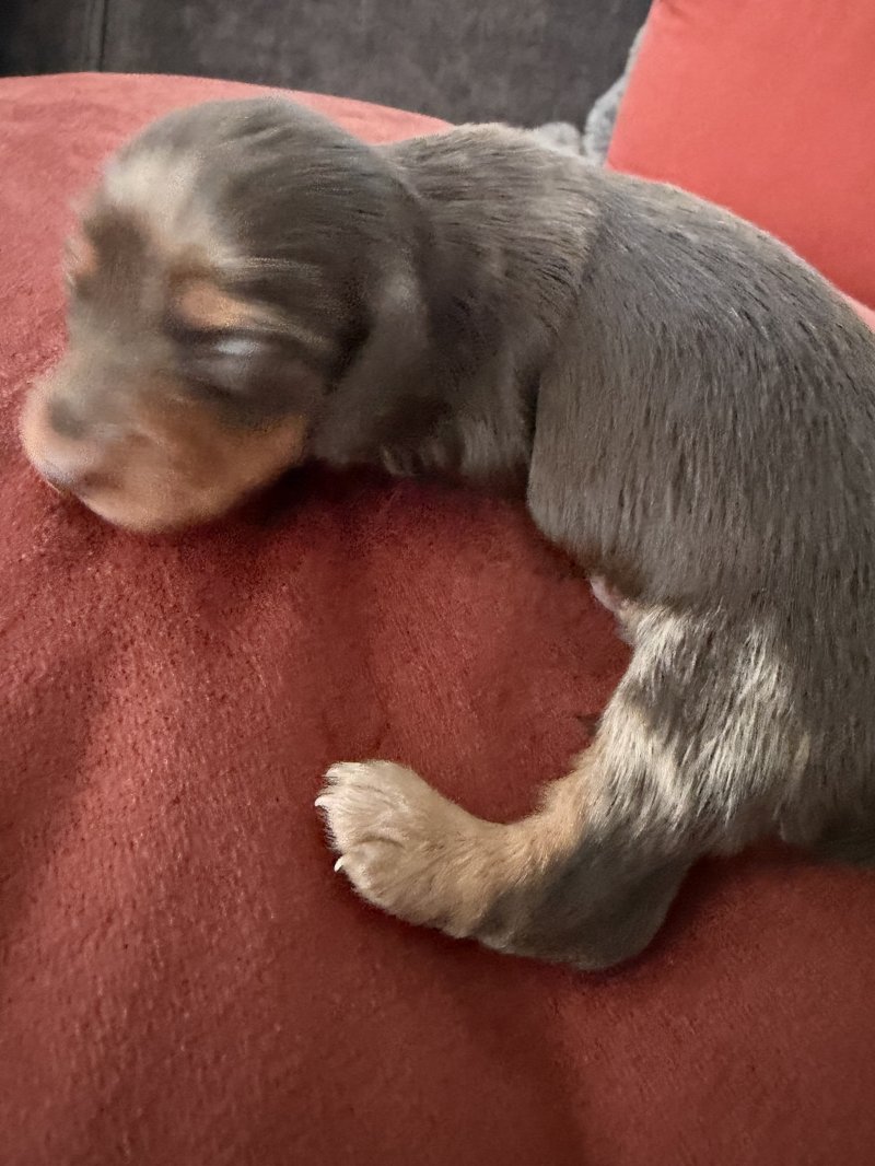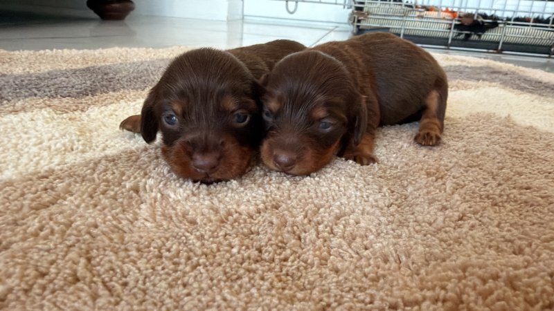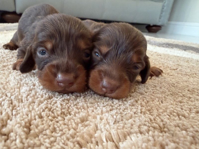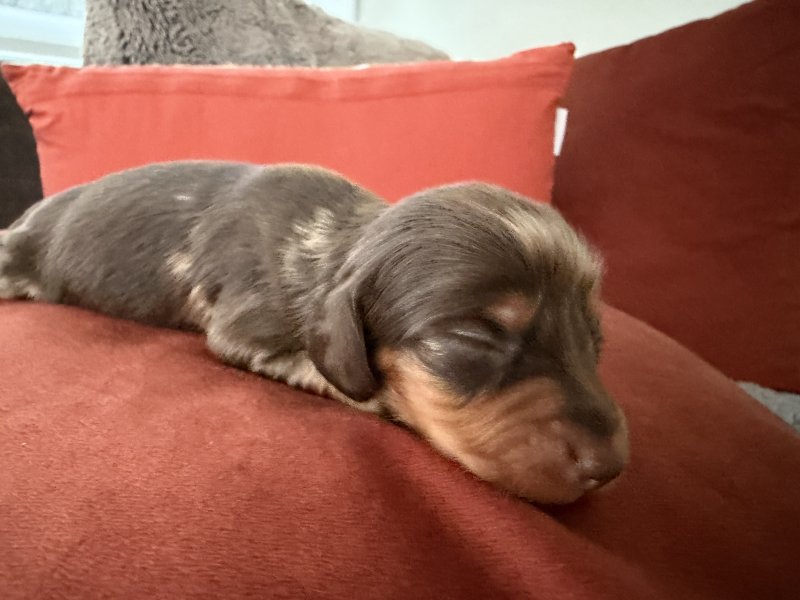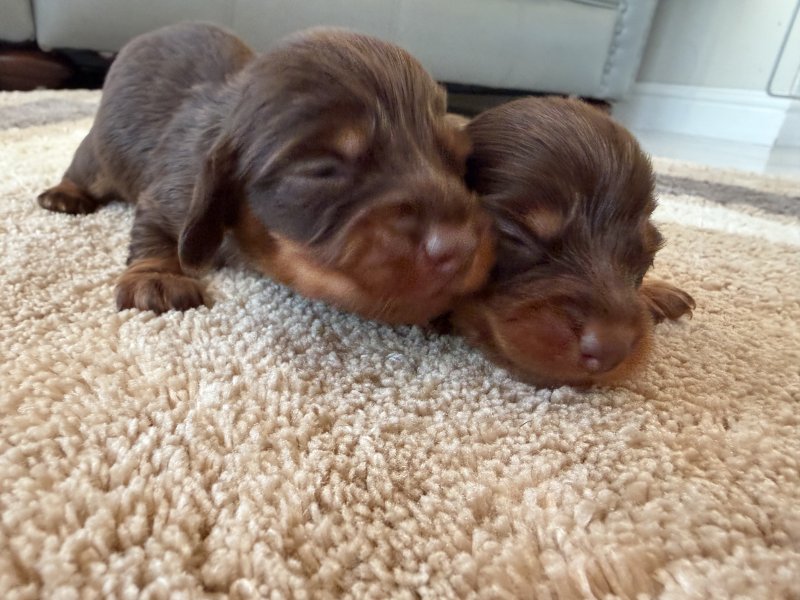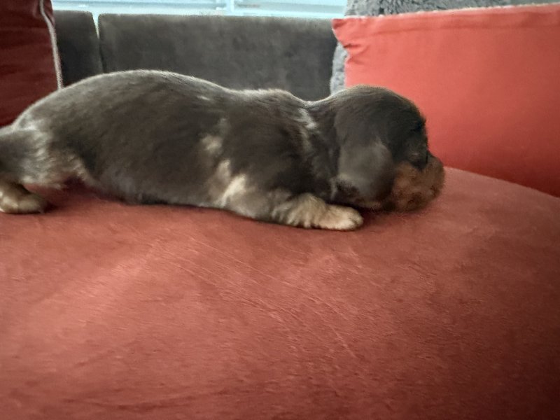 Please to anounce hettys first litter of miniature long haired dachshund puppy’s she’s had 3 girls 2 boys