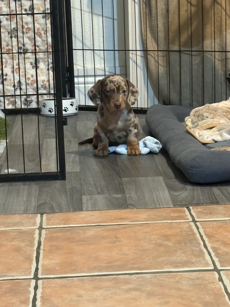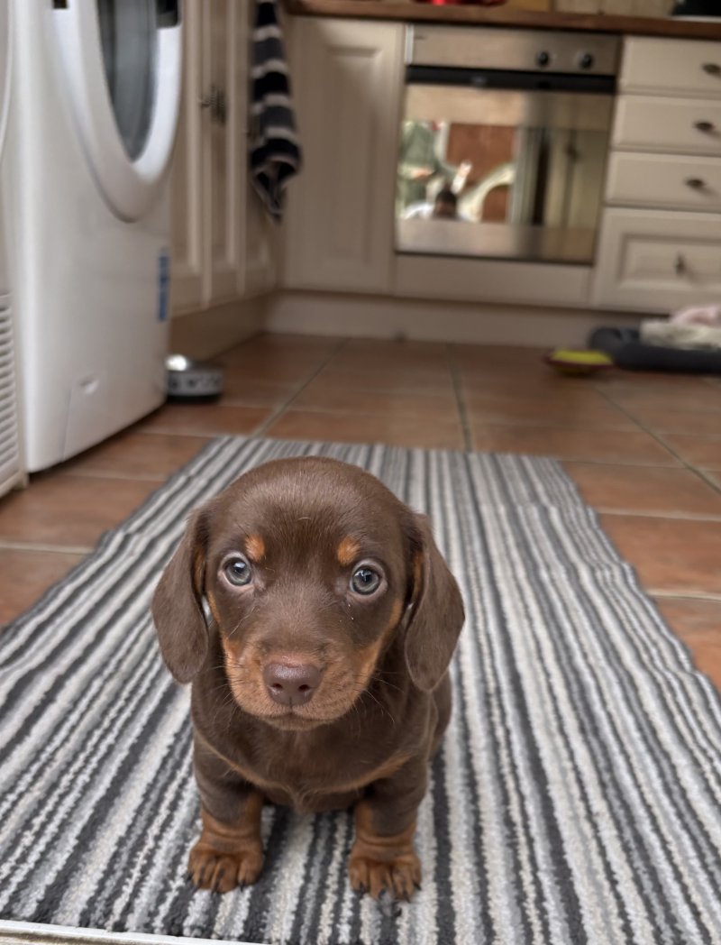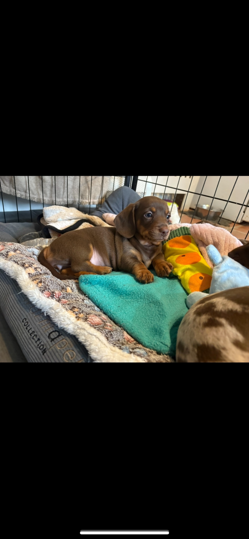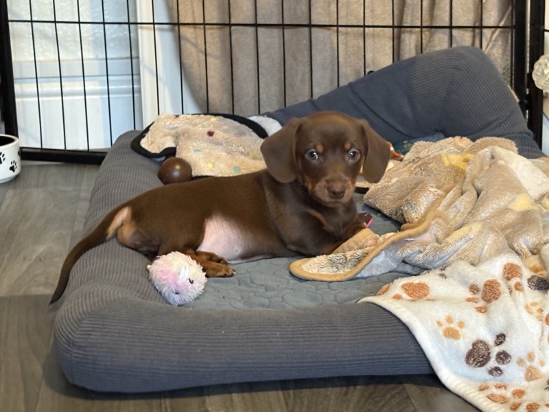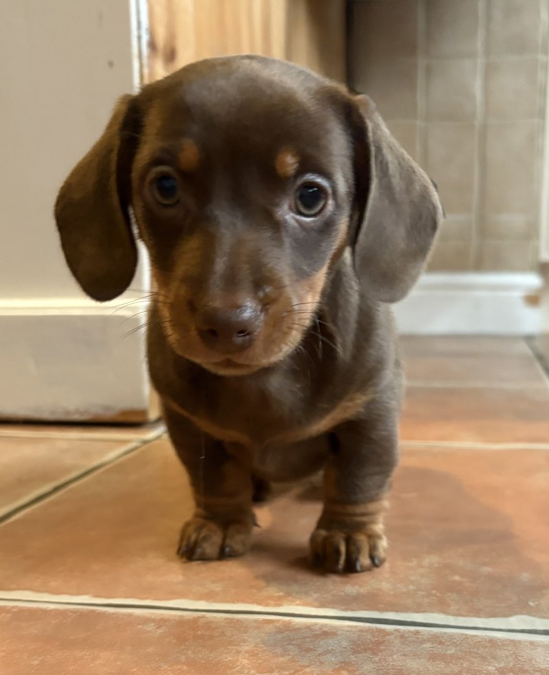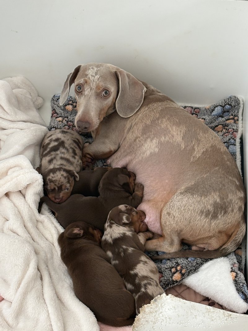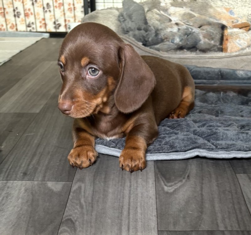 Beautiful litter of chocolate and chocolate dapple daschunds. In the litter we have 3 chocolate girls and 1 dapple girl. The little boy is also a dapple. Mum is Isabella dapple and dad is chocolate tan.