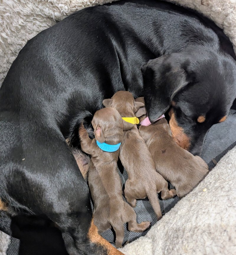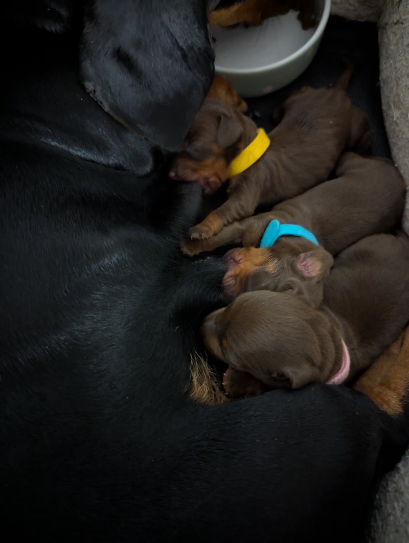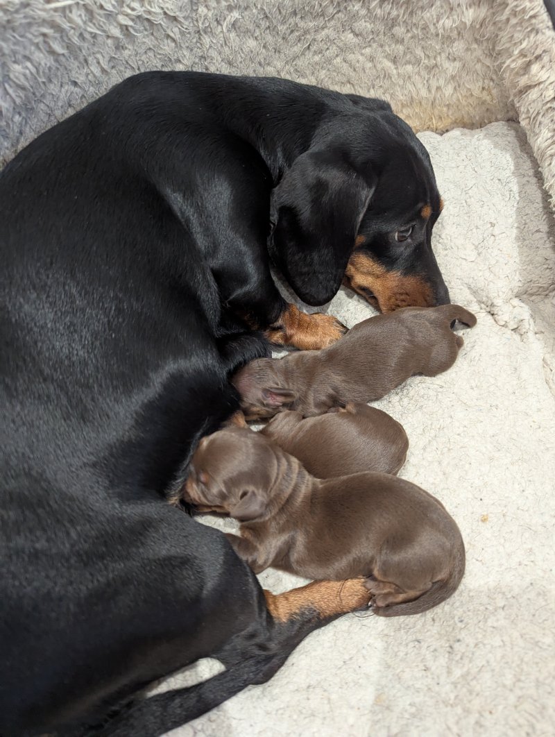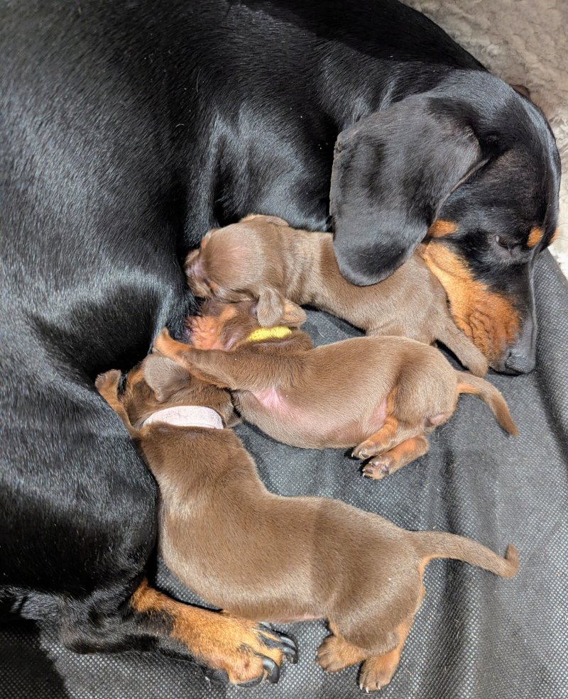 π Our beautiful girl, Elsi has given birth to 3 adorable smooth haired chocolate and tan miniature dachshunds. These adorable puppies are being raised in our family home and are being reared with so much care, love and attention. They'll be an important part of our family, therefore will be well socialised and used to household noises. π