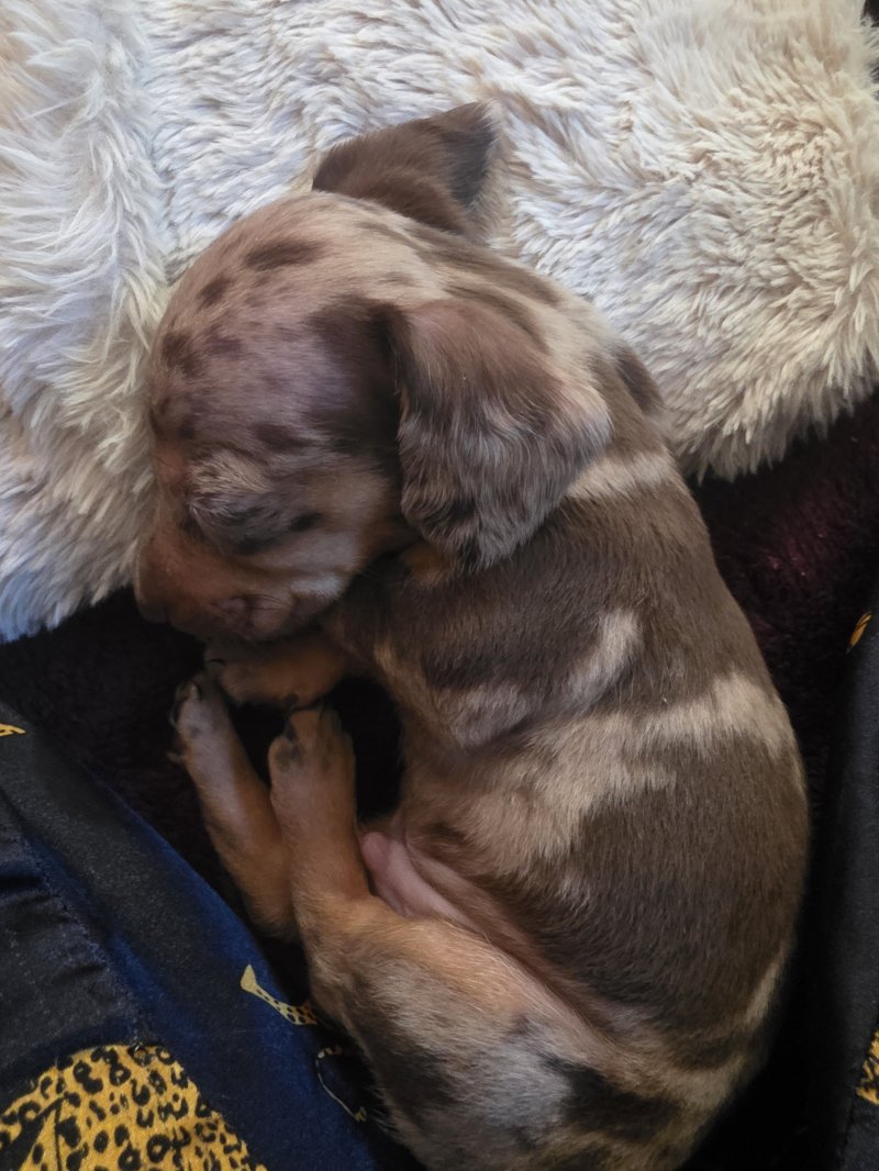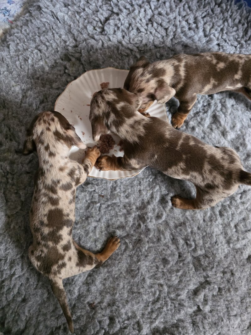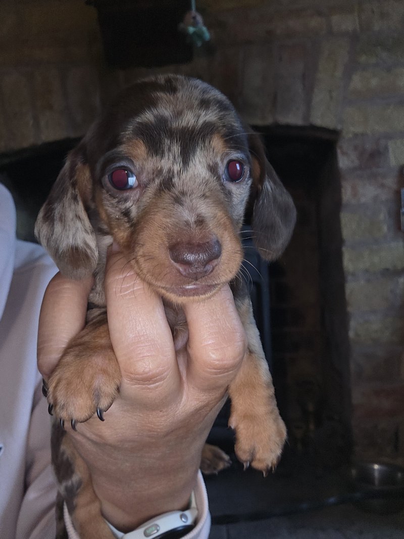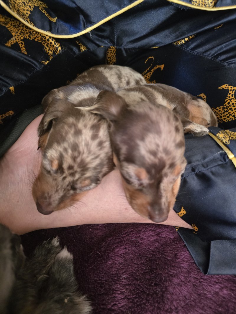 I have 2 quality kc registered Choc&tan dapple mini dachshunds left available. I am an experienced breeder of this breed and these are little crackers. True to type, nice long ears, short legs deep chested with temperaments second to none. Mum is my girl Binx and is a fantastic mum. She's done so well with them. Dad is Barney from Edenshell dachshunds. Ive used him many times as his line produces such amazing pups with my girl. Photos dont do them justice! Pups being socialed daily and I train them to toilet on grass. Viewings welcome now they are of weaning age. £200 non refundable deposit secures your pup.