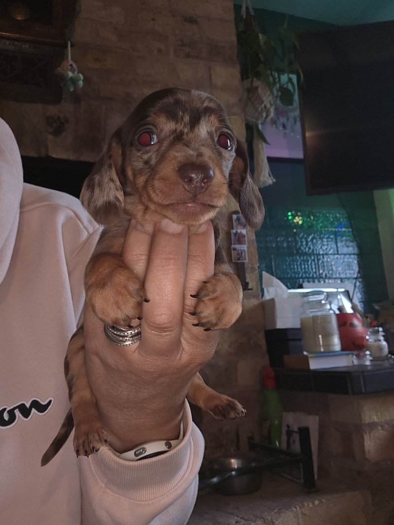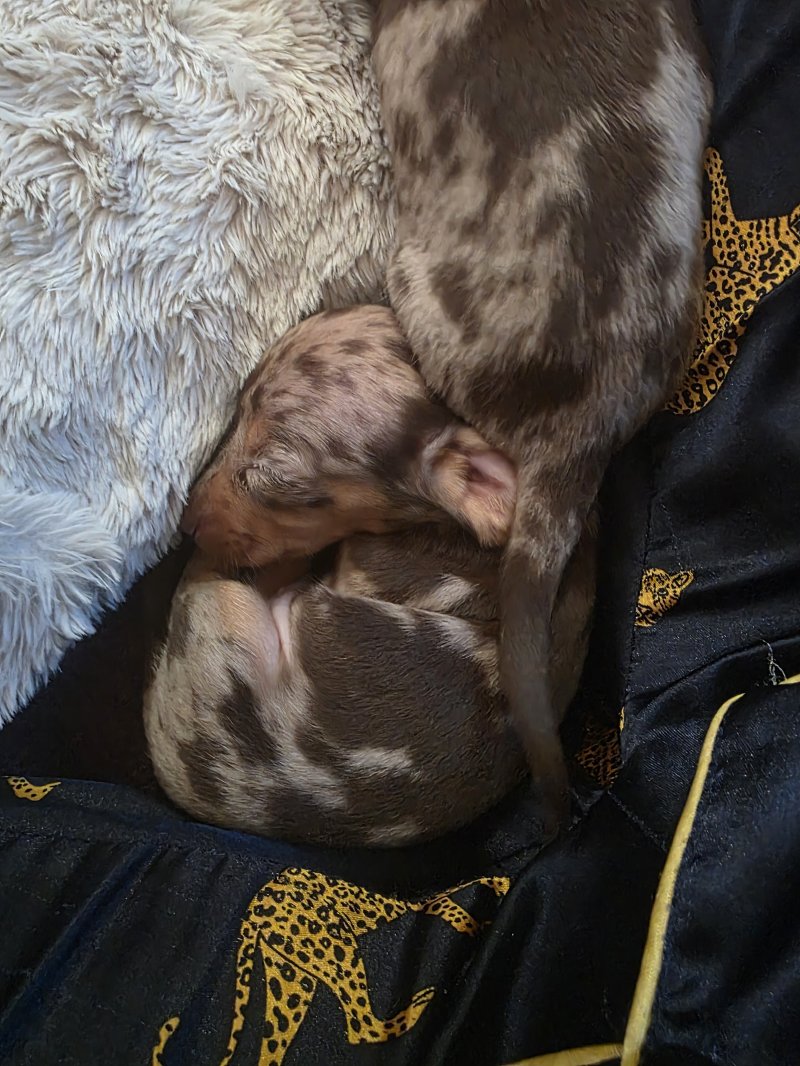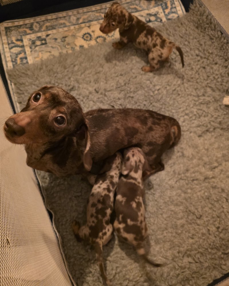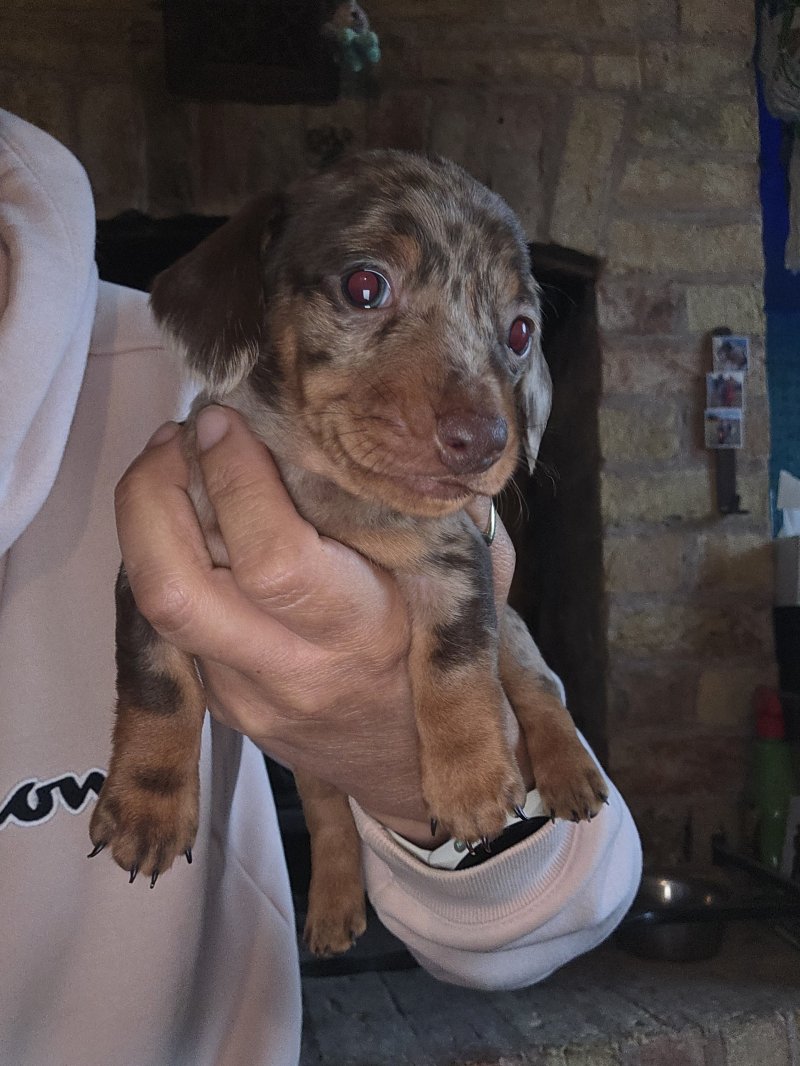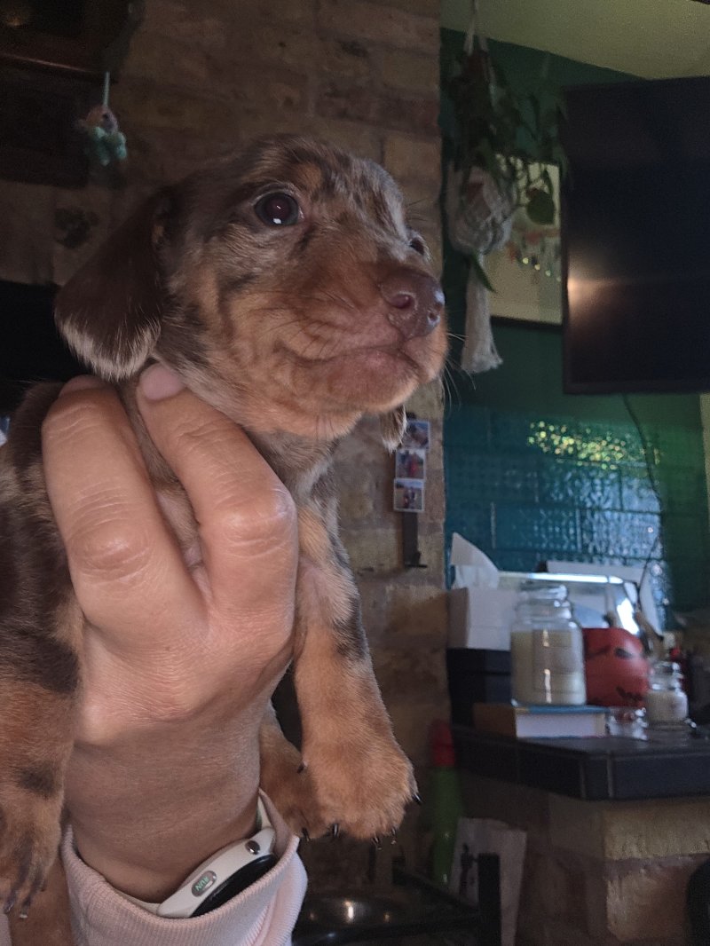 I have 2 quality kc registered Choc&tan dapple mini dachshunds left available. I am an experienced breeder of this breed and these are little crackers. True to type, nice long ears, short legs deep chested with temperaments second to none. Mum is my girl Binx and is a fantastic mum. She's done so well with them. Dad is Barney from Edenshell dachshunds. Ive used him many times as his line produces such amazing pups with my girl. Photos dont do them justice! Pups being socialed daily and I train them to toilet on grass. Viewings welcome now they are of weaning age. £200 non refundable deposit secures your pup.