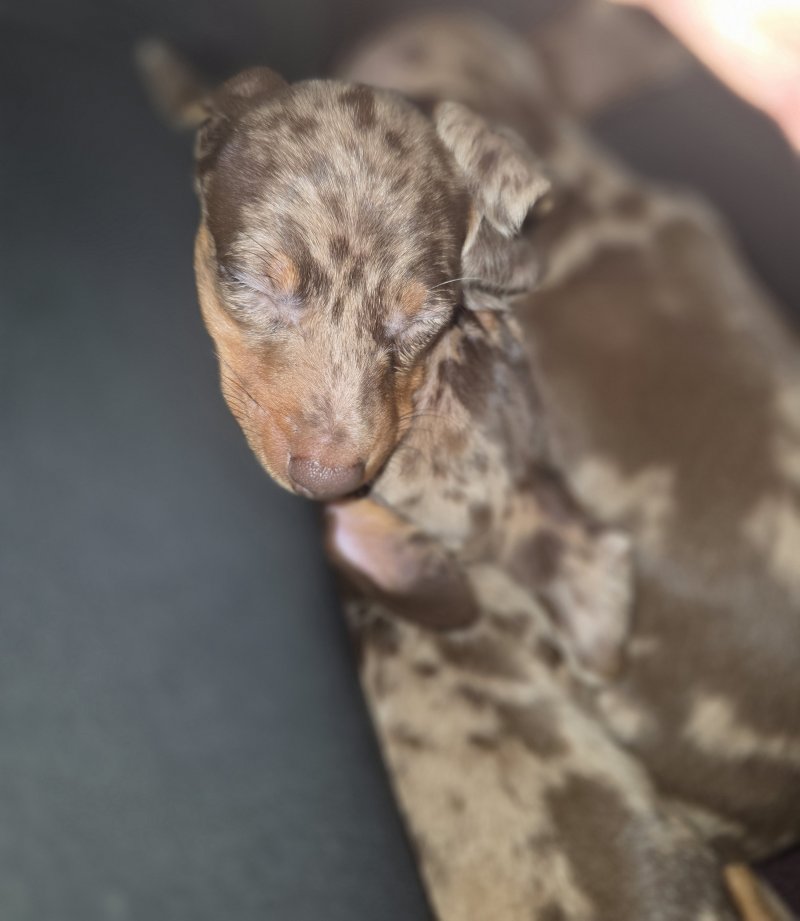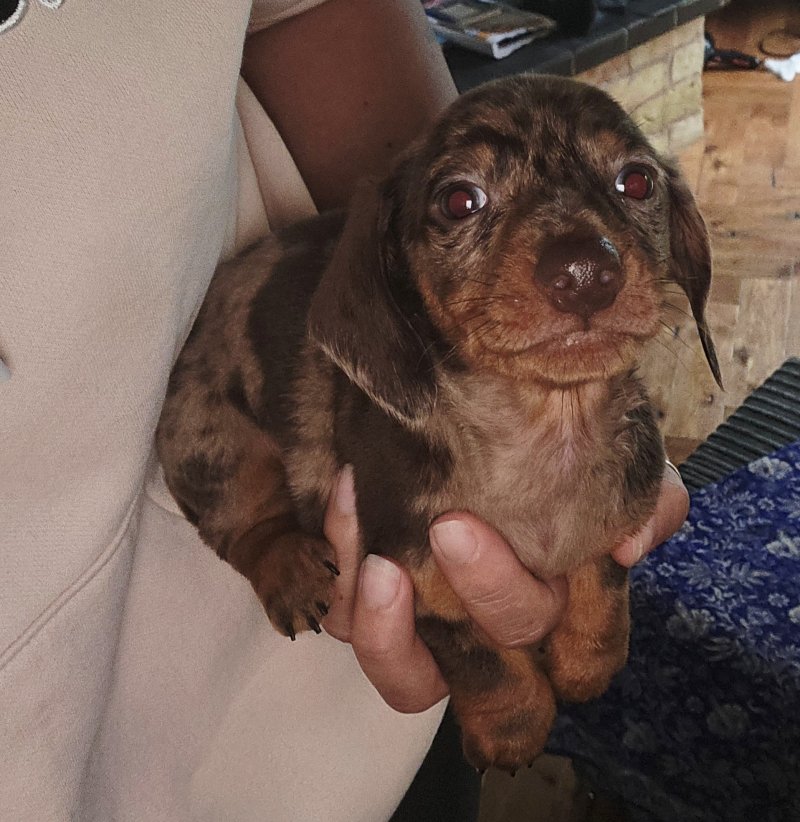 I have 1 quality kc registered Choc&tan dapple mini dachshund male left available. I am an experienced breeder of this breed and these are little crackers. True to type, nice long ears, short legs deep chested with temperaments second to none. Last pup is nicely confident with a nice chunky stature. Mum is my girl Binx and is a fantastic mum. She's done so well with them. Dad is Barney from Edenshell dachshunds. Ive used him many times as his line produces such amazing pups with my girl. Photos dont do them justice! Pups being socialed daily and I train them to toilet on grass. Viewings welcome now they are of weaning age. £200 non refundable deposit secures your pup.