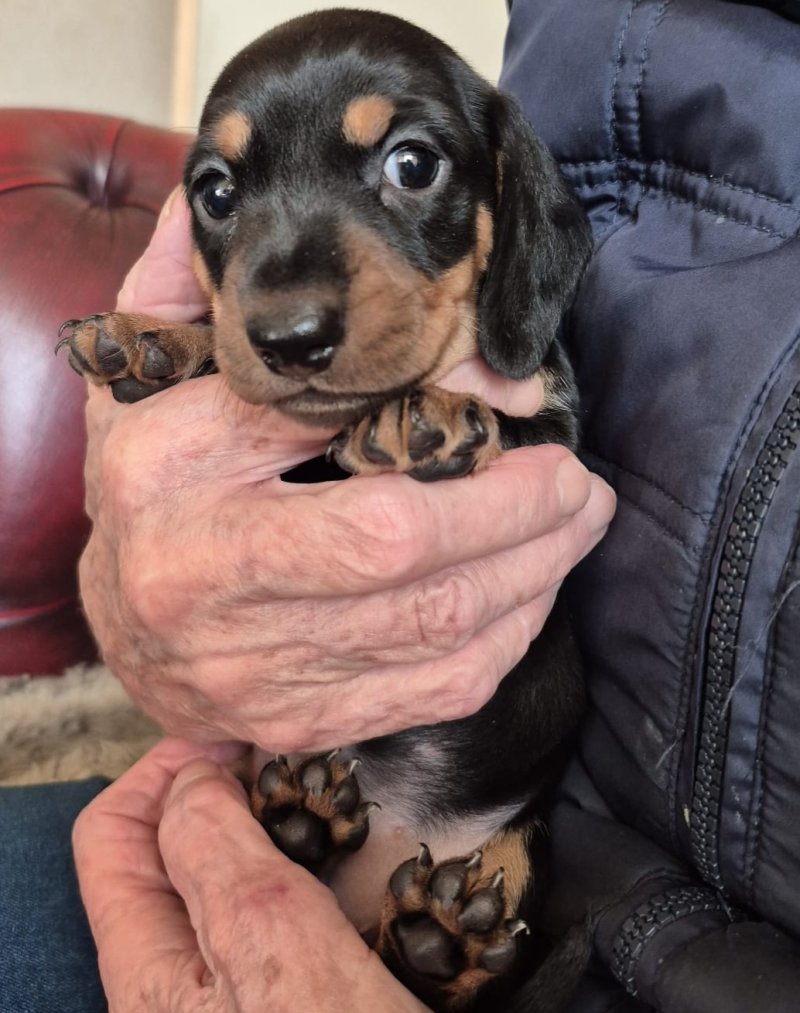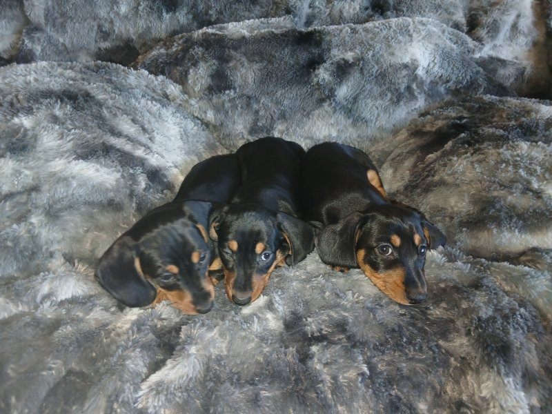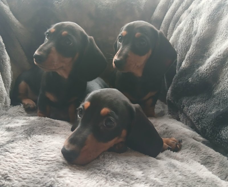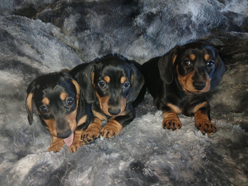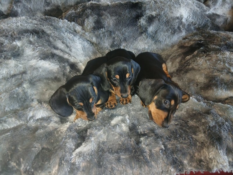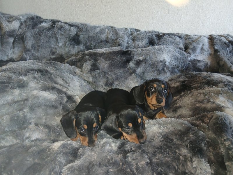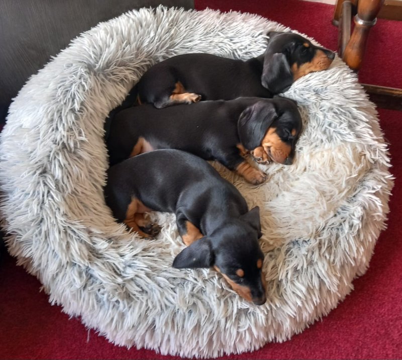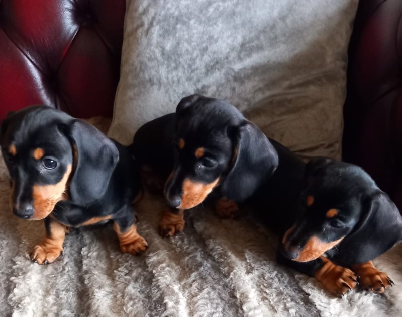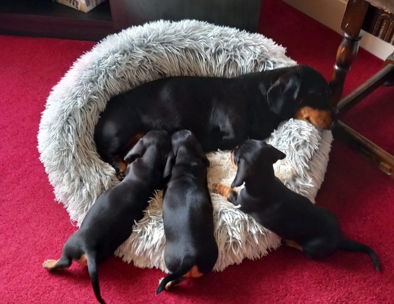 On the 4th of September our Miniature Dachshund Penny gave birth to 3 adorable little girls. She is a very attentive mother with a sweet and quiet disposition, and this has been passed on to her litter. The father Bobby is also a family pet with a friendly and playful nature, and these qualities have also been passed on to the pups. All pups and parents can be viewed collectively to assure the buyer of their well socialised nature. These pups are home-bread and reared in a domestic environment so are well used to domestic noises and with other dogs and frequent visitors. Each are equally adorable. Viewing recommended and as there is someone at home all the time most viewing times can be accommodated. Pups shall come: Fully Vaccinated. Flea and wormed. Vet health Checked. Micro-chipped.