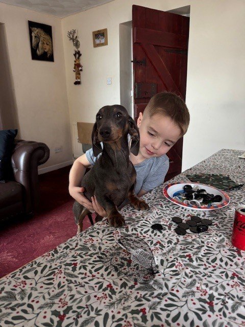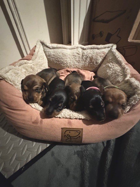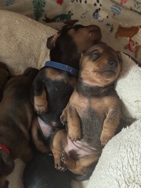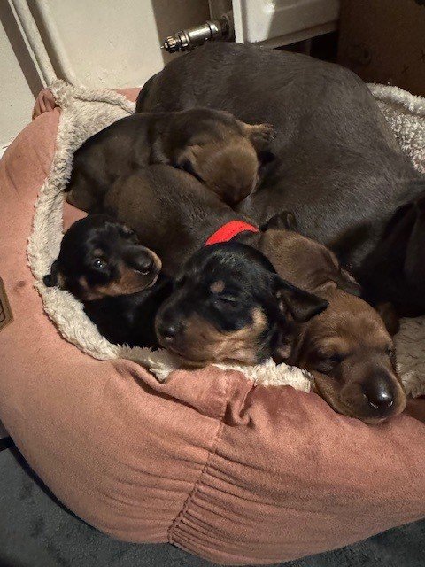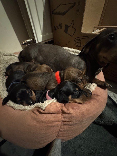 Azure Bluebell Beauty - "Belle" our gorgeous KC Reg Blue & Tan mini gave us 5 healthy fat shiny pups who will be looking for new sofas from December 15th. Belle is a fantastic natured little girl and is loved by all the family including my 4 grandkids who she is exceptional with. This is her first litter, and she has proven to be a brilliant Mother.