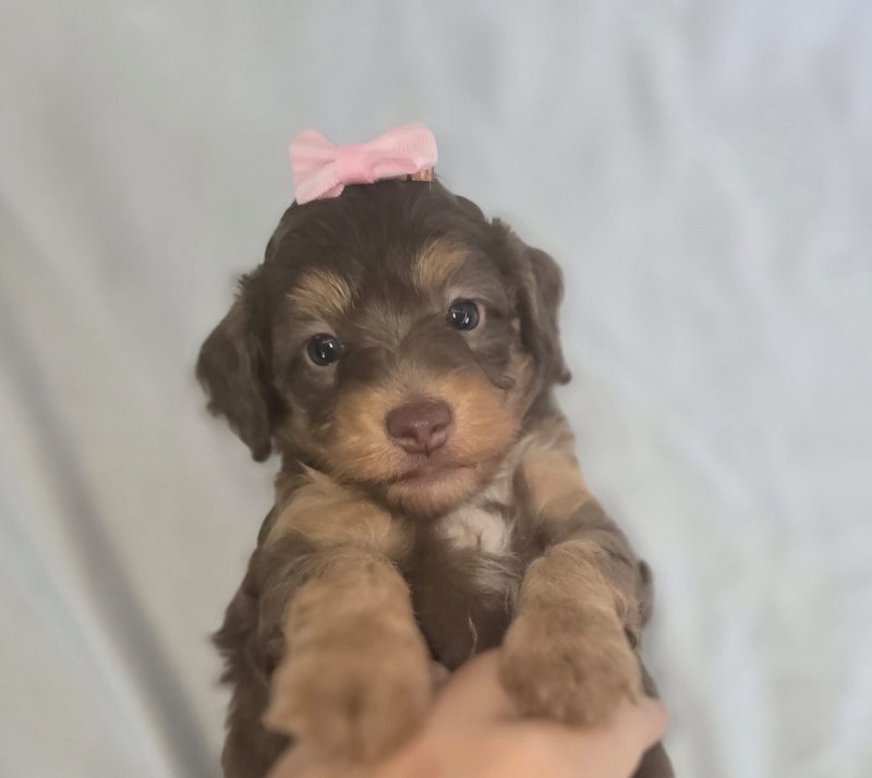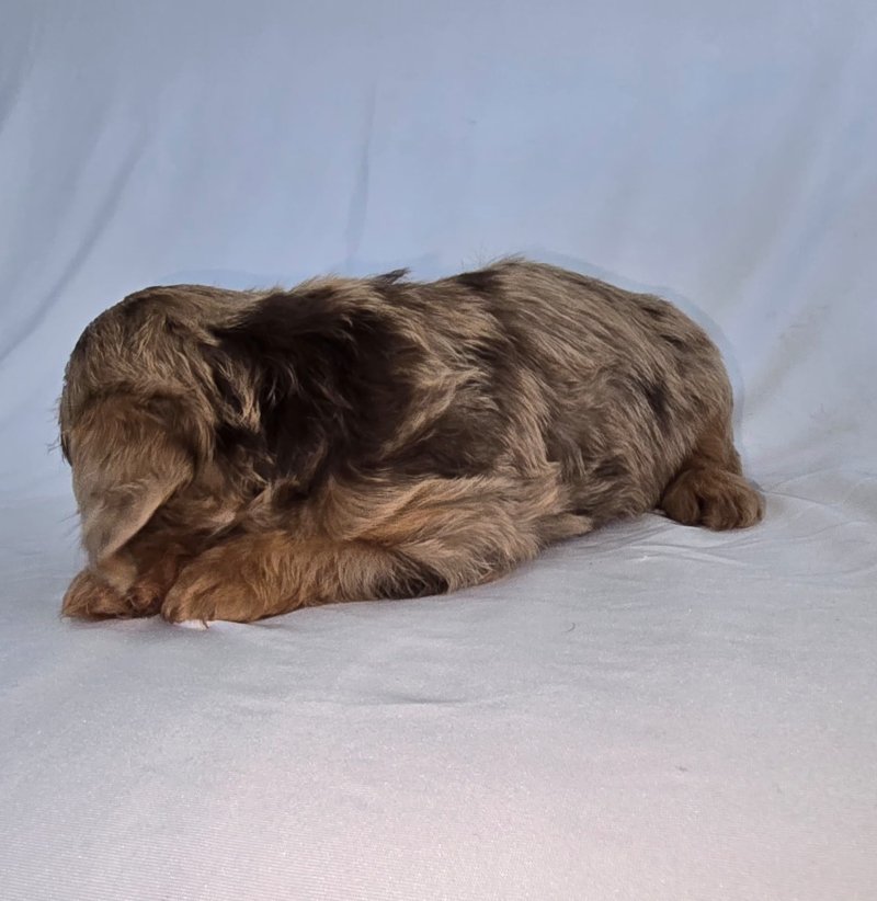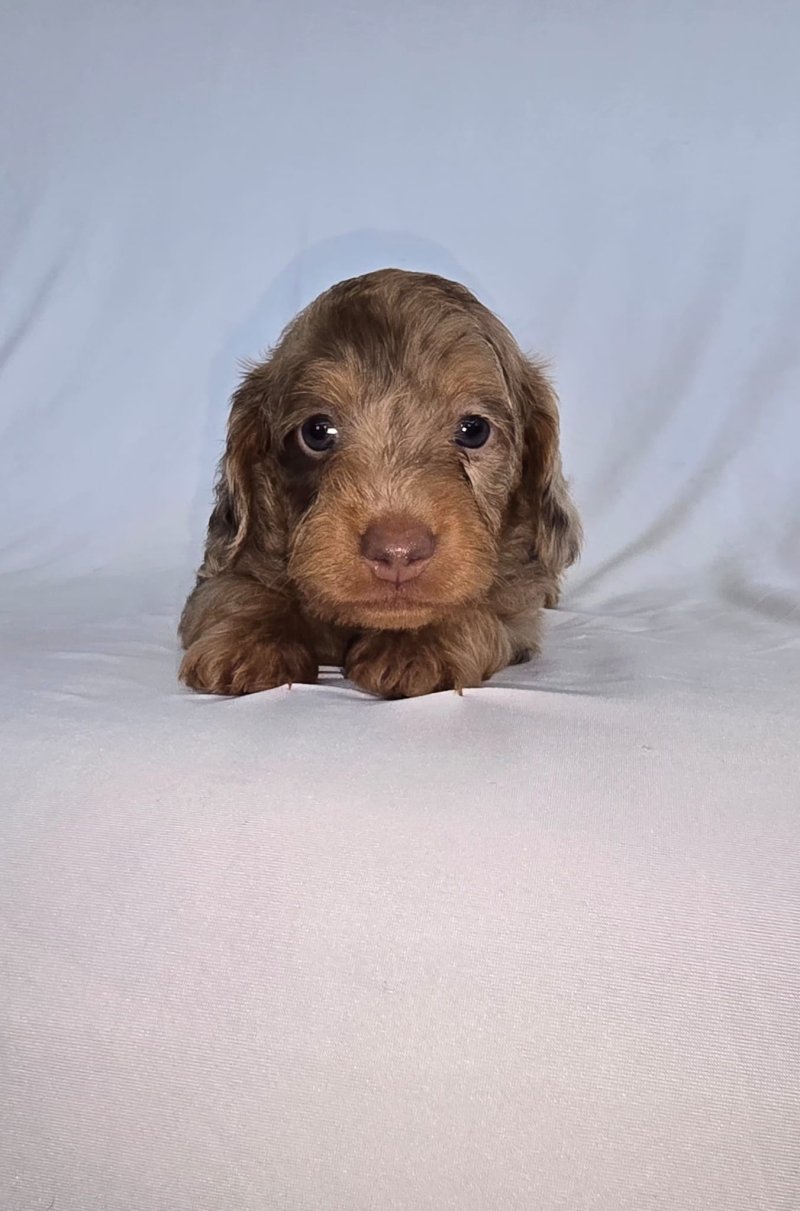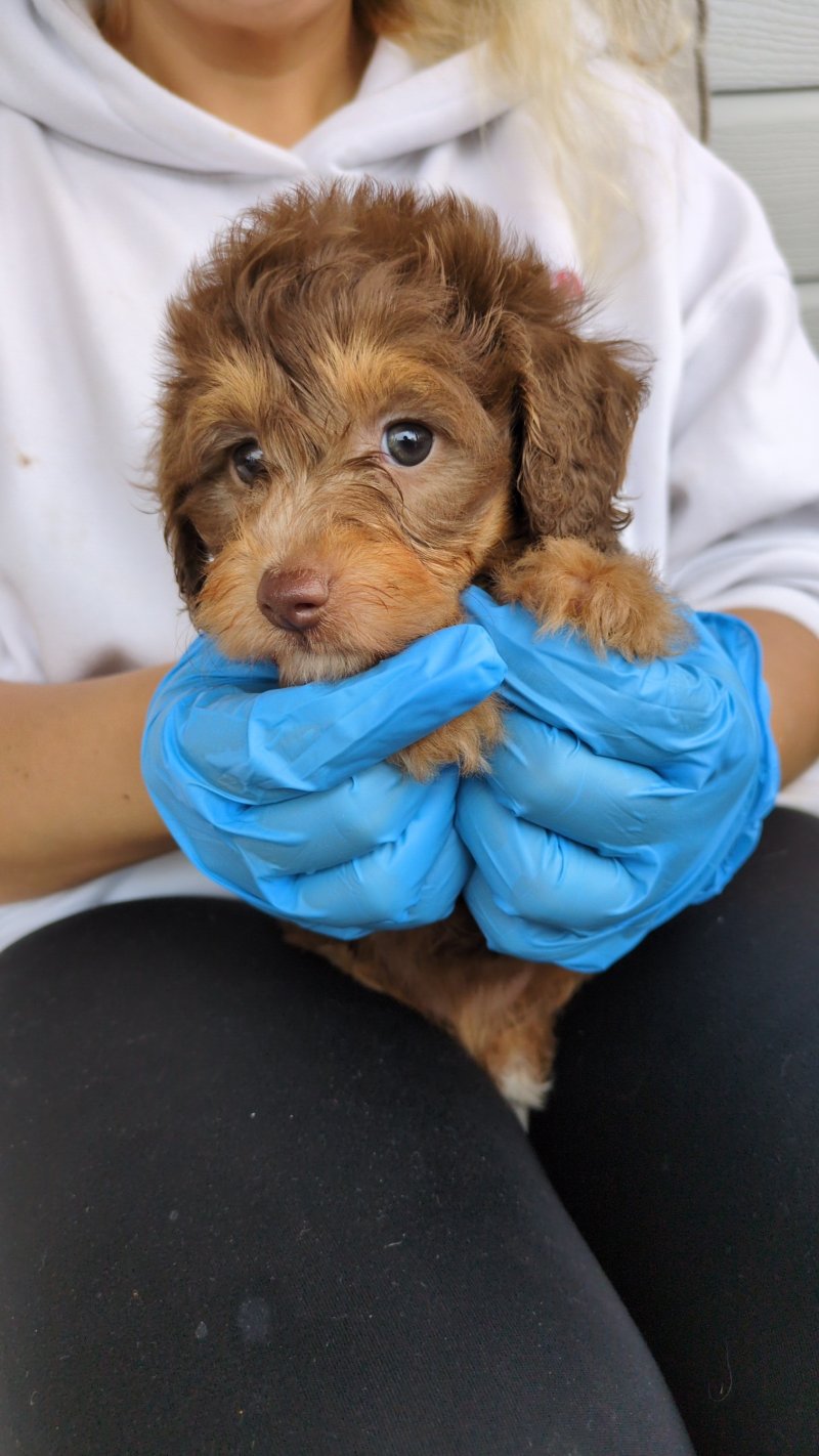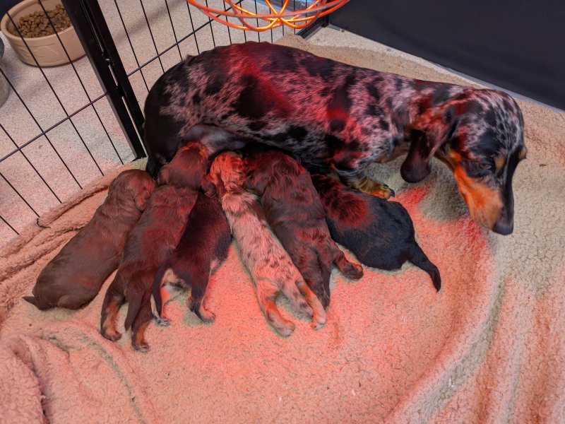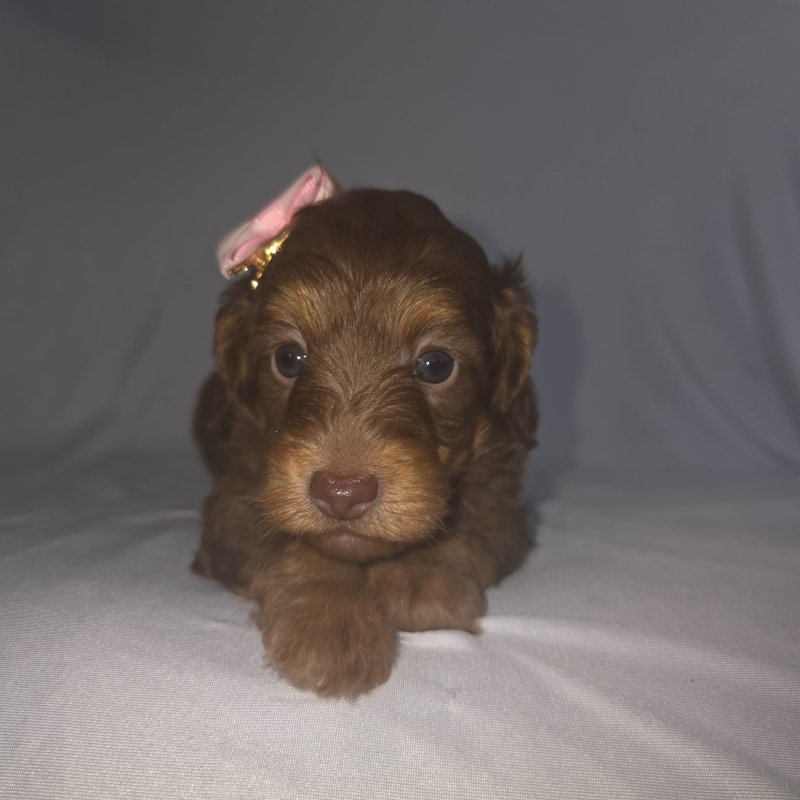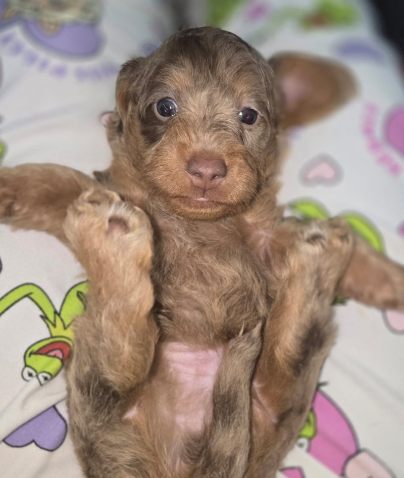 I would like to introduce our beautiful new litter of 6 doxiepoo puppies, mum is a silver dapple mini smooth dachshund , she is 2 years old and a family pet who o bred myself, dad is a carefully chosen red toy poodle stud, from a family home.