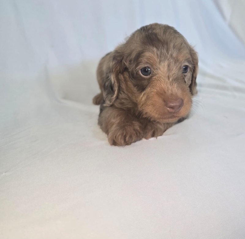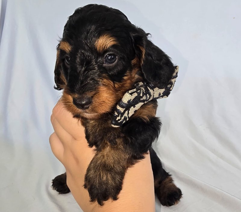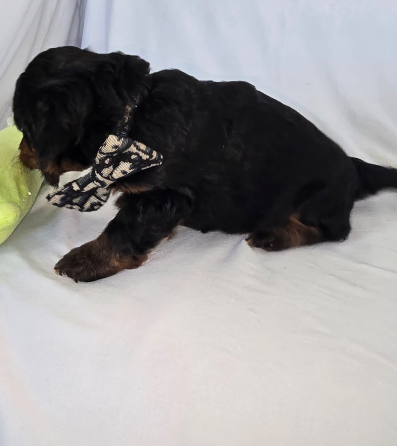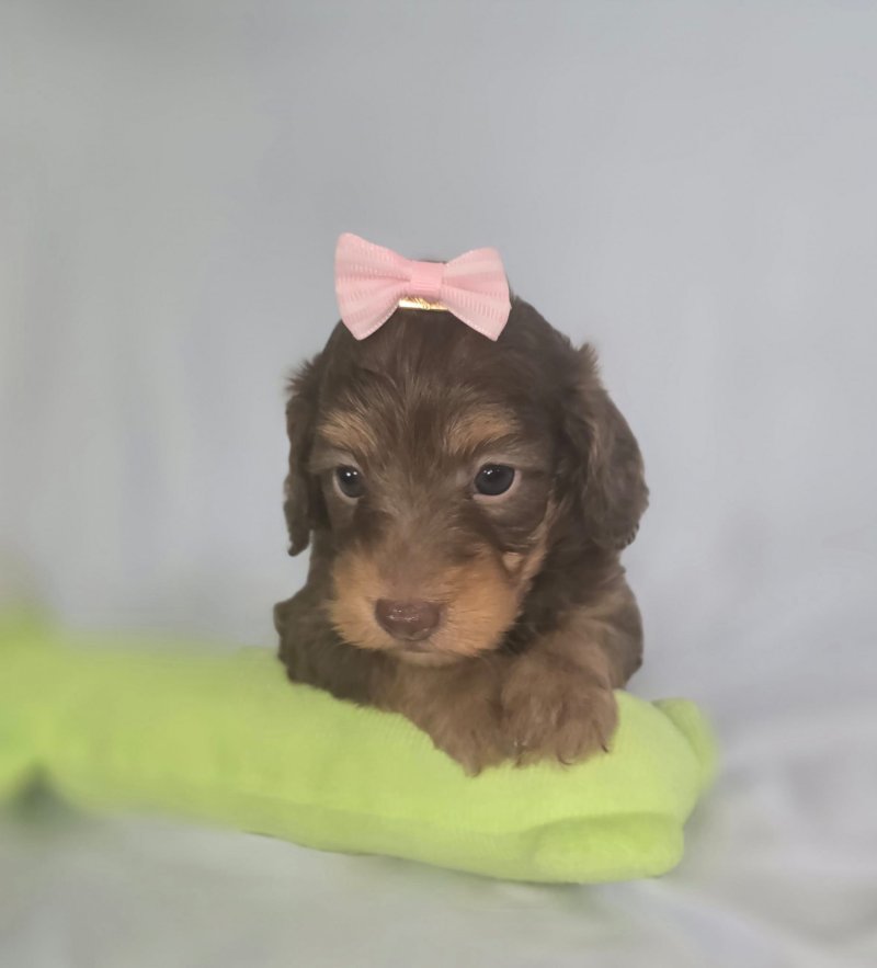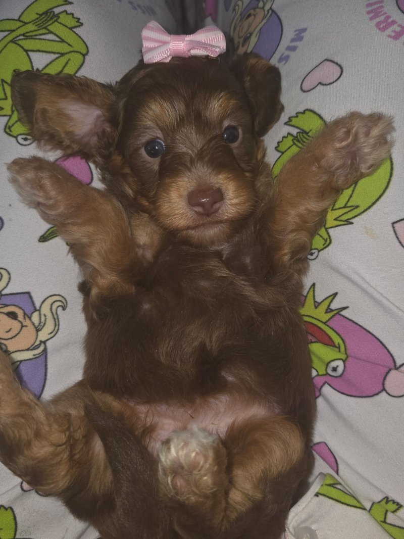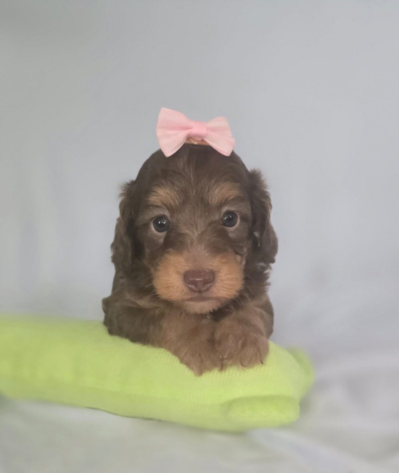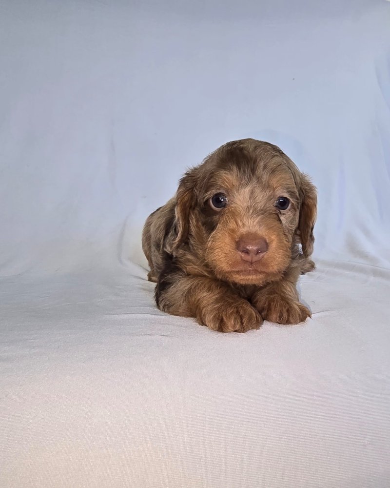 I would like to introduce our beautiful new litter of 6 doxiepoo puppies, mum is a silver dapple mini smooth dachshund , she is 2 years old and a family pet who o bred myself, dad is a carefully chosen red toy poodle stud, from a family home.