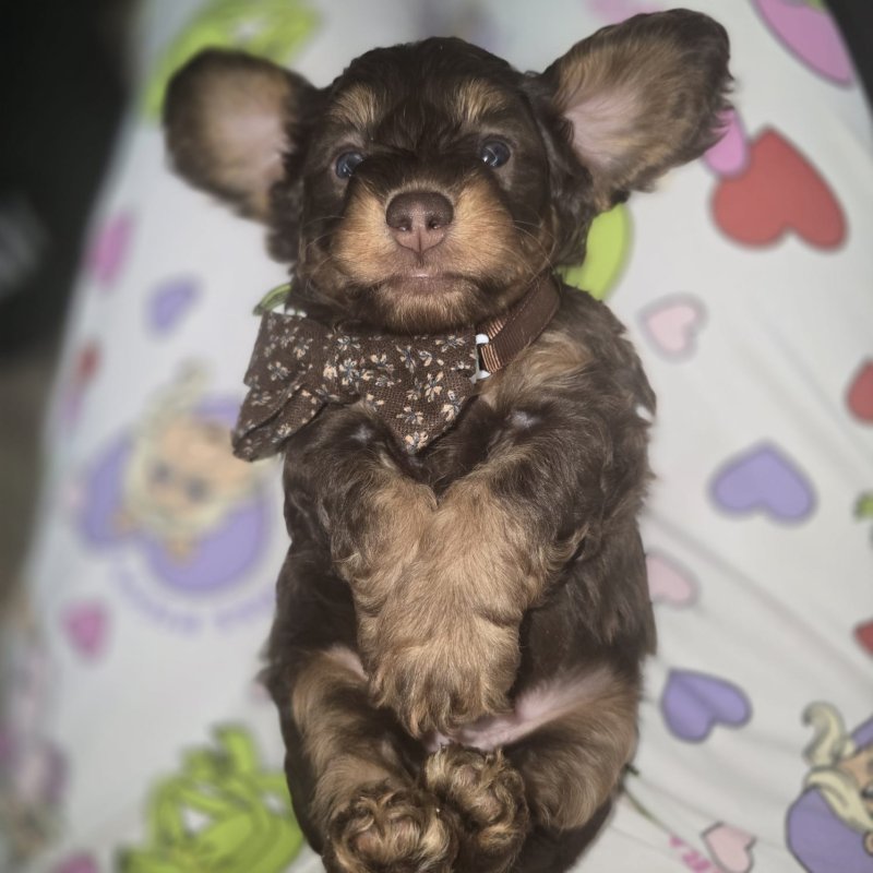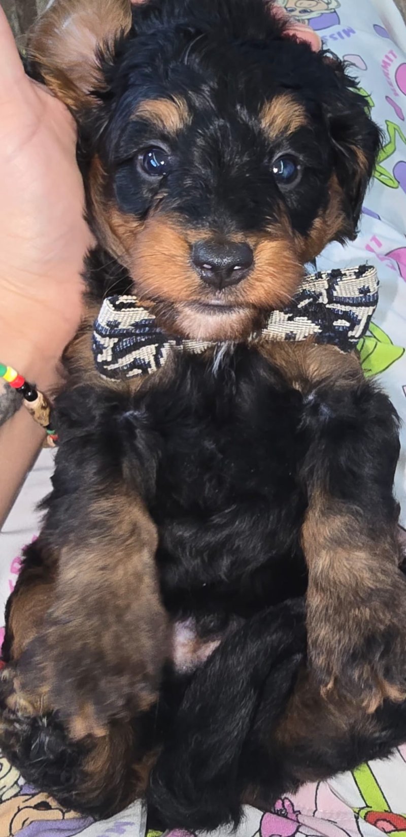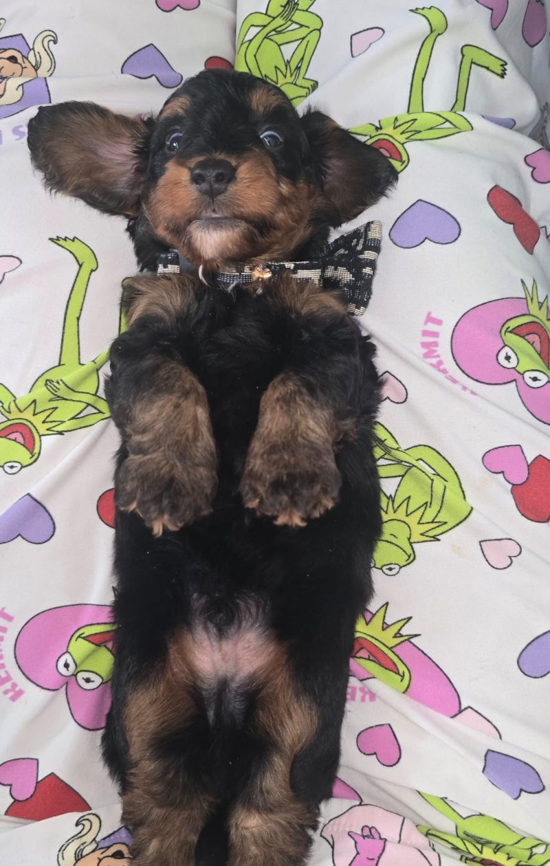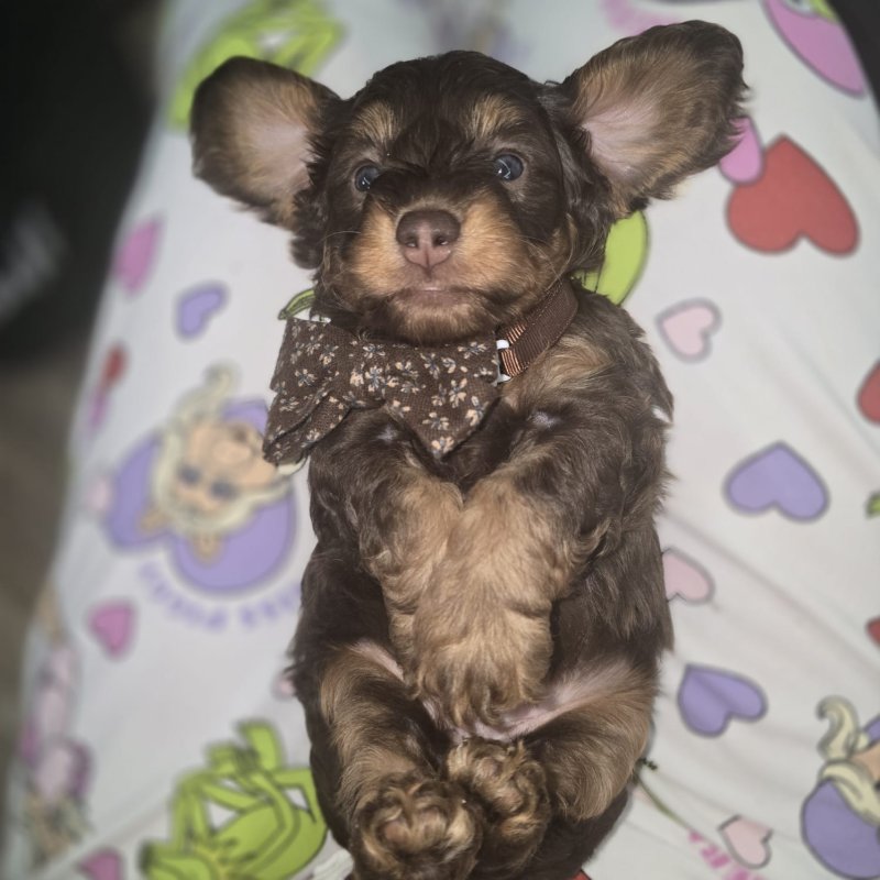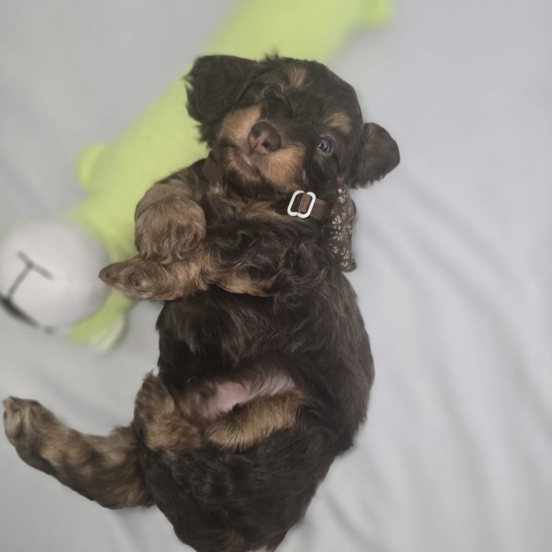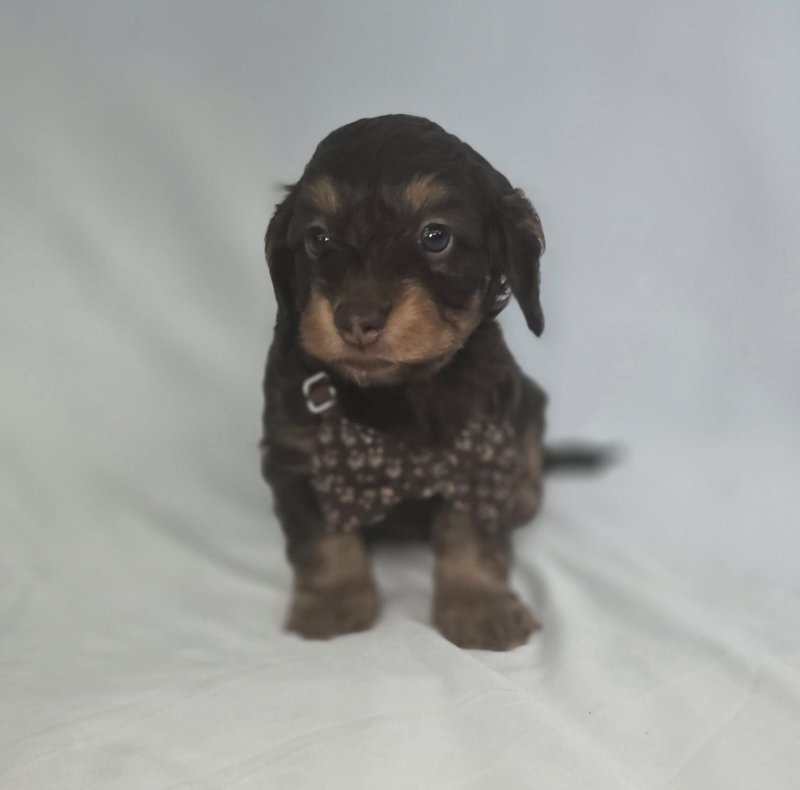 I would like to introduce our beautiful new litter of 6 doxiepoo puppies, mum is a silver dapple mini smooth dachshund , she is 2 years old and a family pet who o bred myself, dad is a carefully chosen red toy poodle stud, from a family home.