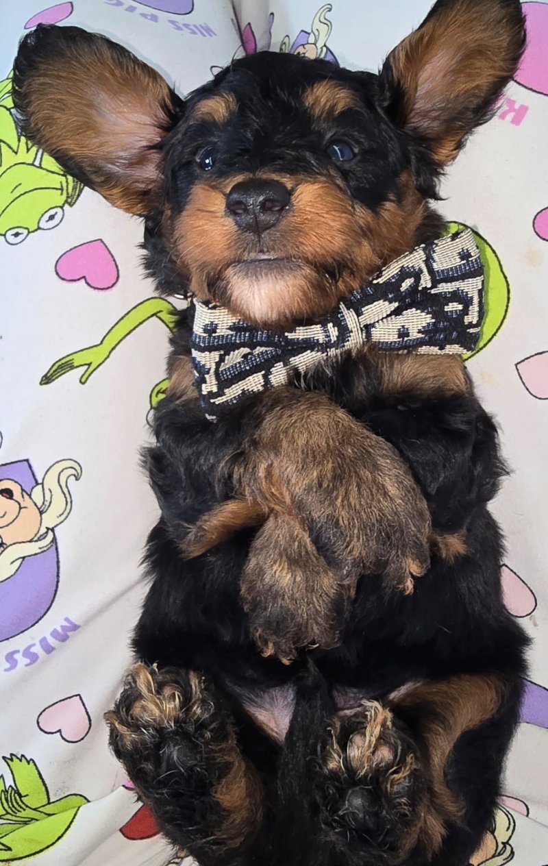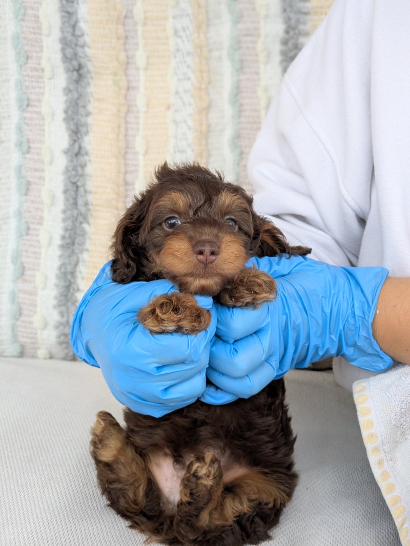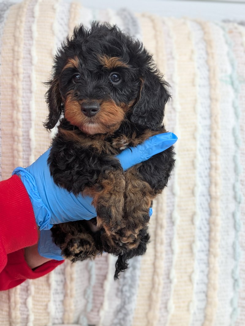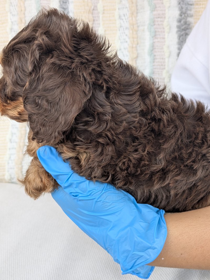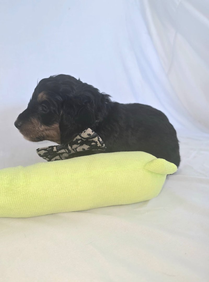 I would like to introduce our beautiful new litter of 6 doxiepoo puppies, mum is a silver dapple mini smooth dachshund , she is 2 years old and a family pet who o bred myself, dad is a carefully chosen red toy poodle stud, from a family home.