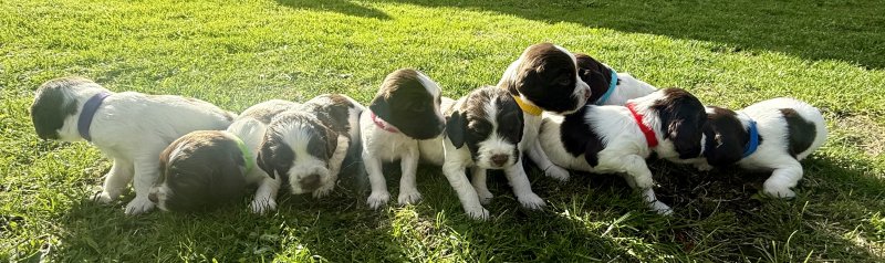 We currently have one beautiful male puppy and one female one available from our litter of nine. They are now 6 weeks old and already showing a wonderful temperament — calm, cuddly, and well-behaved. They are real sweethearts who would make the perfect family companions, while also having excellent bloodlines suited for beating and field trials. They are both showing interest in retrieving already.