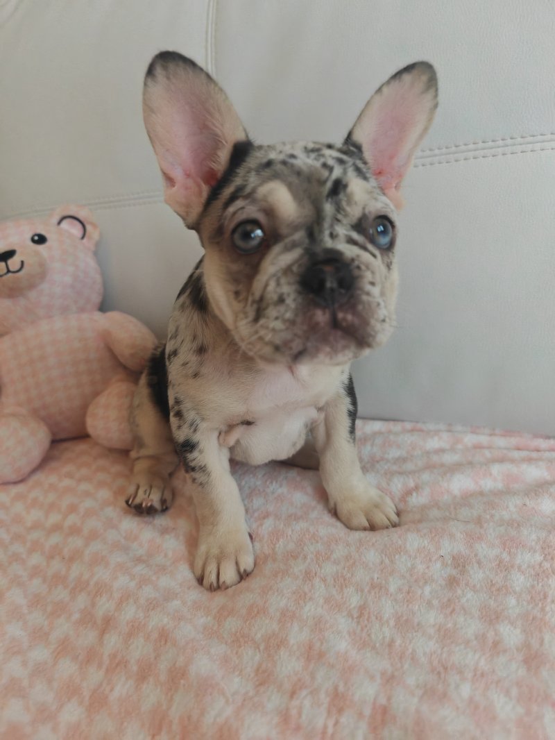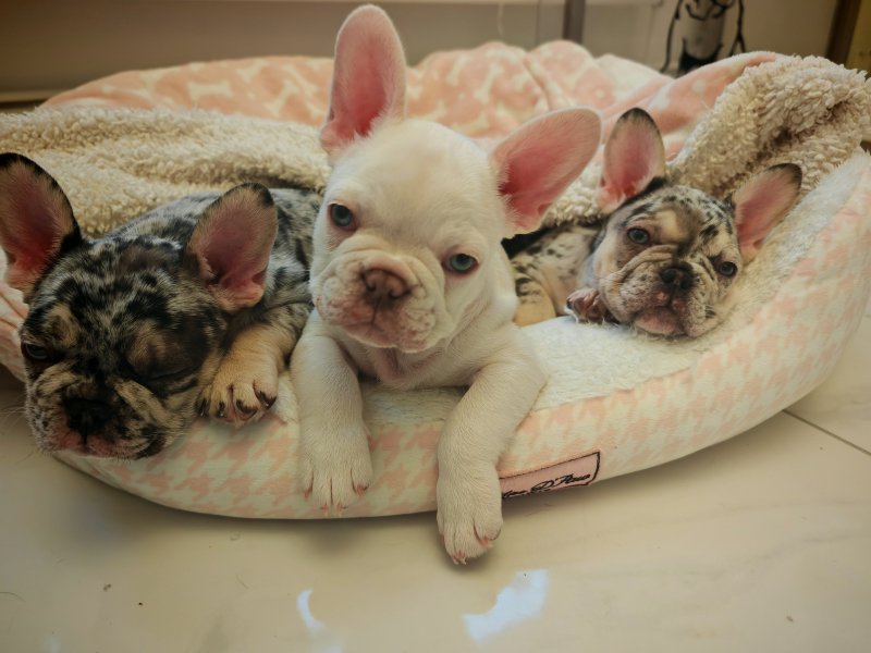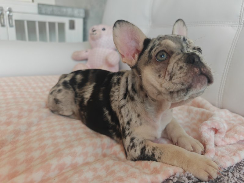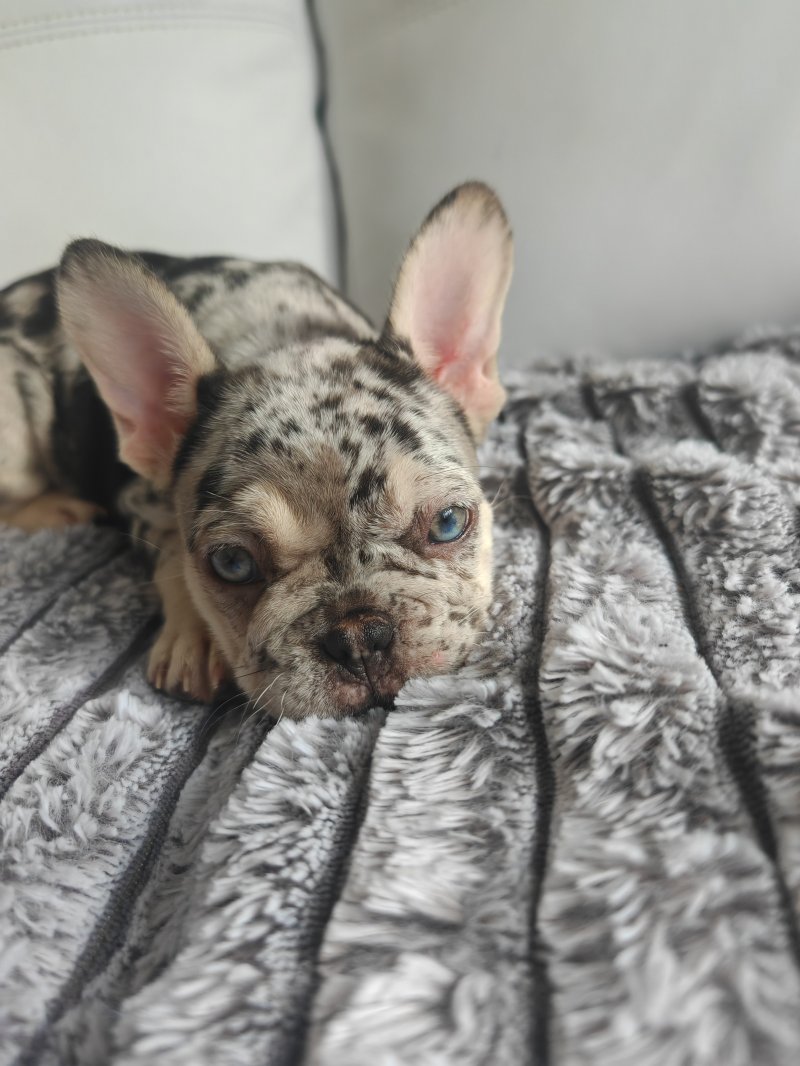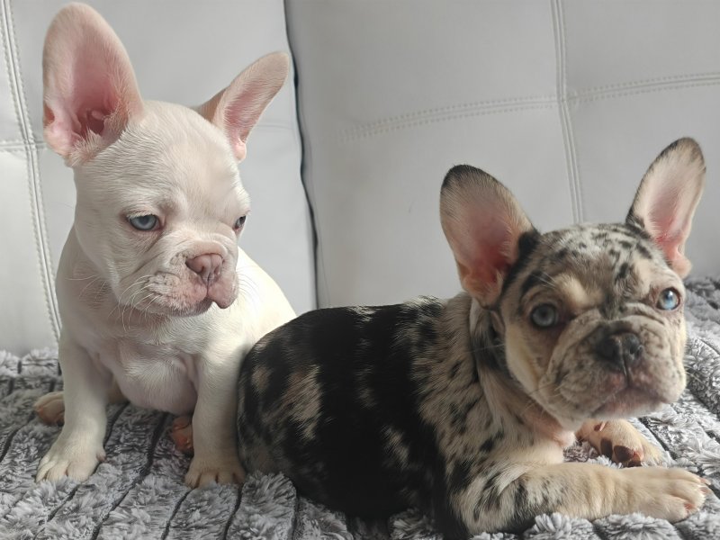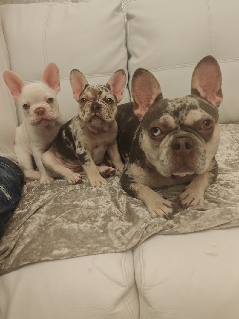 Here I have for sale the last 2 pups in my beautiful first litter of french bulldogs. These pups are absolutely gorgeous and have a great combination of colouring , with pixie and Orion being chocolate and lilac merle colouration with platinum and fawn shades and fawn socks, and moonshine being completely platinum. All dogs are KC registered, microchipped wormed flead and first vaccinations completed. They have been raised in a loving home with mum , and our other 10 month old male Frenchie . Mum was AI at the very best elite kennels , using a beautiful black and tan full fluffy stud. They are all on grain free kibble and are happily on their training of using puppy pads. We are looking for forever homes for our stunning little babies and hoping to find someone who can love them just as much as we do.