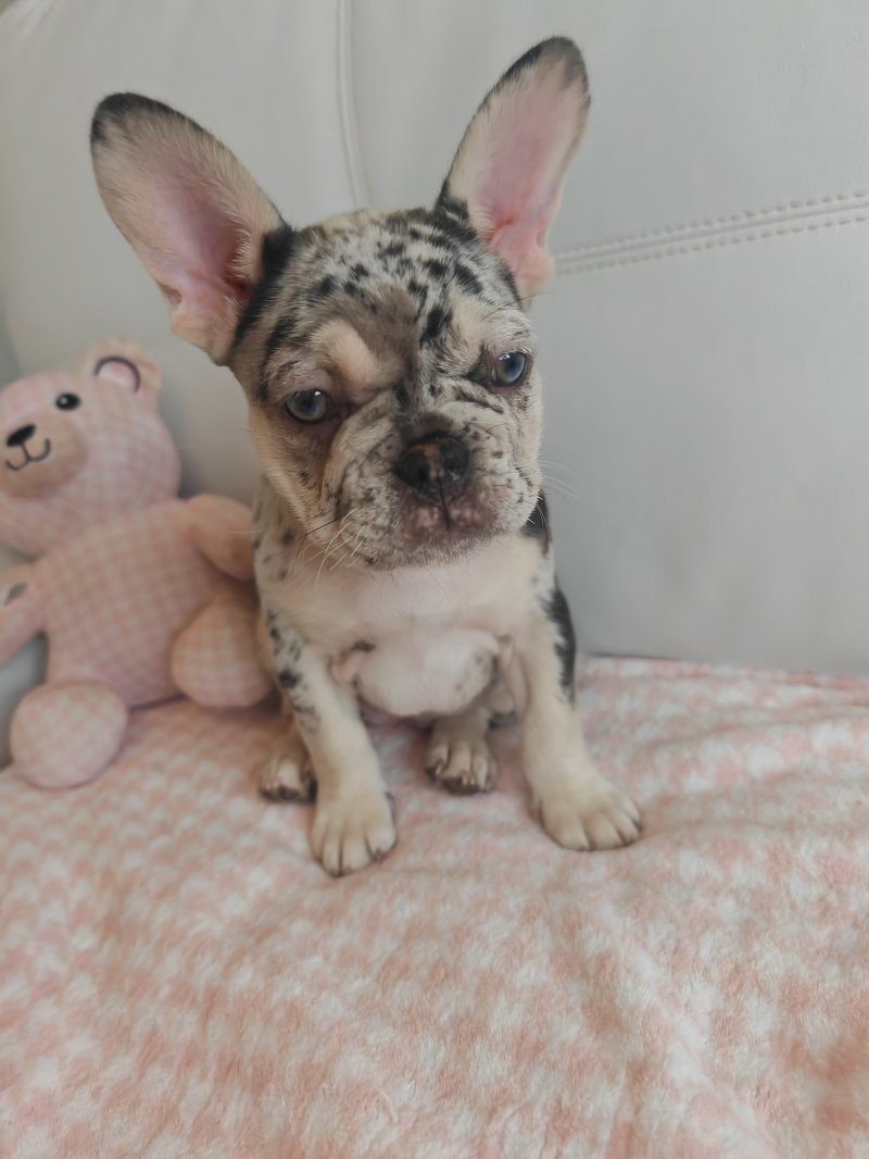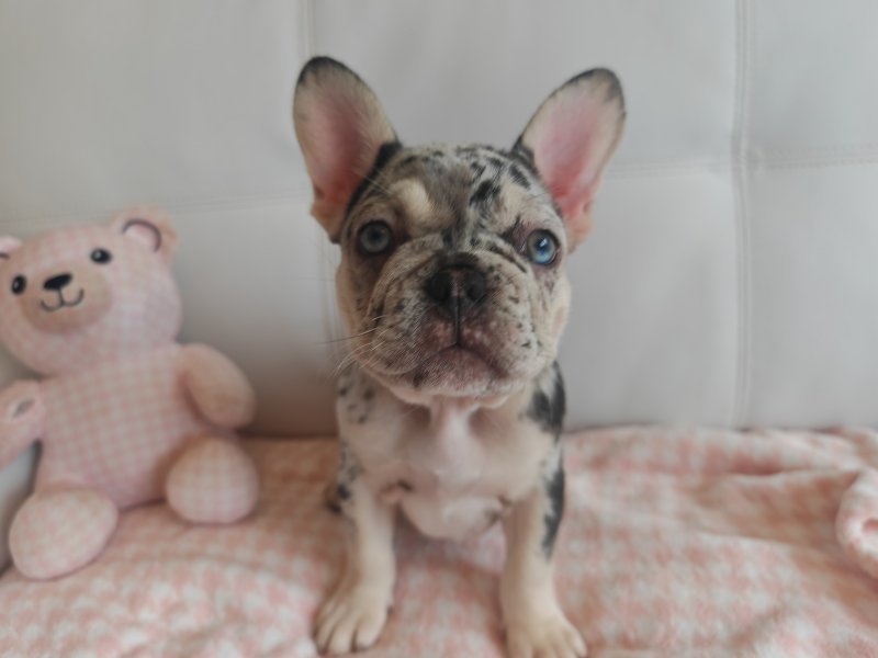 She is absolutely adorable and has a sassy side to her personality but also loves a snuggle , she loves to be wrapped up warm , and loves a good tug of war with her toys, she is a very intelligent little pup , she has rare eyes like her mum.