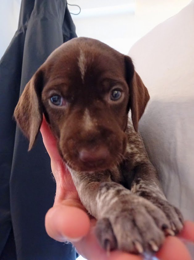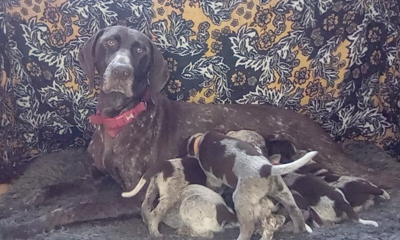 Mischew is 3 years old recently had her 1st litter (See photos of Dam). 7 Strong and healthy Liver white ticked and spotted GSP puppies. 3 Girls and 4 Boys almost 4 weeks old. Will be ready to go at 8 weeks old, 5 weeks time. Micro-chipped wormed and with 1st vaccinations.