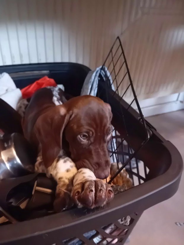 Mischew is 3 years old recently had her 1st litter (See photos of Dam). 7 Strong and healthy Liver white ticked and spotted GSP puppies. 3 Girls and 4 Boys almost now 6 weeks old. Micro-chipped wormed and with 1st vaccinations.