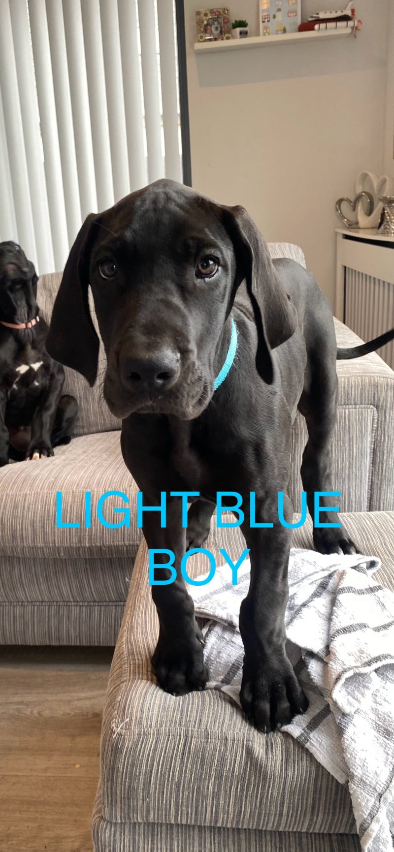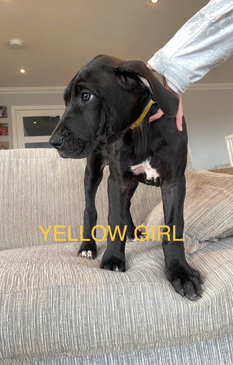 3 BOYS AND 3 GIRLS AVAILABLE NOW. Stunning litter of 8 Great Dane puppies ready for their new homes now. 5 boys and 3 girls. I own Mum Winnie (Lady Perignon) and she is a sweet, gentle stunning example of the breed in fawn. Dad Bruce the Mighty Blue is a striking Blue Great Dane very large and also a gentle and sweet Boy. Bruce was carefully chosen to match Winnies gentle temperament to provide a litter of sweet natured, loving puppies. They have been raised in the home surrounded by children and my other family dogs and are very much used to the bustle of family life, with lots of cuddles and love.