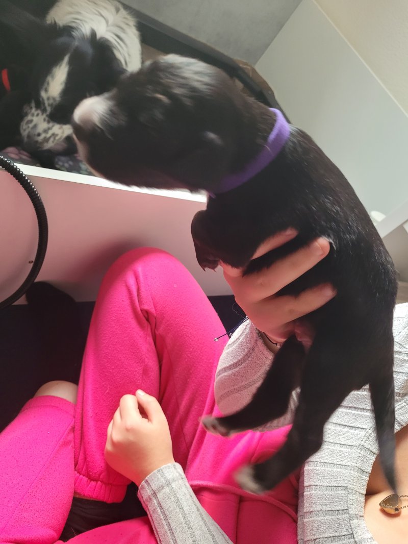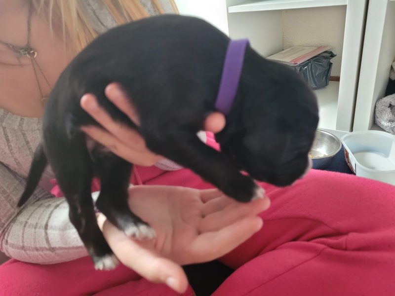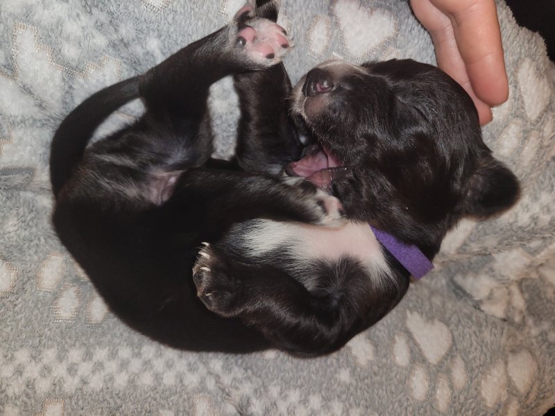 Boy 1 : mainly back (purple collar). One of the quieter ones of the litter. Very cuddly and loving.