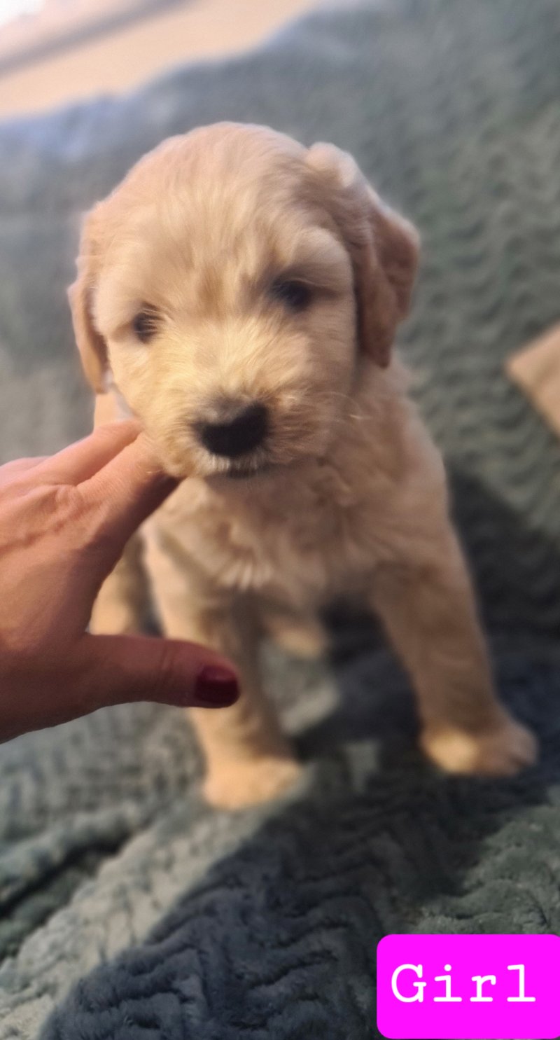 πGreen Collar Girl: Meet our gorgeous **Light Golden Labradoodle girl** with the sweetest **Apricot-tipped ears** — a truly special little lady inside and out! πΎ **About Her:** This girl has a **super loving and caring nature**. She’s gentle, calm, and always ready to share affection. She’s also beautifully social — loves to play with her littermates and often steps in to **settle or comfort the others**, showing her naturally nurturing side. π **Personality Highlights:** * Exceptionally **calm and kind-hearted** * **Loves cuddles** and gentle interaction * **Plays well** with other puppies and people * Naturally **caring and affectionate**