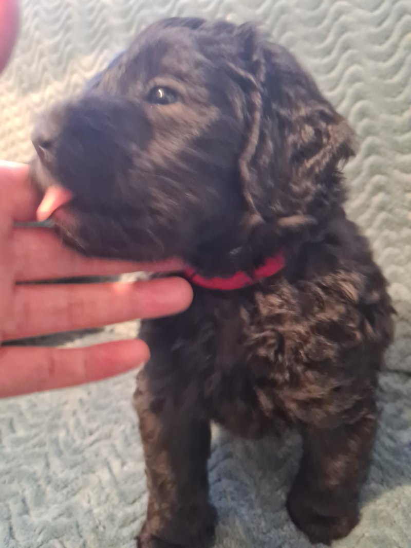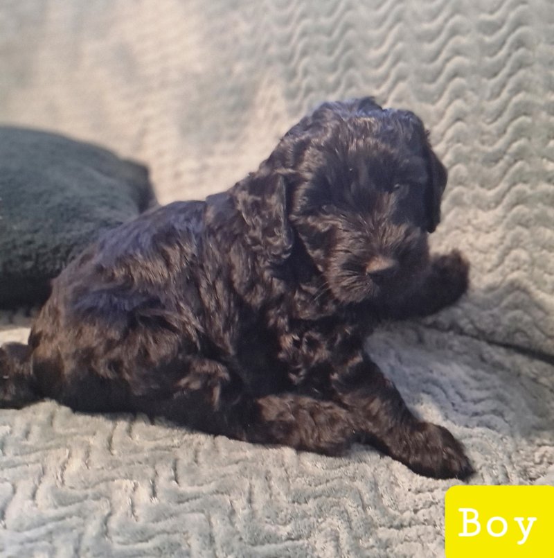 πMeet our **Blue Collar Boy**, a stunning **black Tiny/Mini Labradoodle** with a distinctive **silver chin stripe**. He’s the **biggest of the litter**, but his personality is all **gentle and loving**, making him a calm and easy-going companion. πΎ **Personality Highlights:** * **Placid and gentle** — a calm, loving nature that makes him a perfect family companion * **Very affectionate and friendly** — loves cuddles and human interaction * **Easy-going and confident** — relaxed with his siblings and people alike π¨ **Colour:** Black with a **silver chin stripe** πΆ