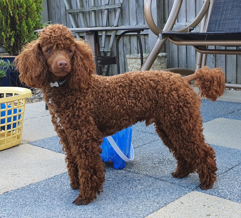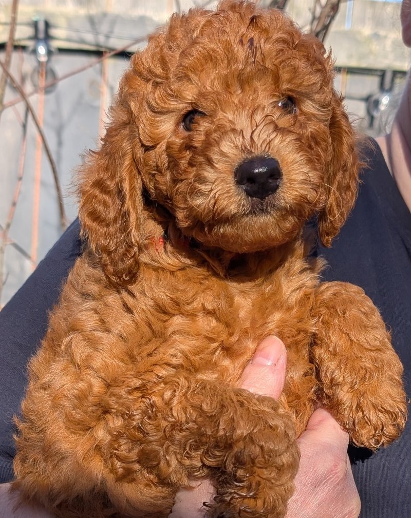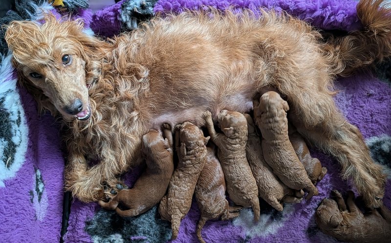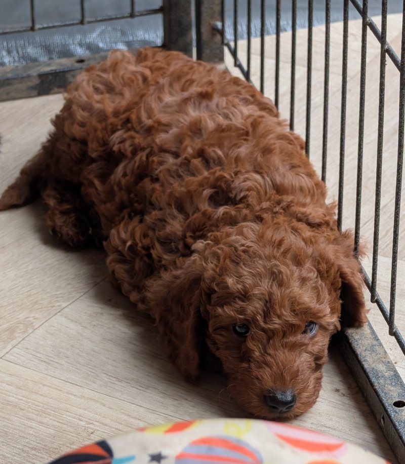 The litter includes 6 boys and 3 girls, all with soft, wavy or curly coats in a deep red colour. As adults, they will weigh around 10kg, have low-shedding coats that are simple to maintain, and be athletic and easy to train. They will enjoy swimming and outdoor activities in any weather, or relaxing with children on the sofa.