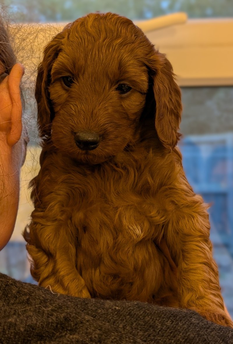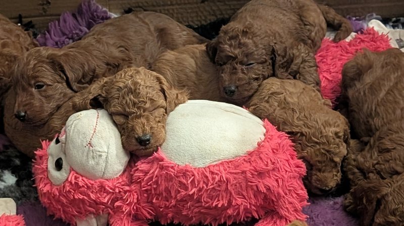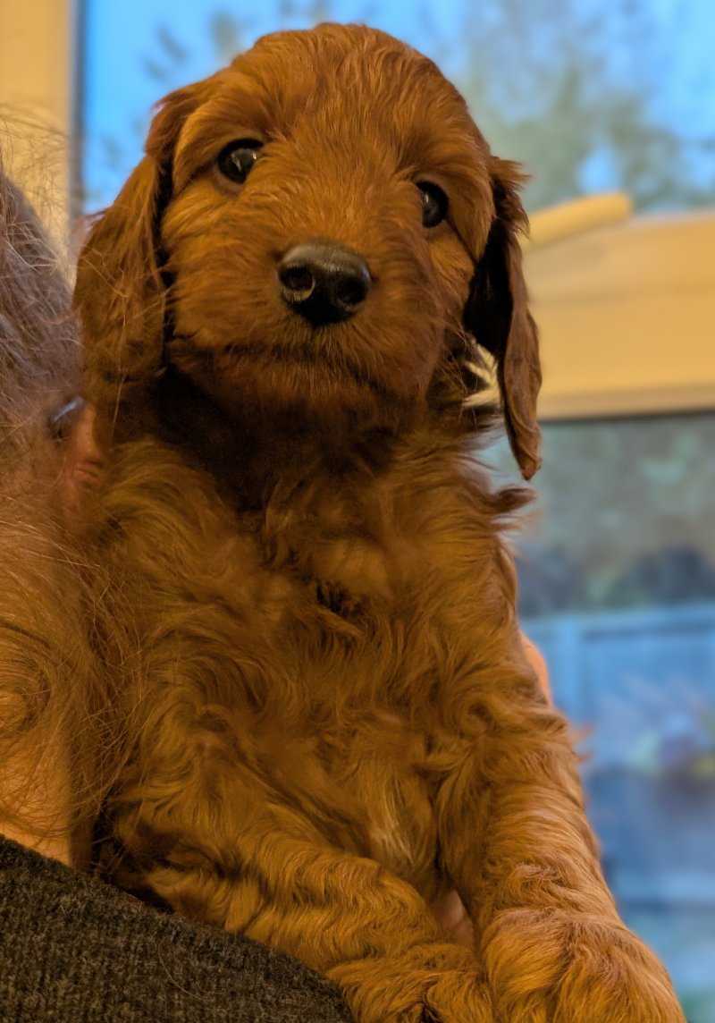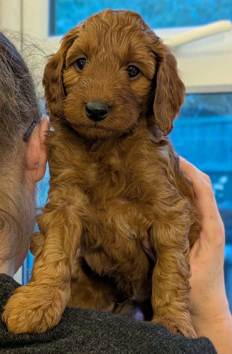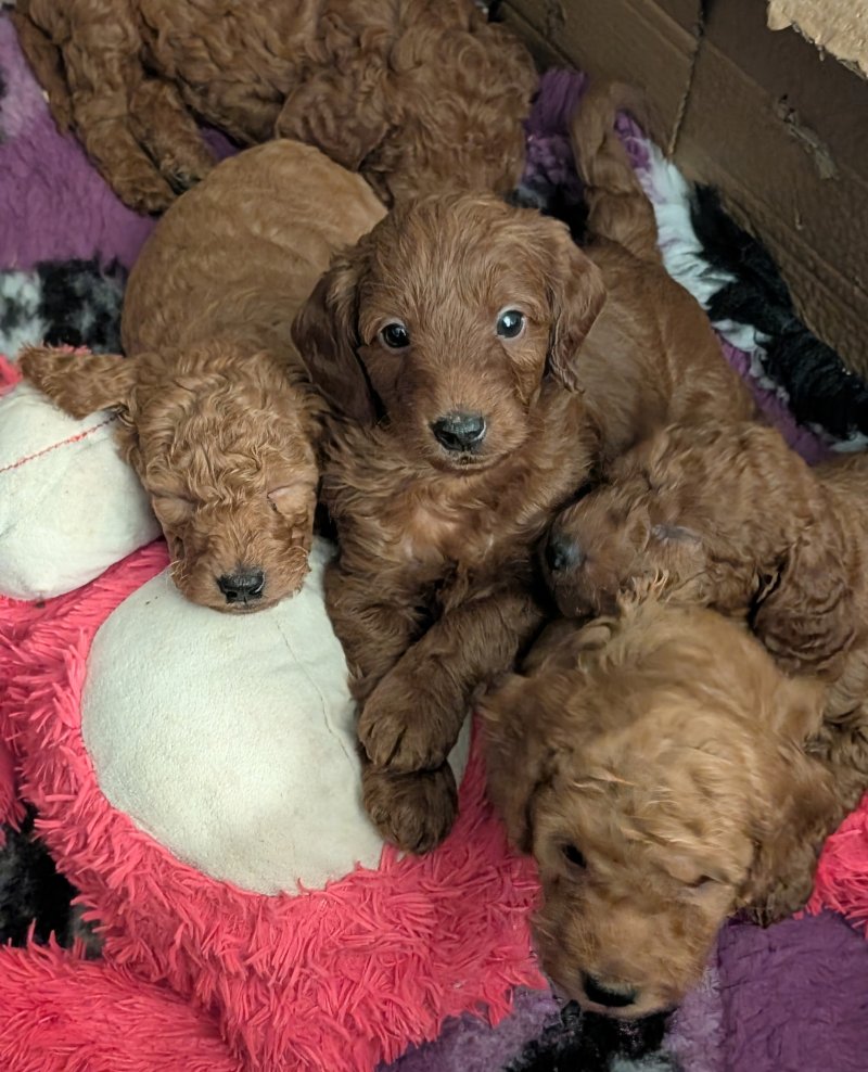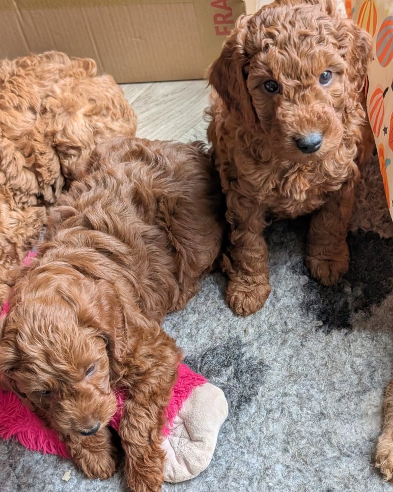 Meet our litter of F1bb red Miniature Labradoodle puppies, born on 21st August in our family home.