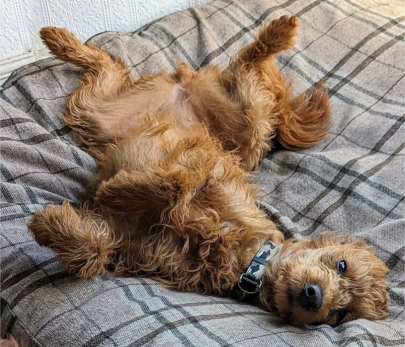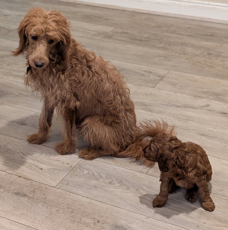 Mum – Rosie: Our F1b Miniature Labradoodle, with UK Kennel Club registered purebred Poodles and Labradors in her line. She has been tested clear for over 200 inheritable conditions, including PRA-PRCd and Von Willebrand's Disease.