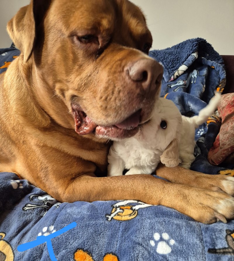 The puppies have been socialised with adults and children. They are used to living with a large breed dog due to having a Dogue de Bordeaux in the home.