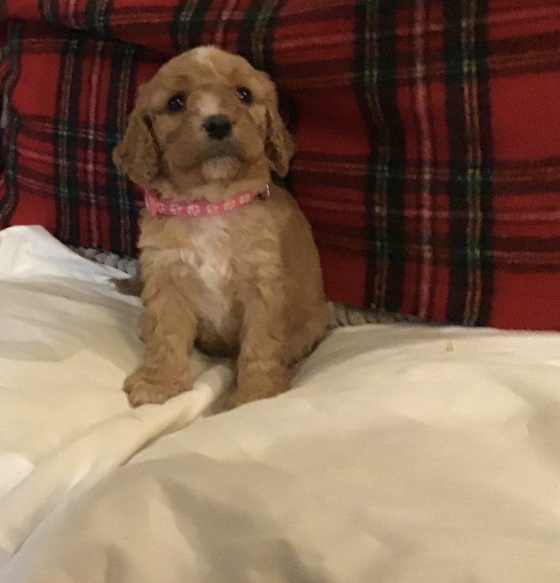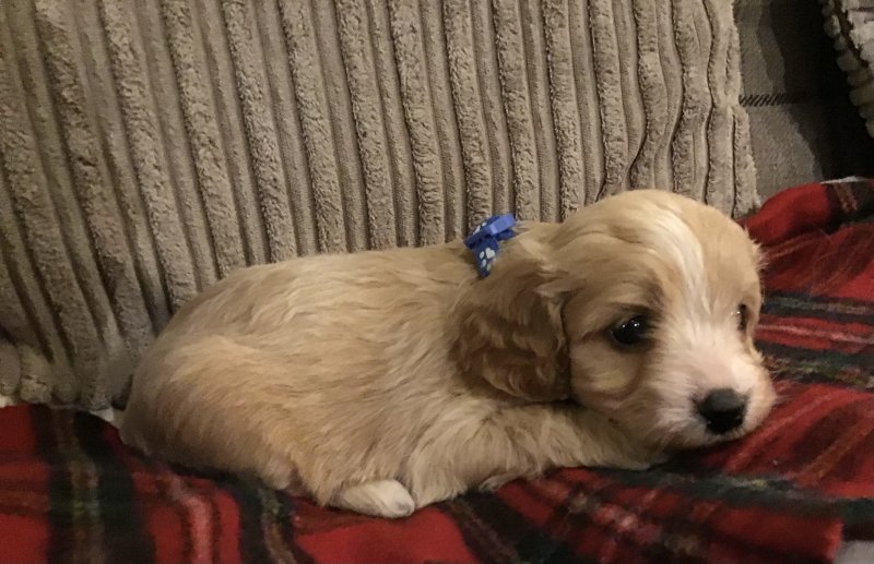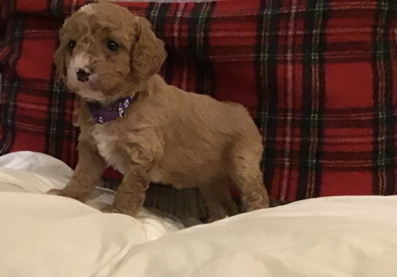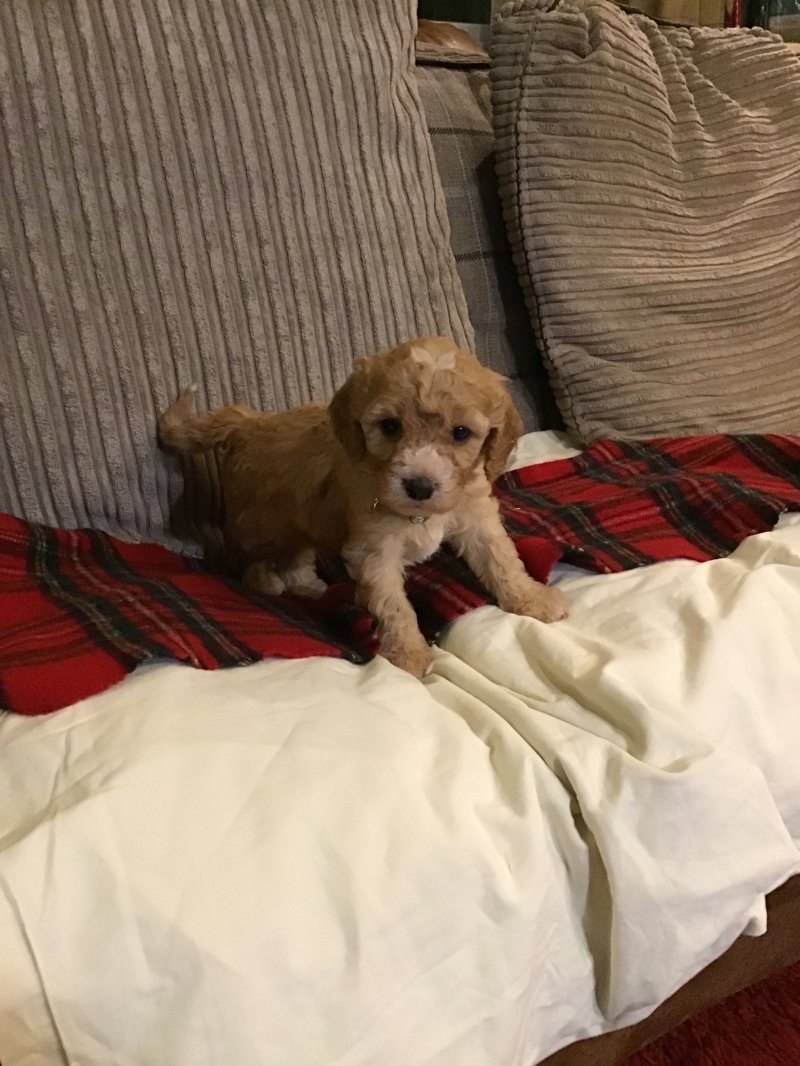 Here I have just born 9 gorgeous Cavapoochon puppies boys and girls available red/ apricot and white and cream. Mum is our pride and joy red poodle and dad is a very handsome cavachon! They will be brought up in the house and nertured with the best care and attention. They will be handled daily and used to household noises and children by the time they go .