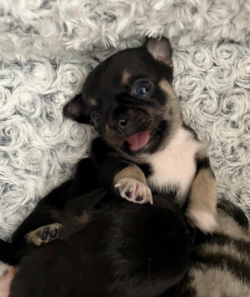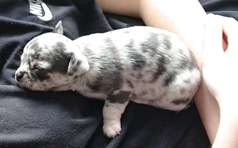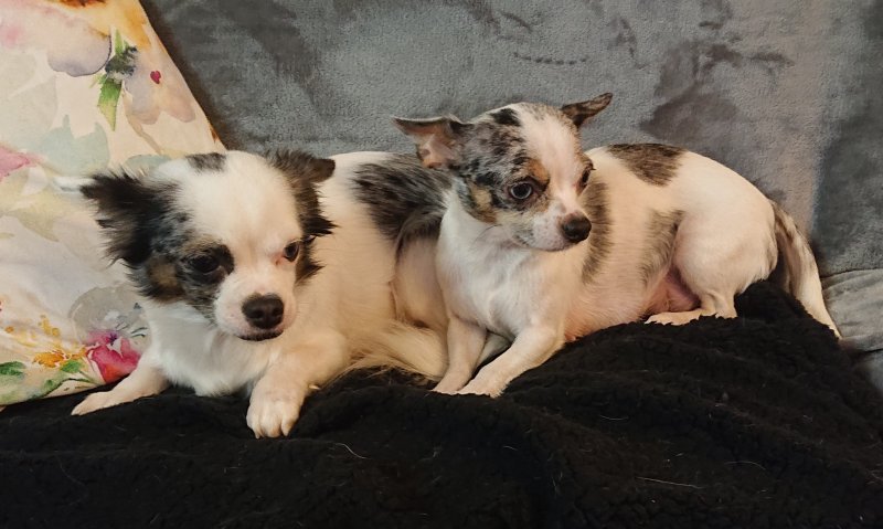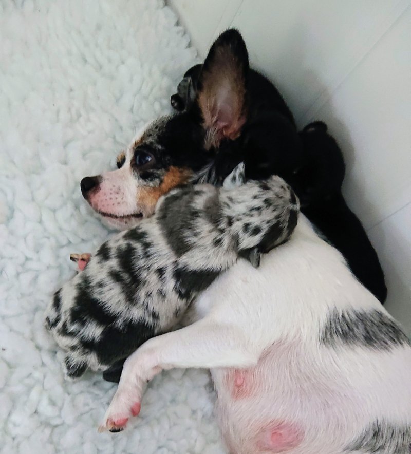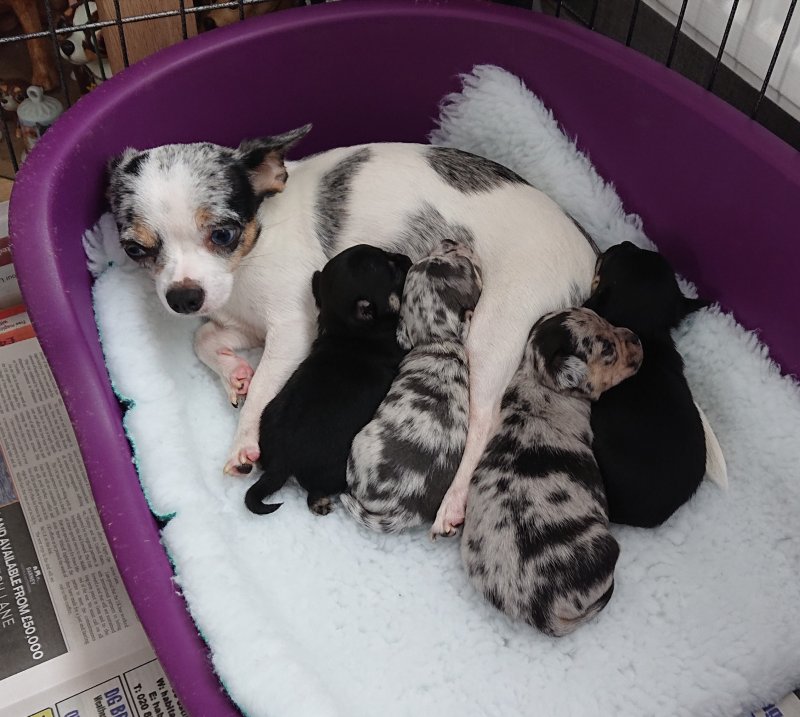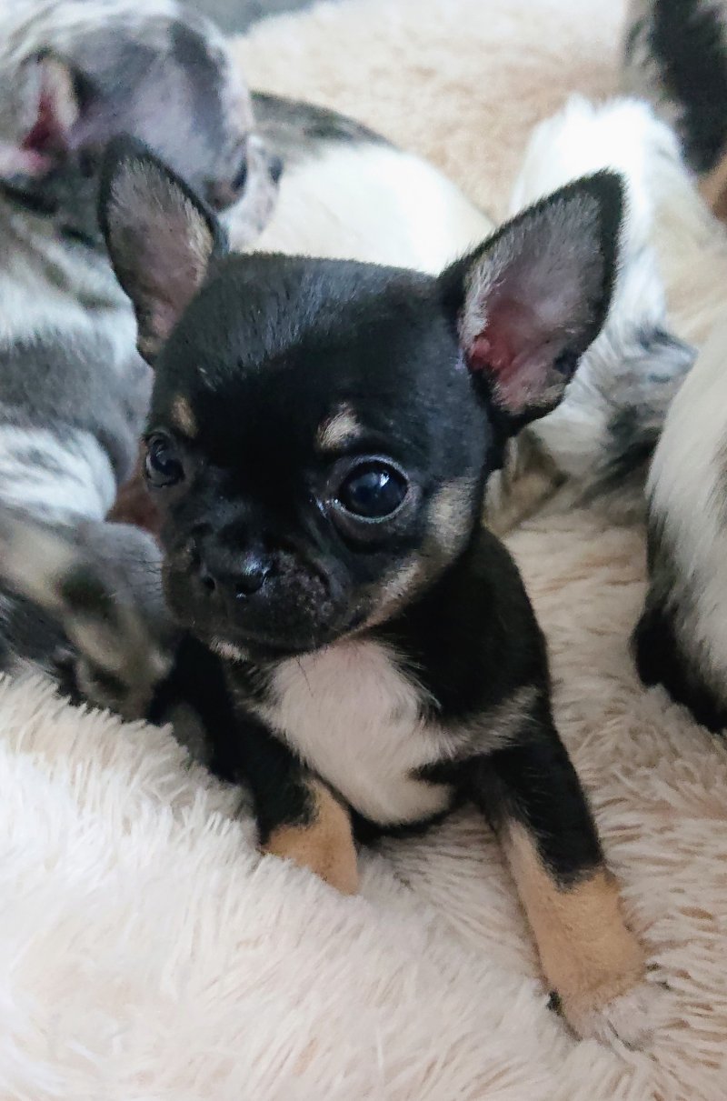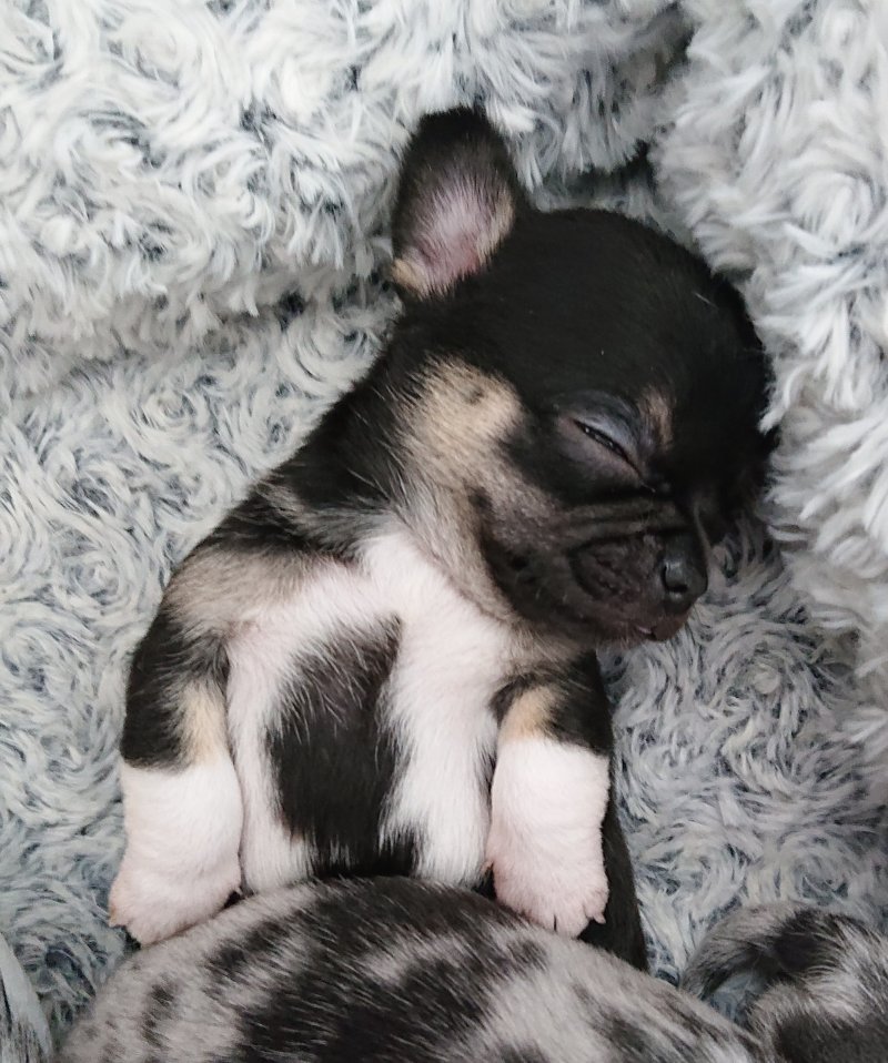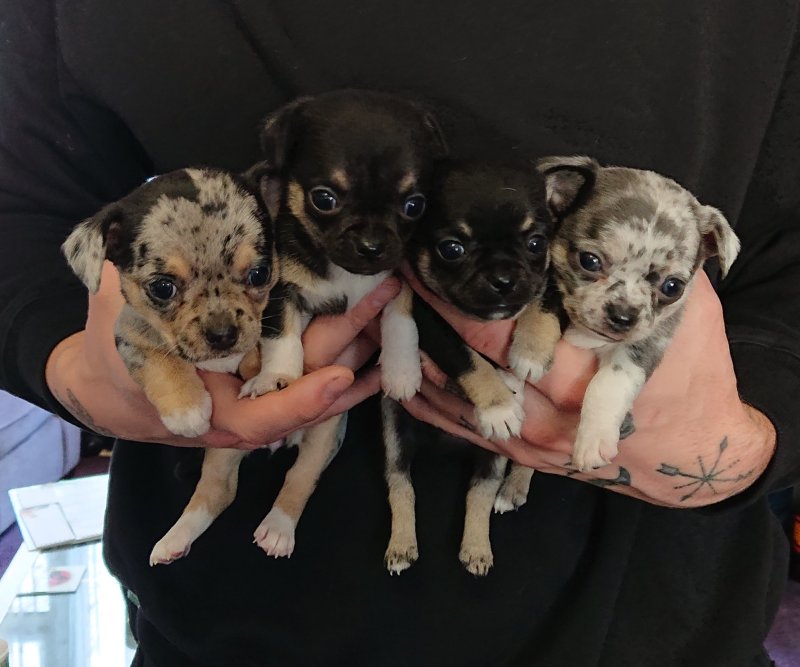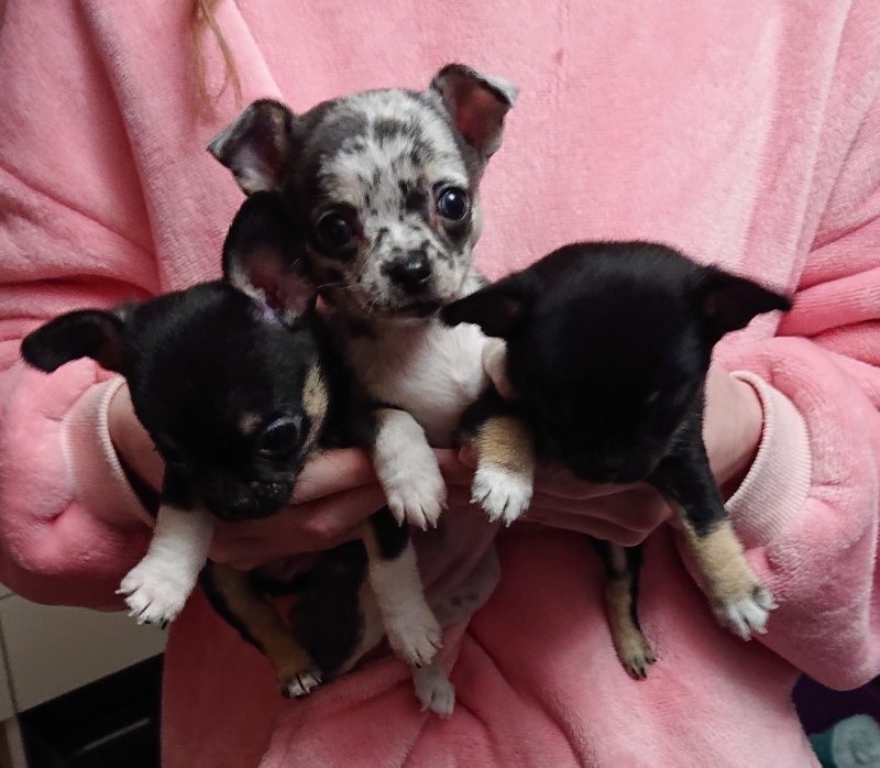 We have one absolutely adorable tiny black tricolour boy, a cheeky loving and playful little lad with an irresistible face, he is great fun. Also a black tricolour girl, she is a real sweetheart, super friendly, inquisitive, playful and loving, and of a daintier build than her brother. Finally an absolutely stunningly marked blue merle girl, she is very Chihuahua looking with a lovely apple head and short muzzle, she loves to snuggle, her colour and markings are amazing. All puppies are short hair.