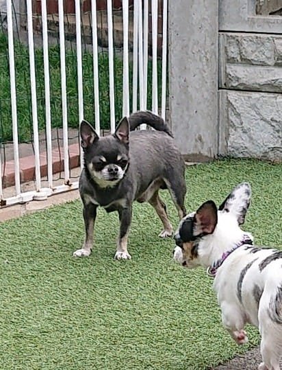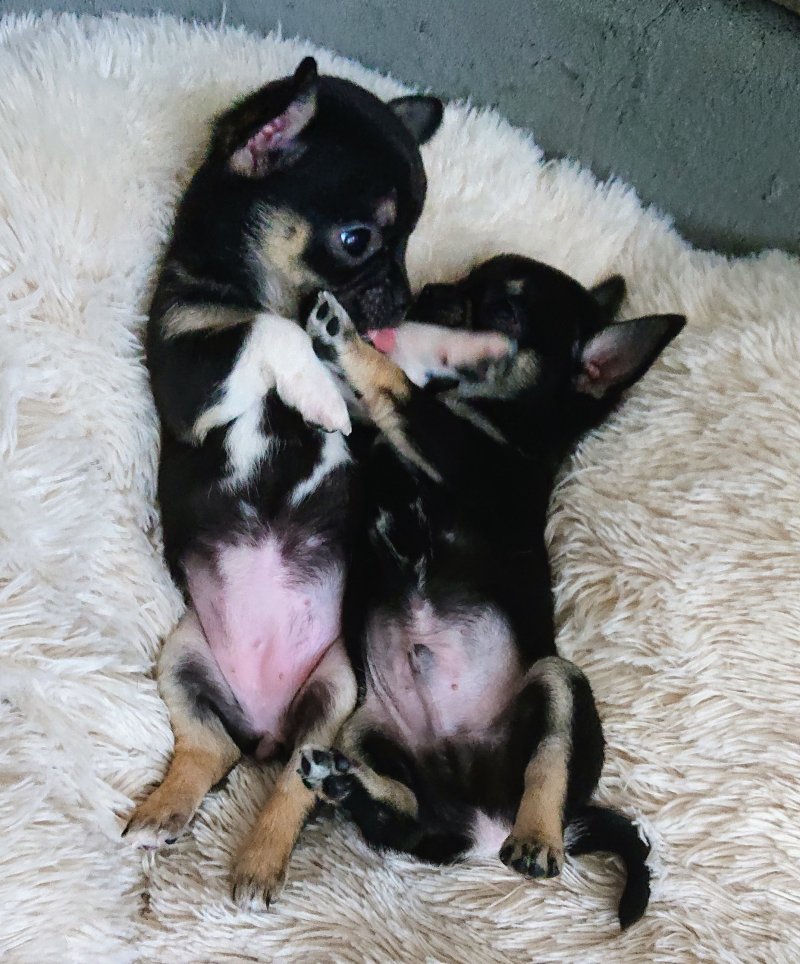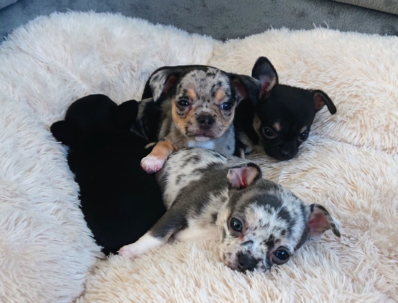 We have 4 generations of our own breeding line here, including mum's full sister, their mum (½ chihuahua ½ Frenchie), their dad (full chihuahua) their grandmother (full Frenchie), and their grandfather (full chihuahua). Photos at the end of the pictures are of mum with dad, mum and her sister, their parents, and the French bulldog who is the the great grandmother of the pups.