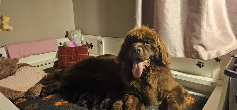 Mum is our lovely girl Zara, who is 5 years old brown Newfoundland this is her first litter, she given birth natural and she is an outstanding mum.She is a beautiful, very calm girl obedient and clever lady who loves walks, car rides, chilling with us and with all her siblings, well socialised with other dogs and cats.